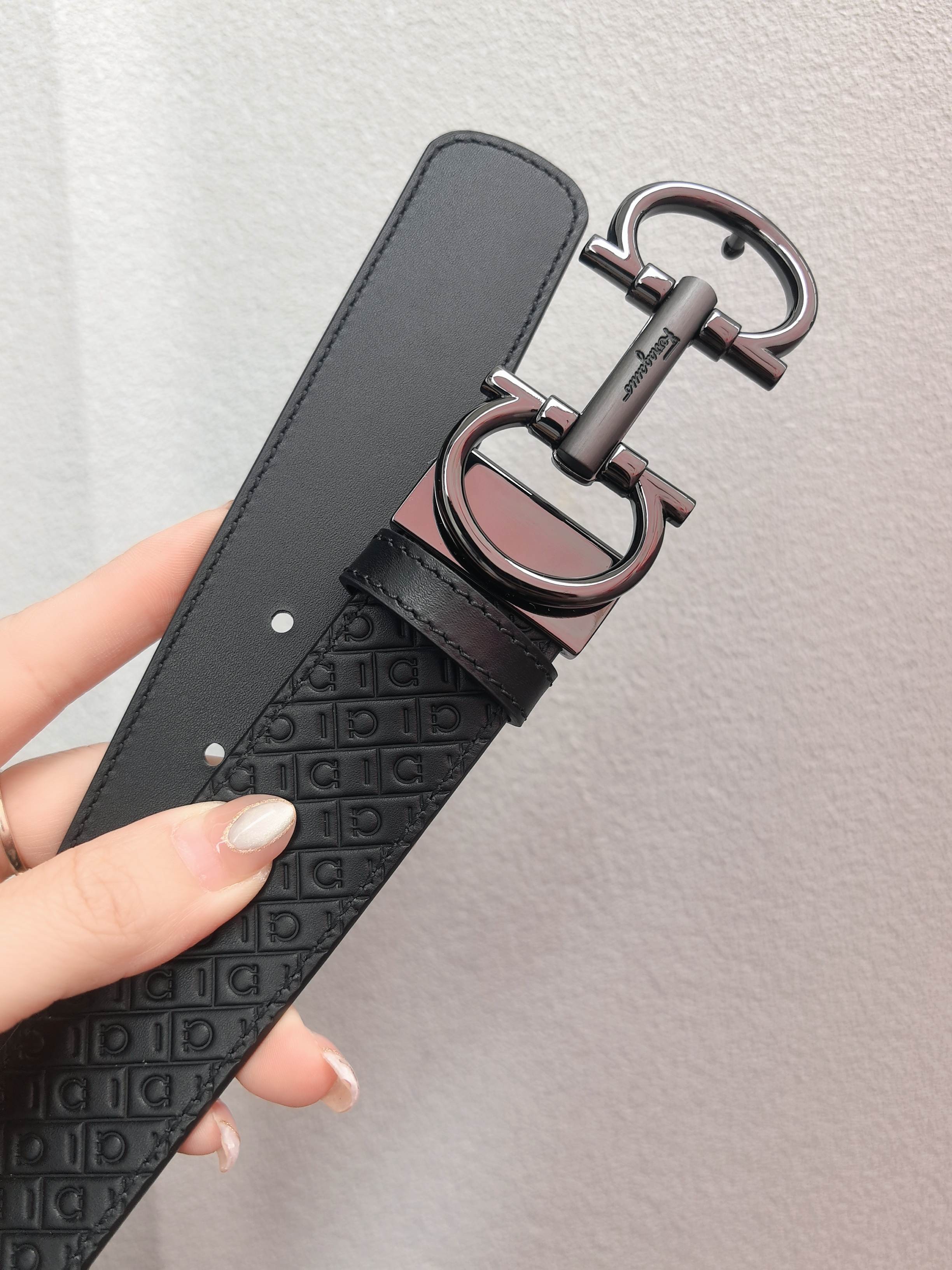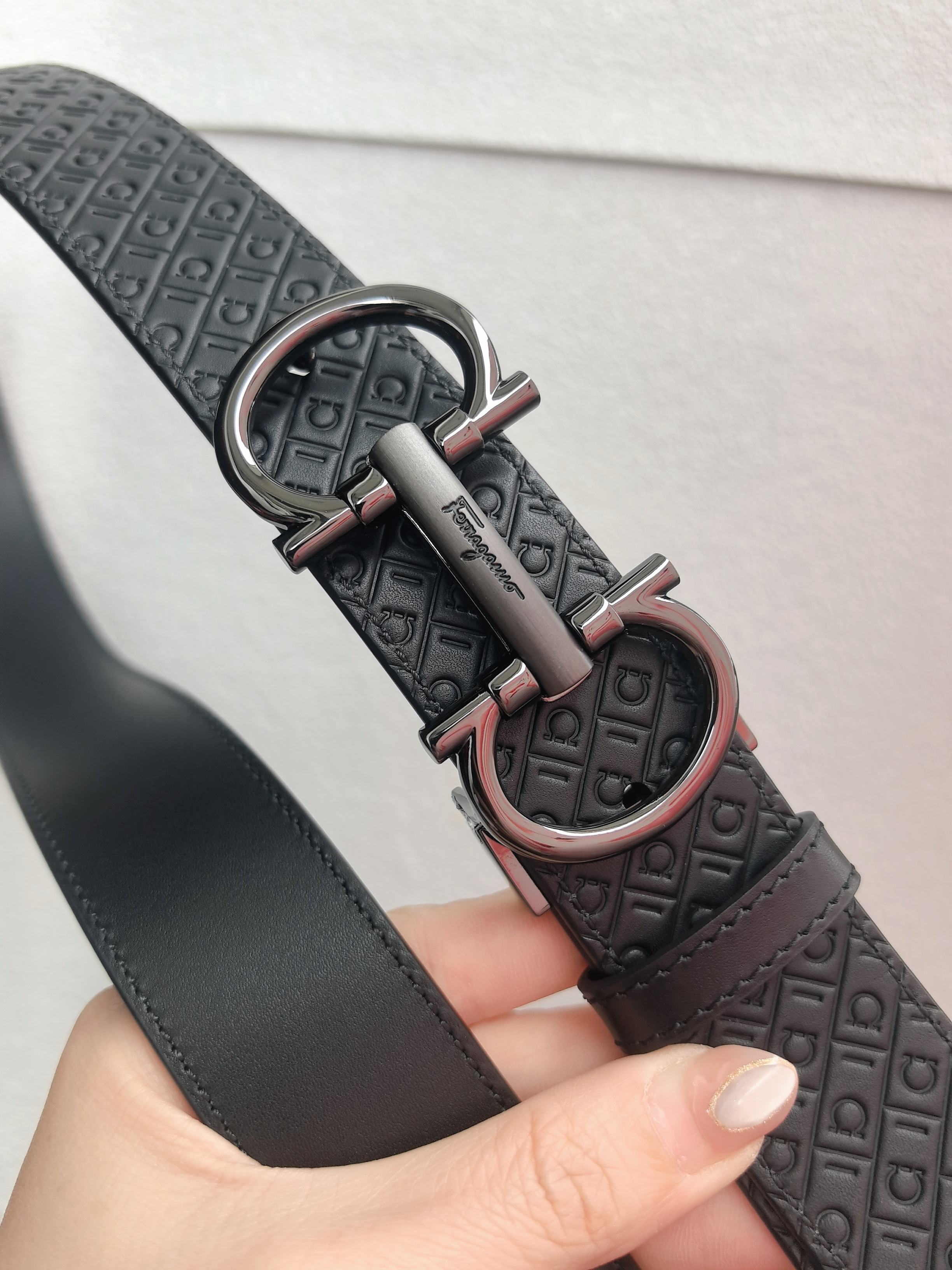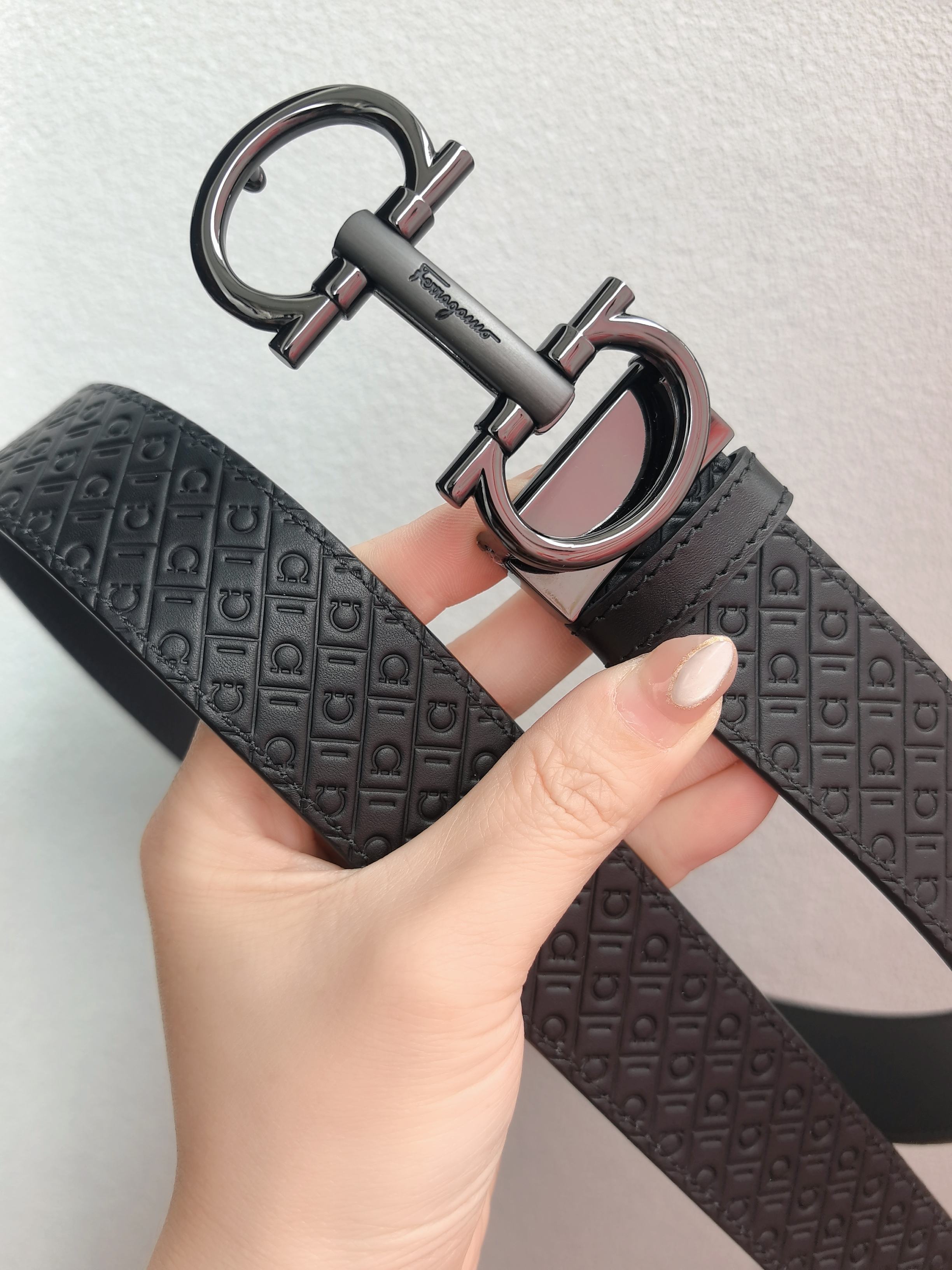 This belt has an elegant style, featuring a rectangular buckle adorned with a small Gancini. It is designed with two sides: one side is made of hammered texture material, while the other side is embossed with an all-over Gancini pattern, exuding a classic charm in a subtle way. The length is adjustable, achieving a tailored and slimming effect. 3.5 wide
