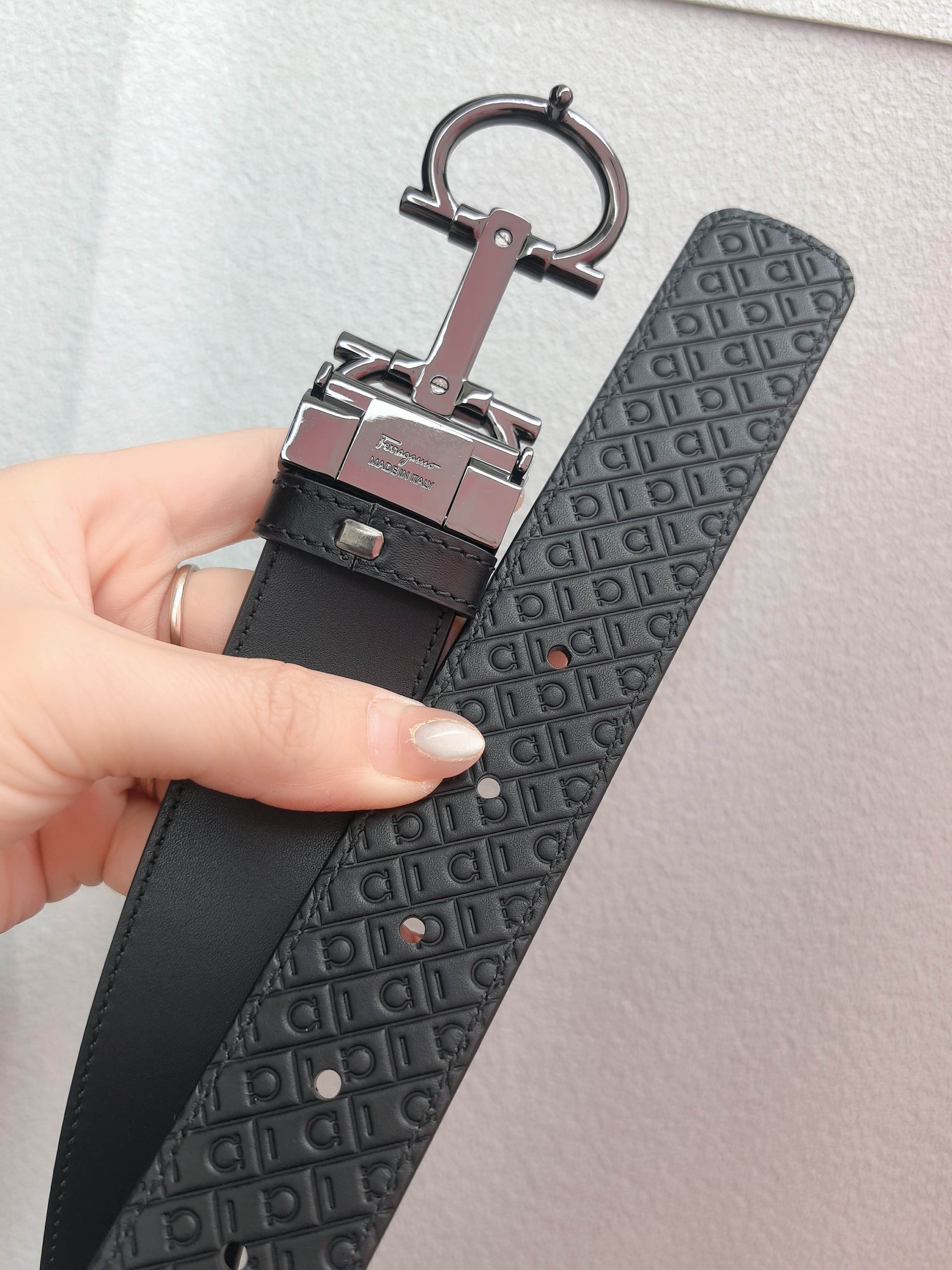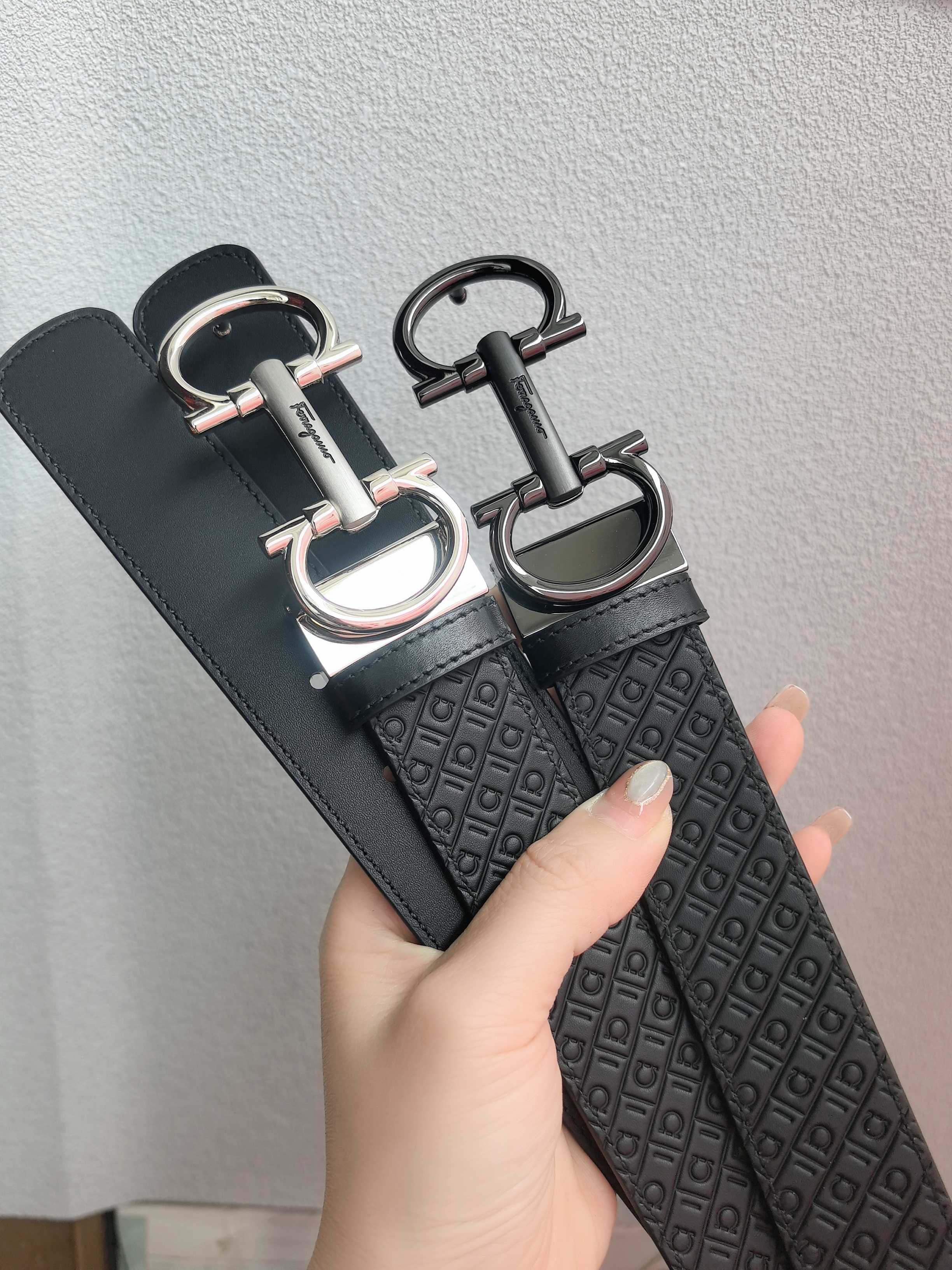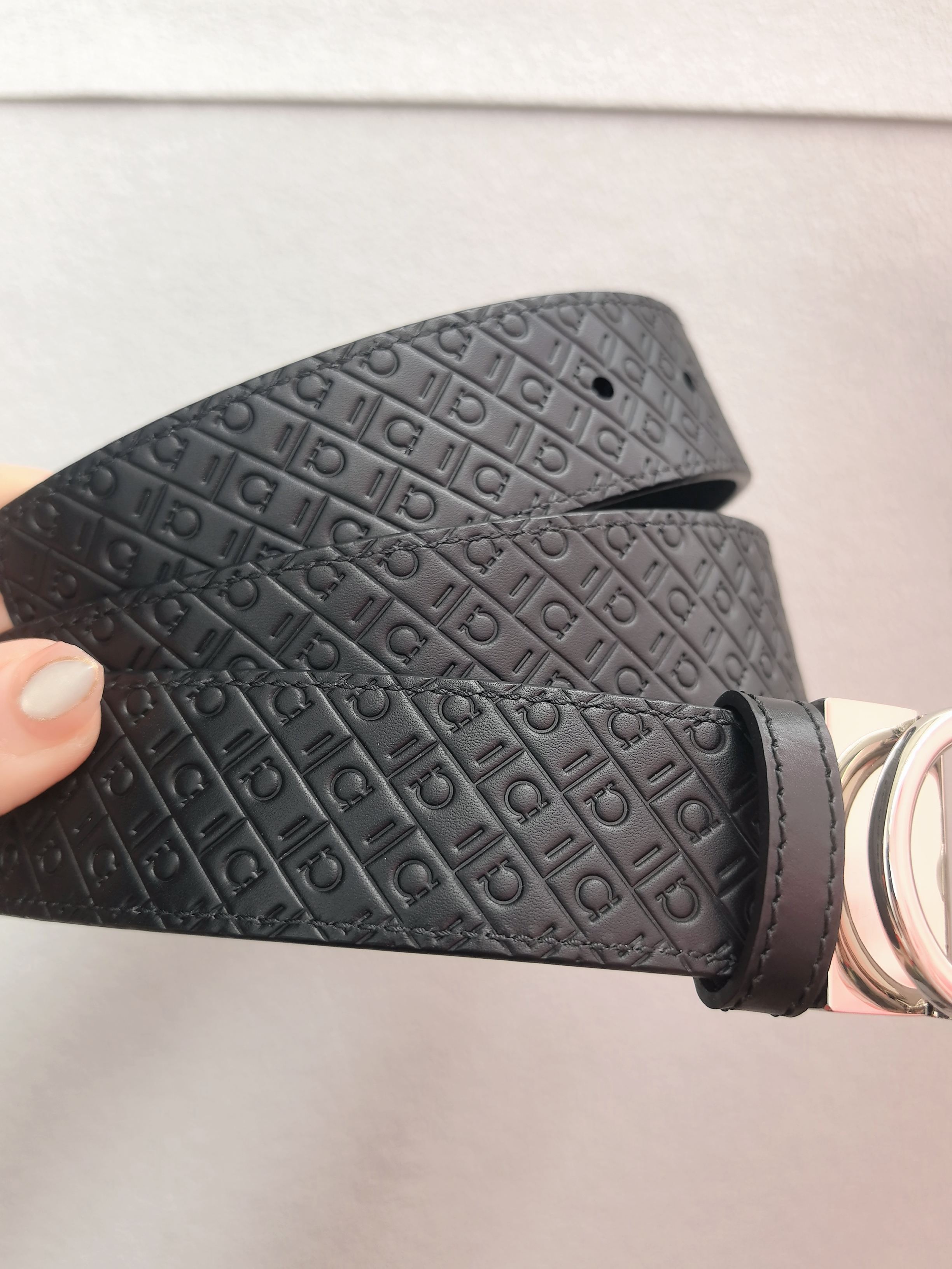 This belt has an elegant style, featuring a rectangular buckle adorned with a small Gancini. It is designed with two sides: one side is made of hammered texture material, while the other side is embossed with an all-over Gancini pattern, exuding a classic charm in a subtle way. The length is adjustable, achieving a tailored and slimming effect. 3.5 wide