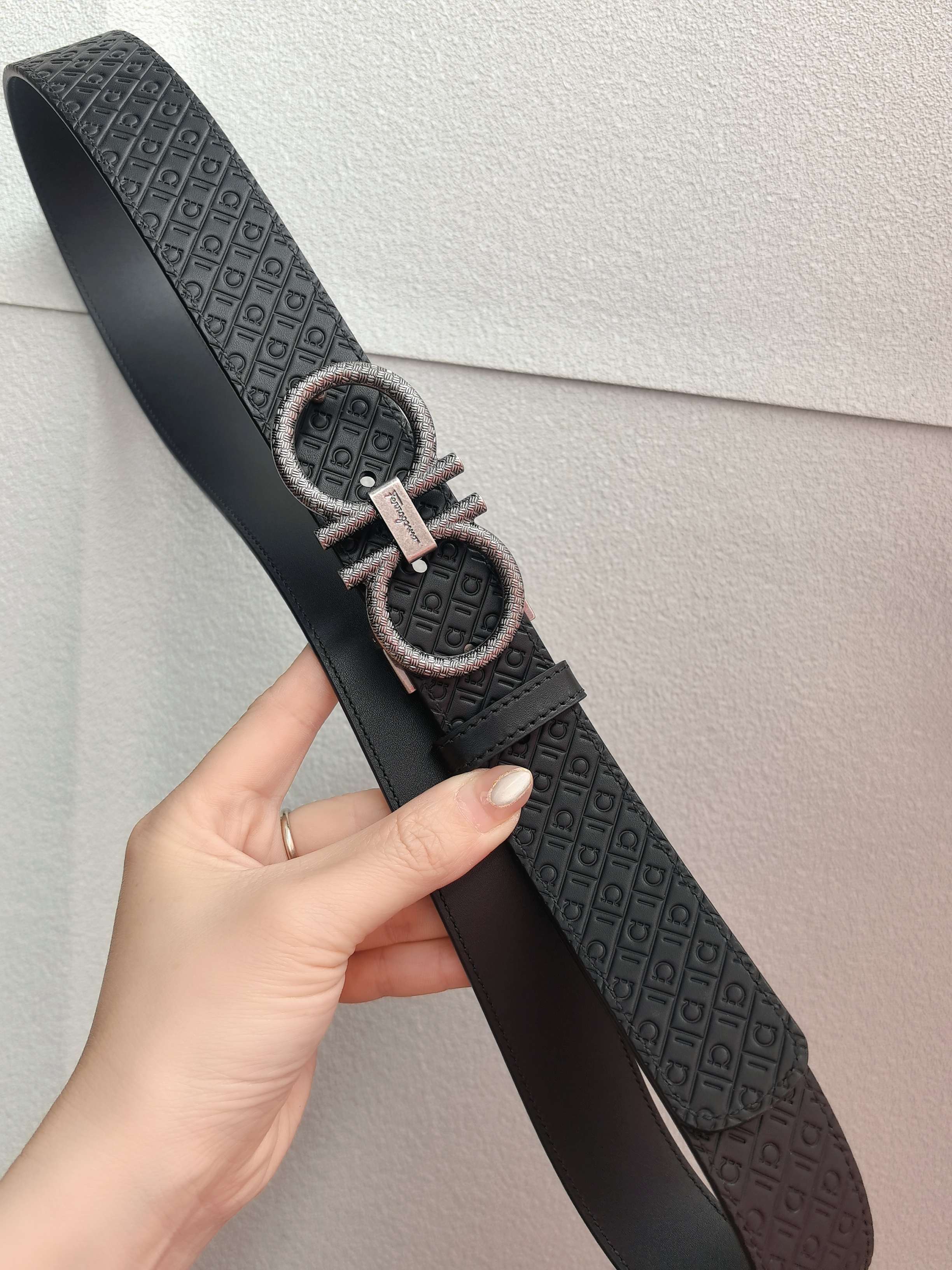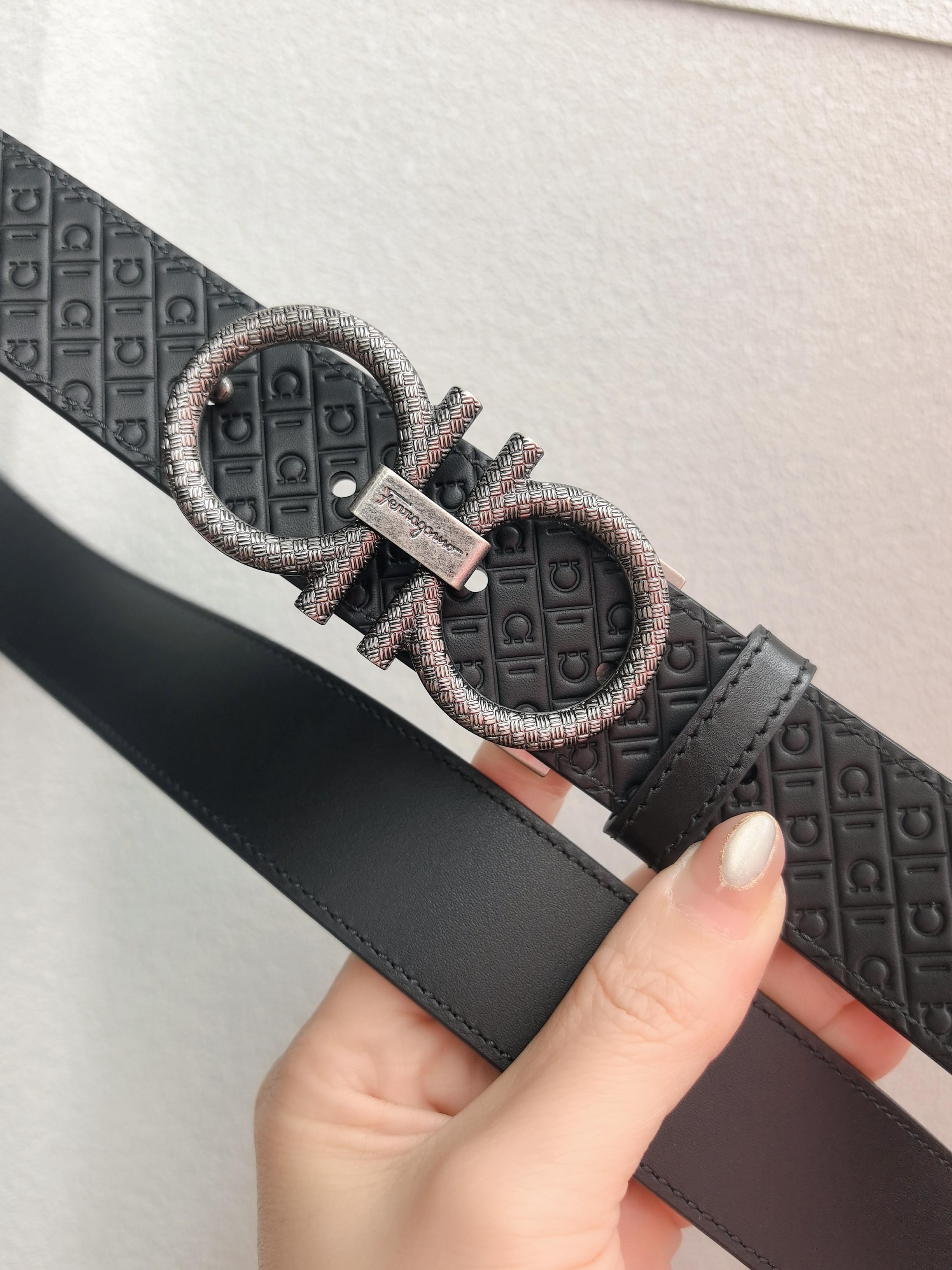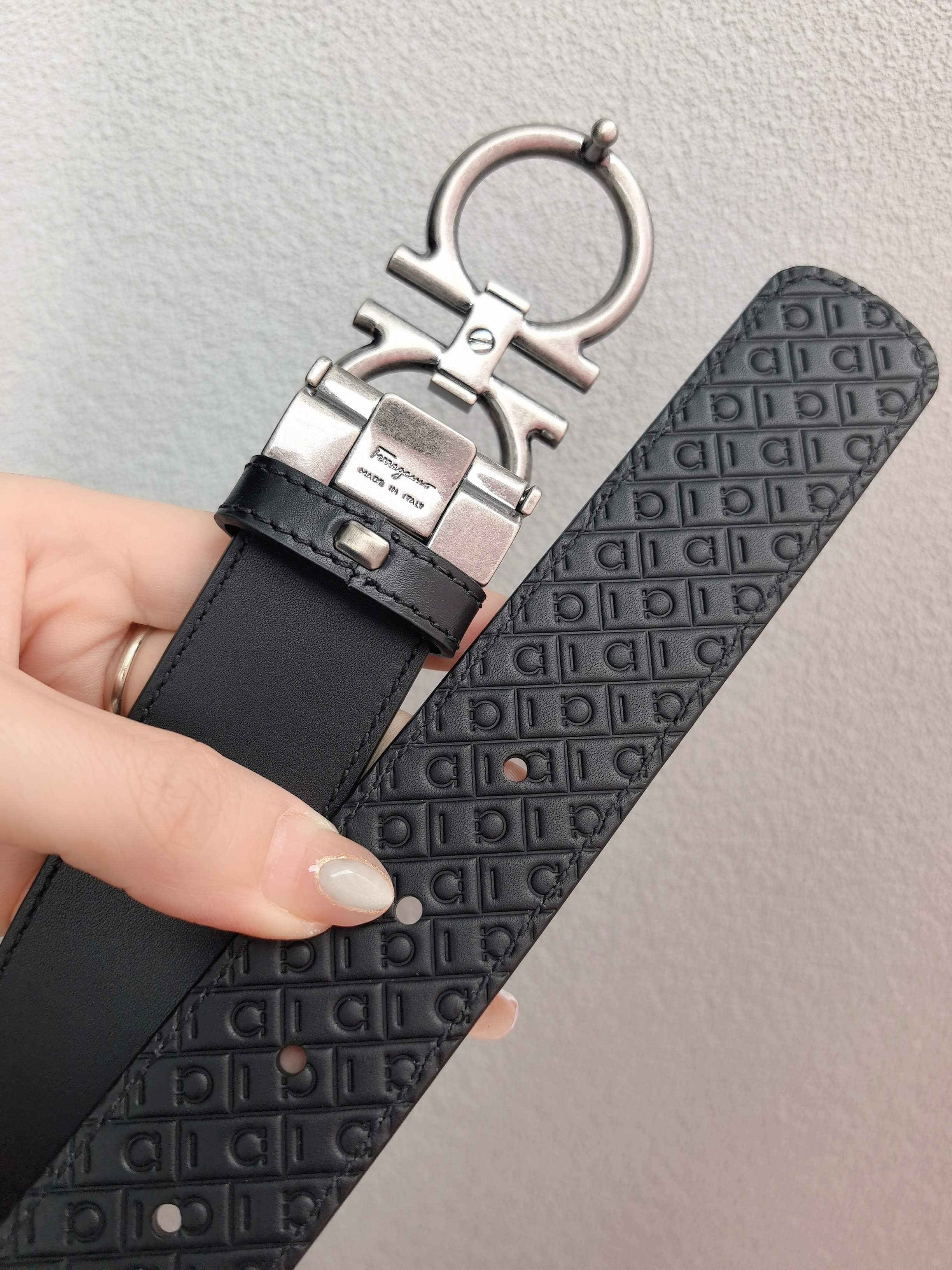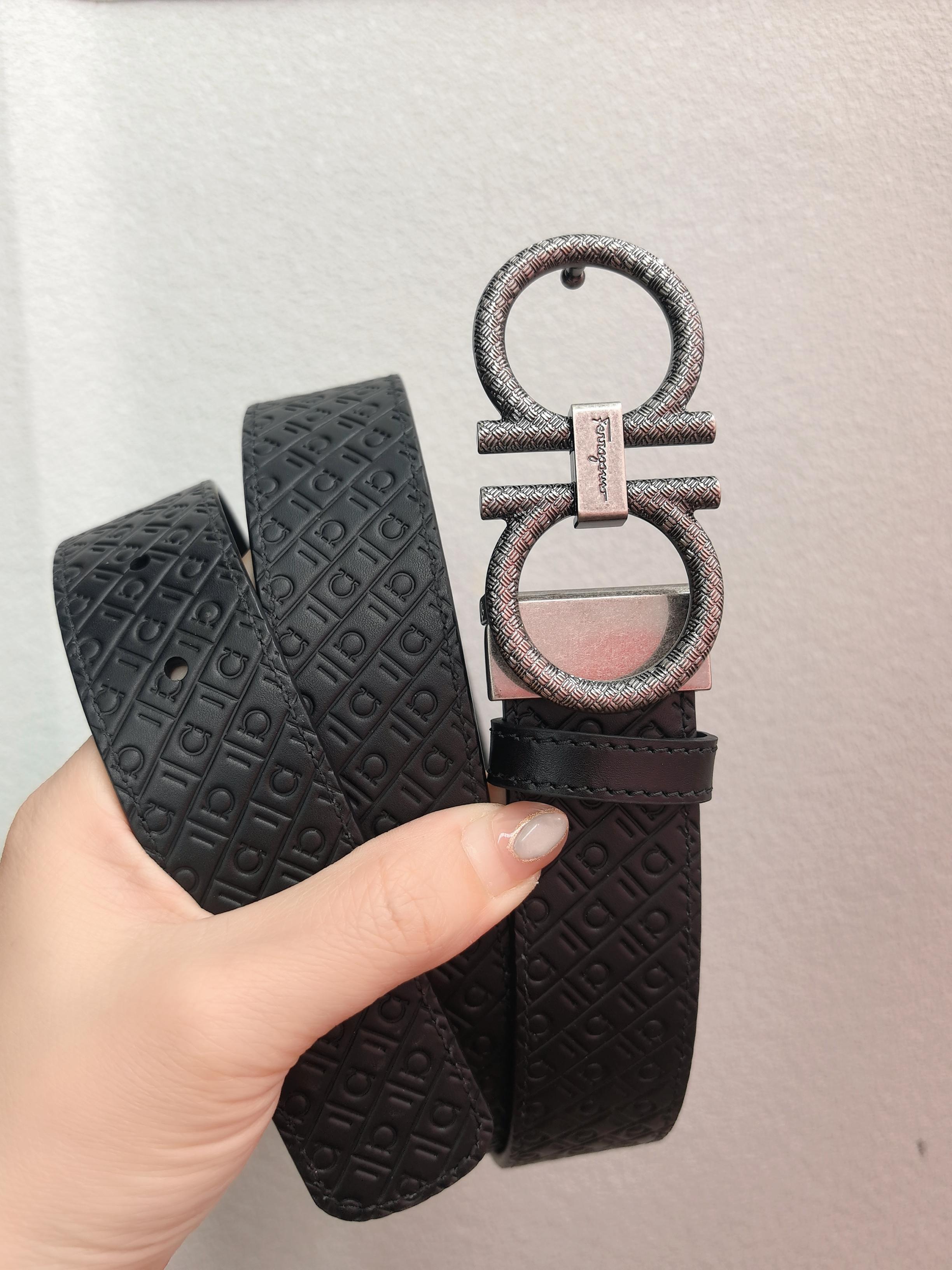 This belt has an elegant style, featuring a rectangular buckle adorned with a small Gancini. It is designed with two sides: one side is made of hammered texture material, while the other side is embossed with an all-over Gancini pattern, exuding a classic charm in a subtle way. The length is adjustable, providing a tailored and slimming effect. 3.5 wide