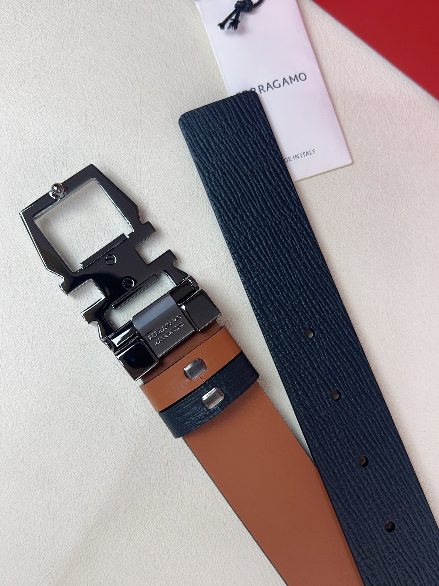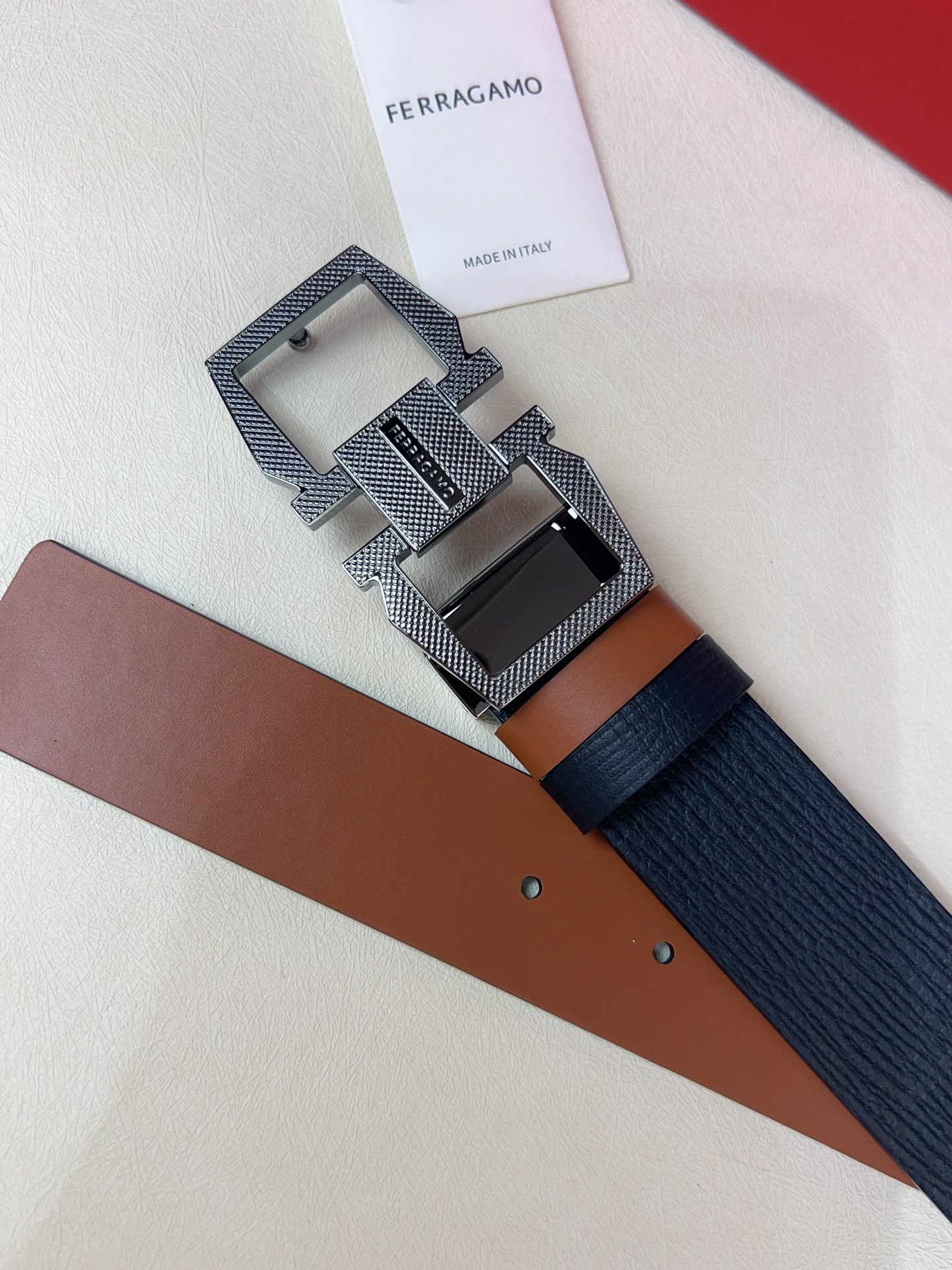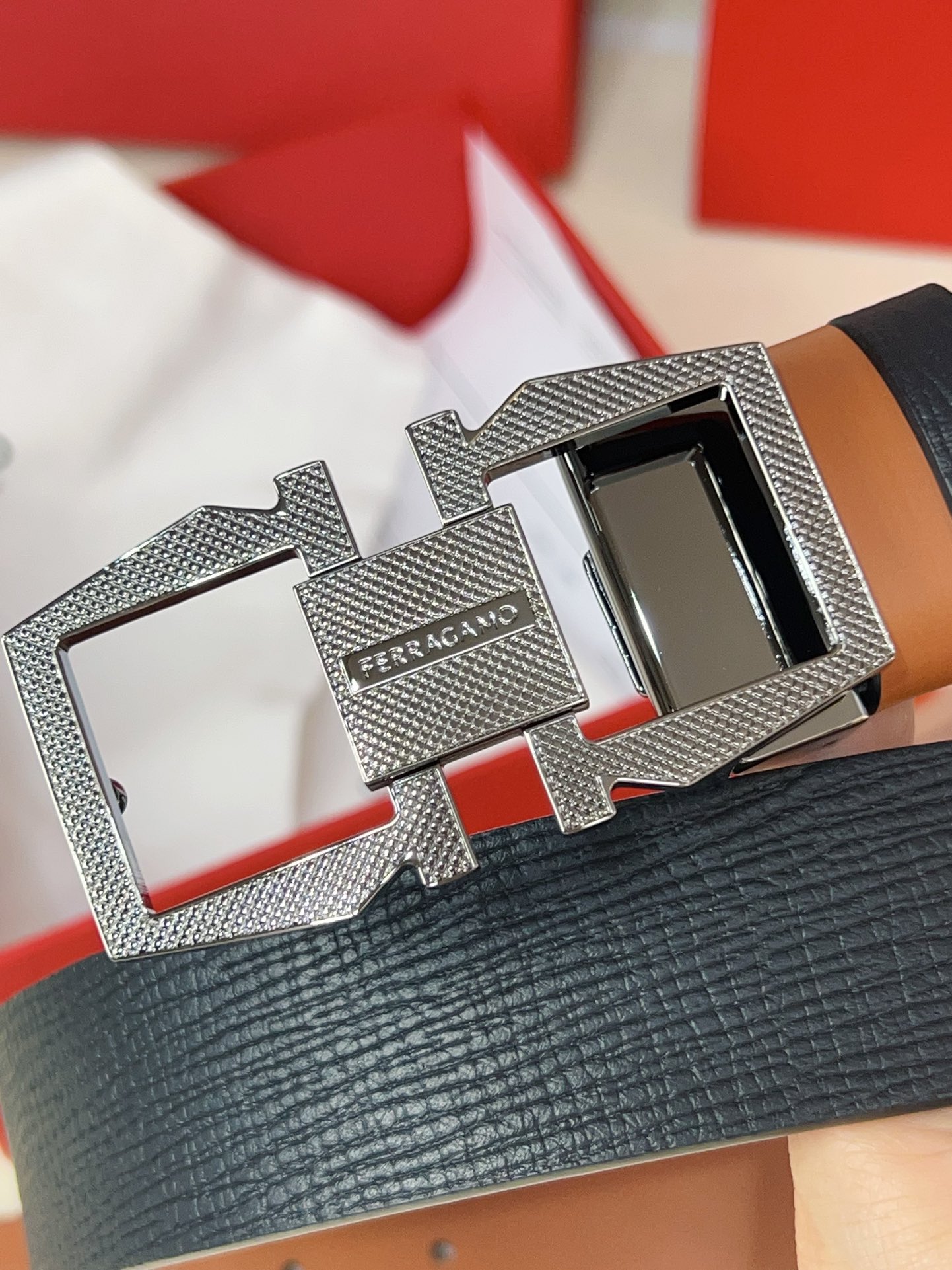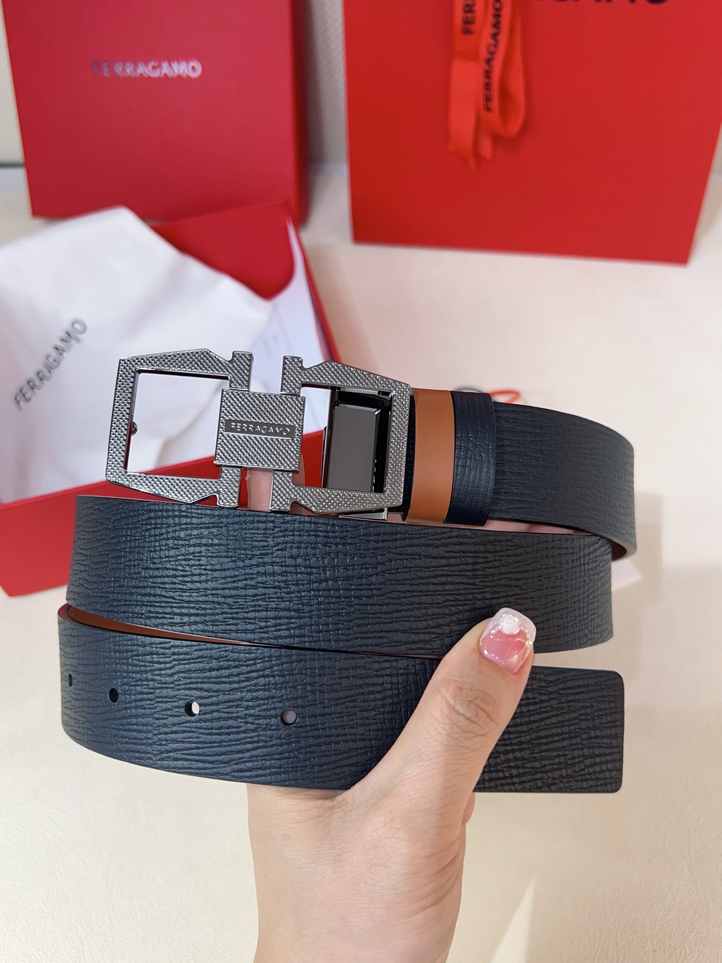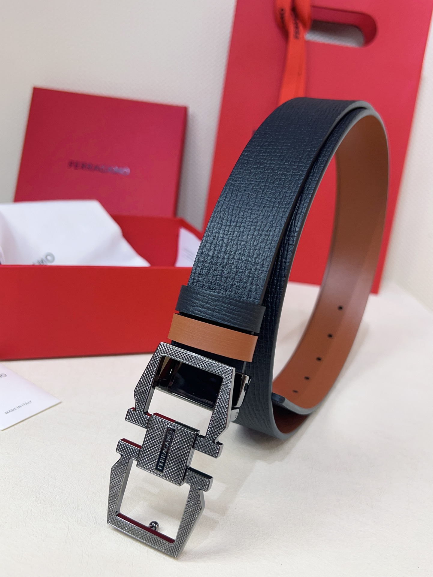This double-sided adjustable belt has a casual style, with one side made of smooth cowhide and the other side made of natural grained leather. The Gancini geometric buckle is adorned with a square plaque at the center, paired with a distinctive knurled surface to create an exquisite textured effect. The length is adjustable, providing a tailored fit.