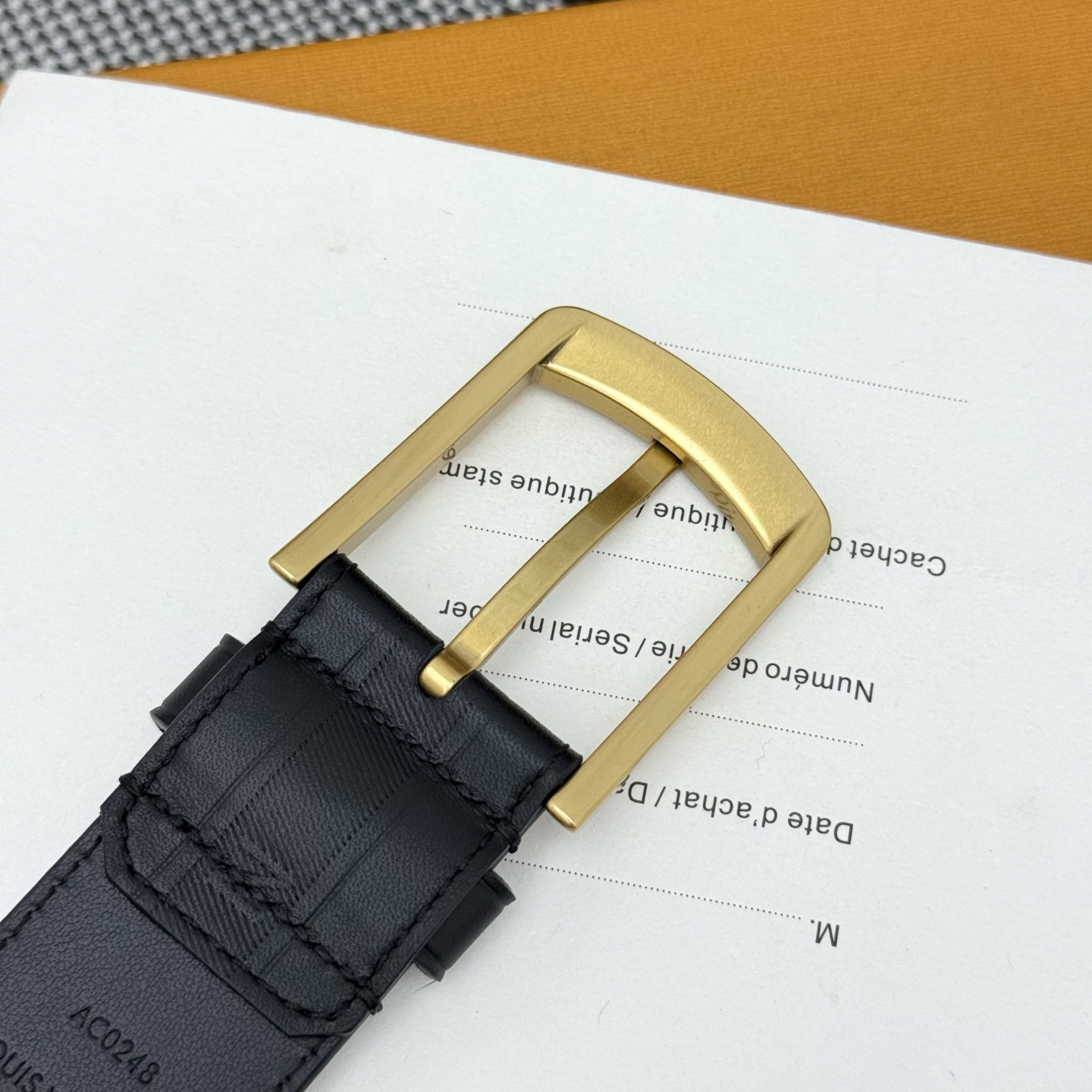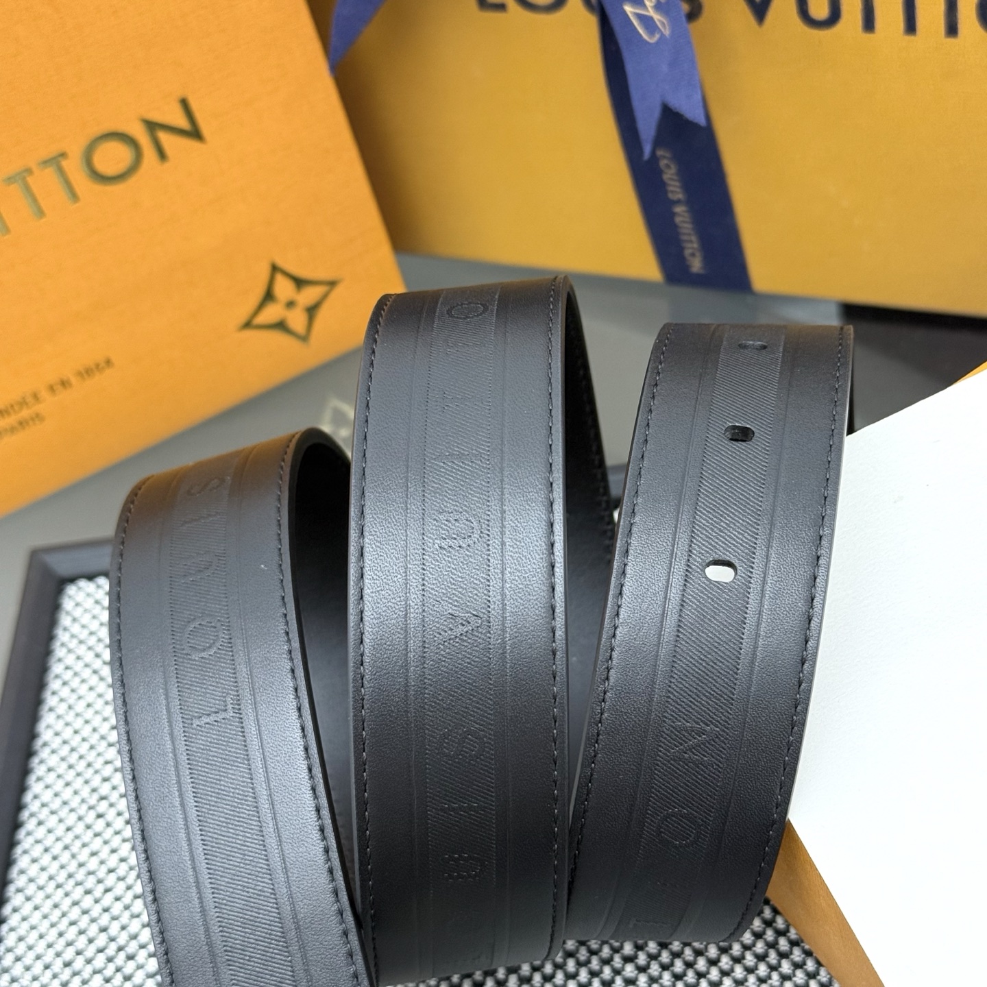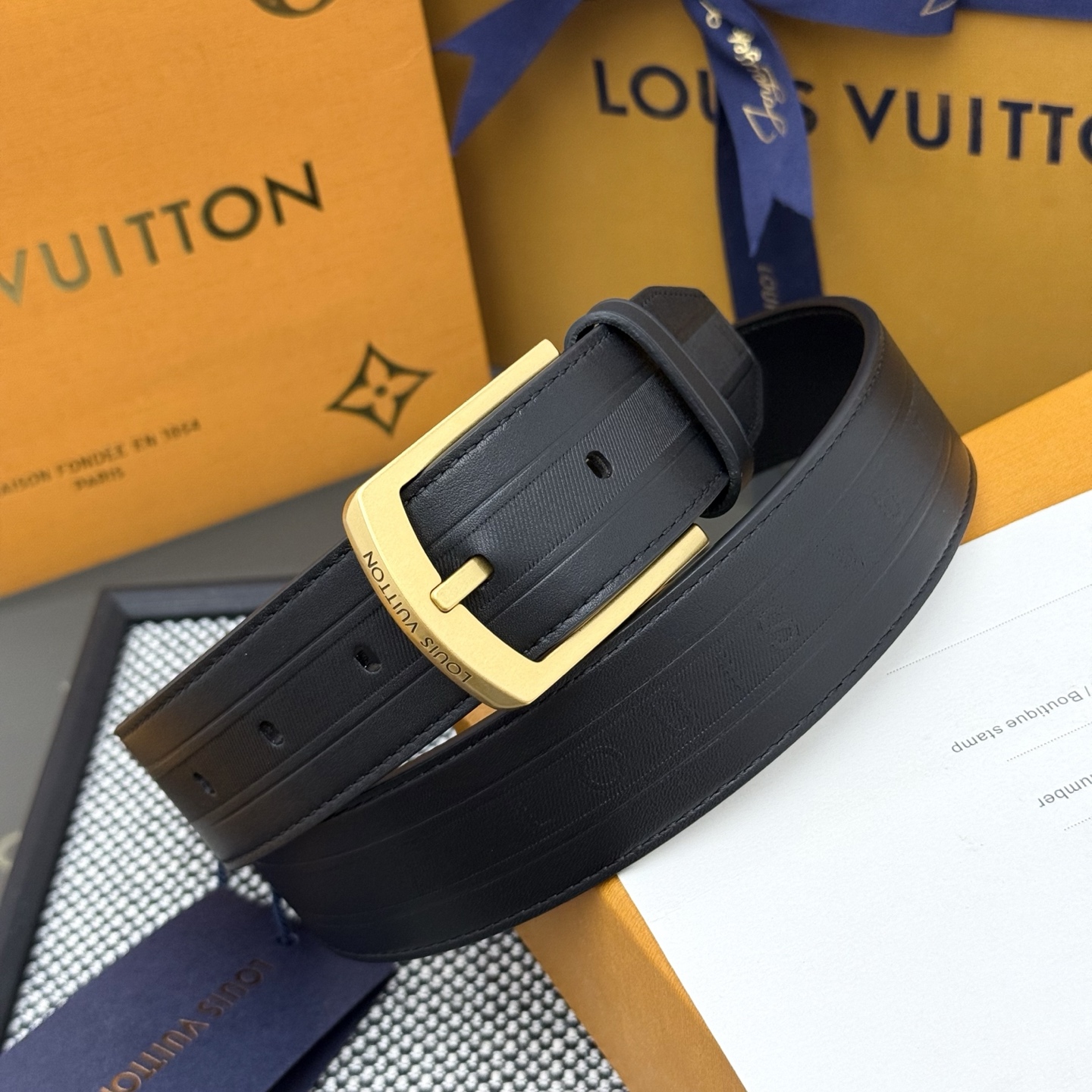 Heritage Italian original factory leather belt is made of grained and smooth leather, featuring a brushed metal curved buckle that highlights an elegant style. An LV decorative pin adorns the end, making it suitable for pairing with formal attire. Width: 3.5cm
