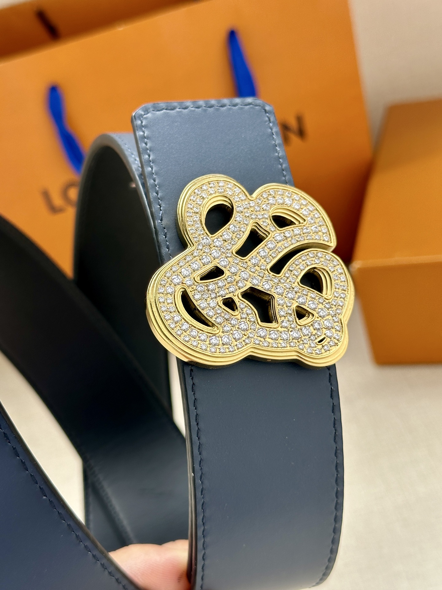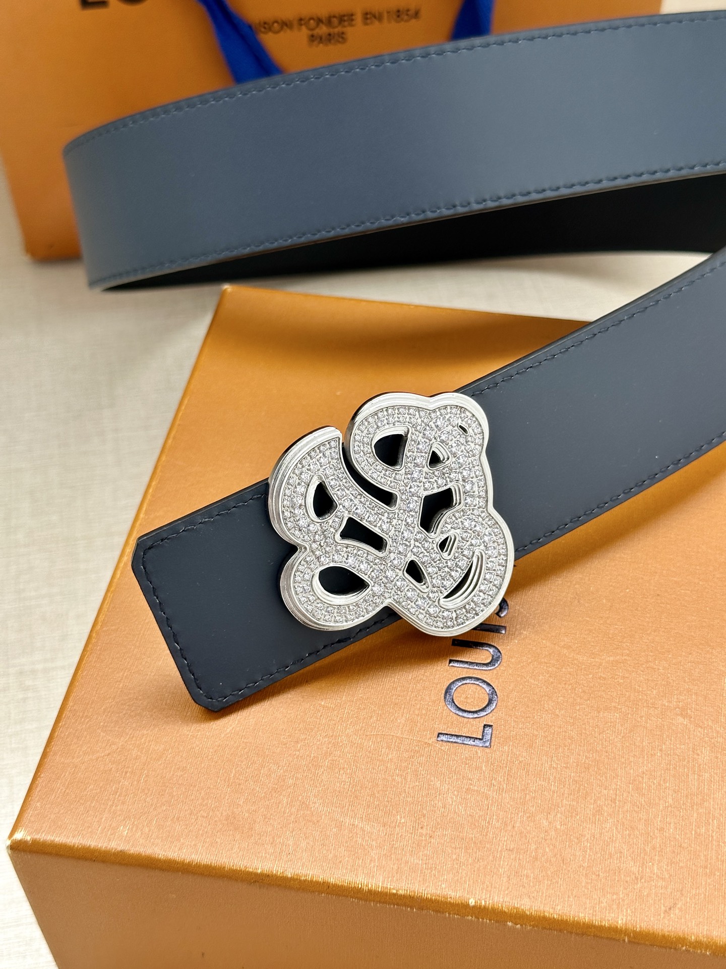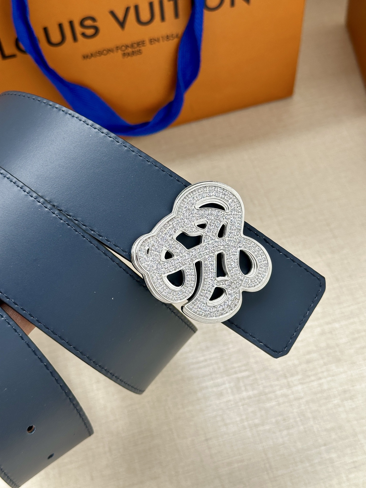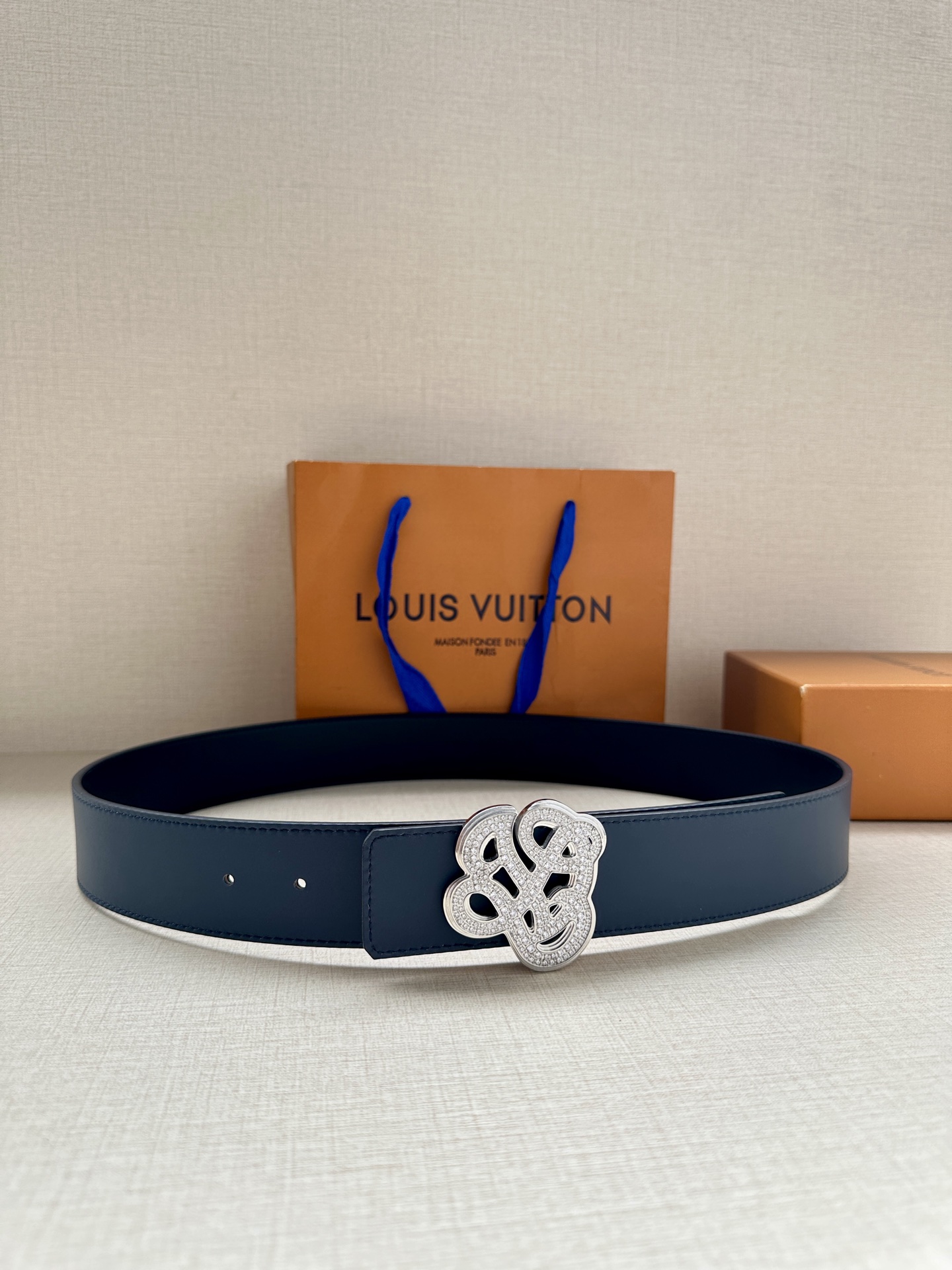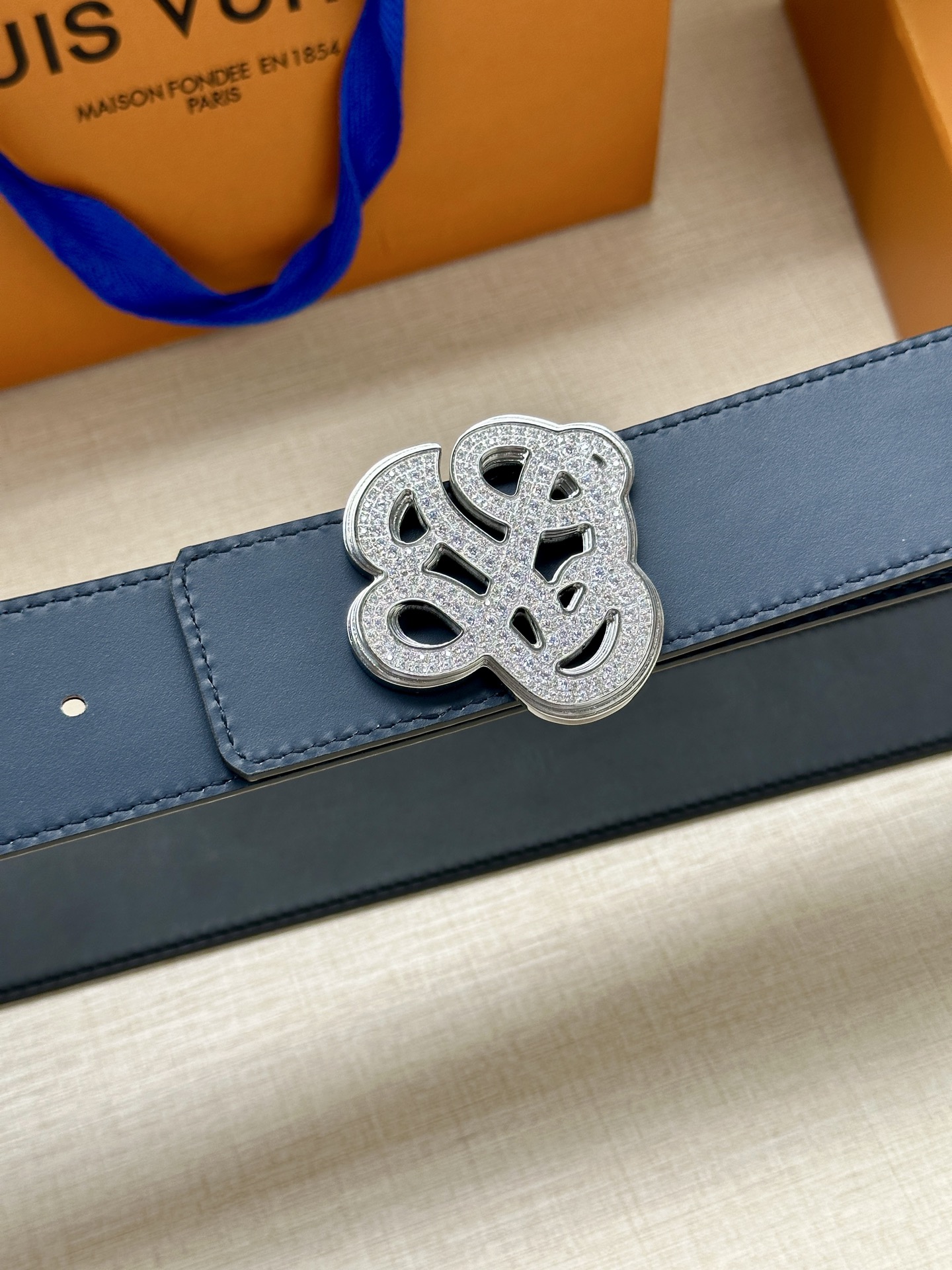 The 4.0 cm wide LV Dynasty reversible belt debuted at Pharrell Williams' first men's show, showcasing two styles with elegant leather and highlighting the brand's exquisite craftsmanship. The new LV Dynasty buckle, adorned with bright synthetic cubic zirconia, elevates any look.