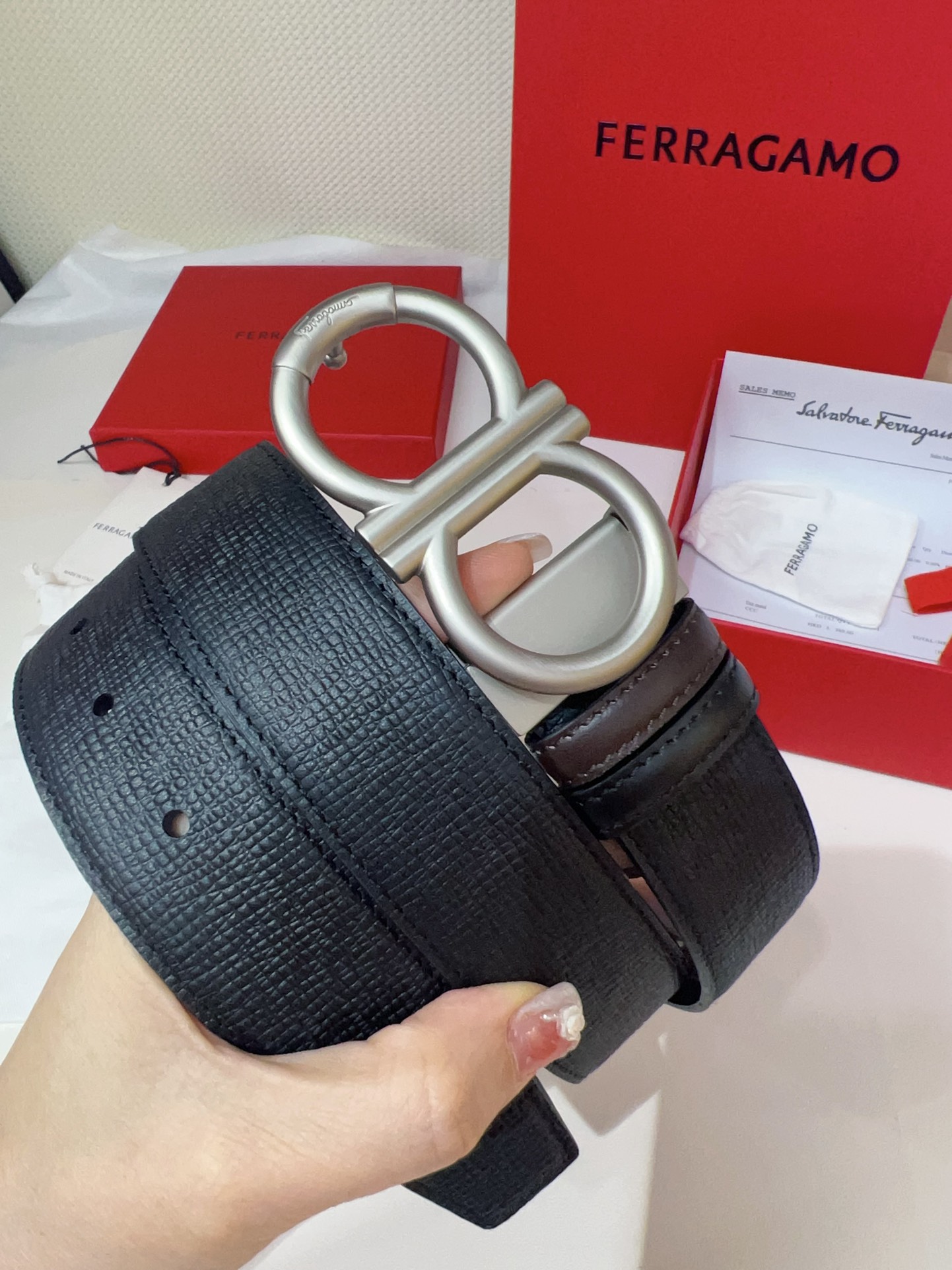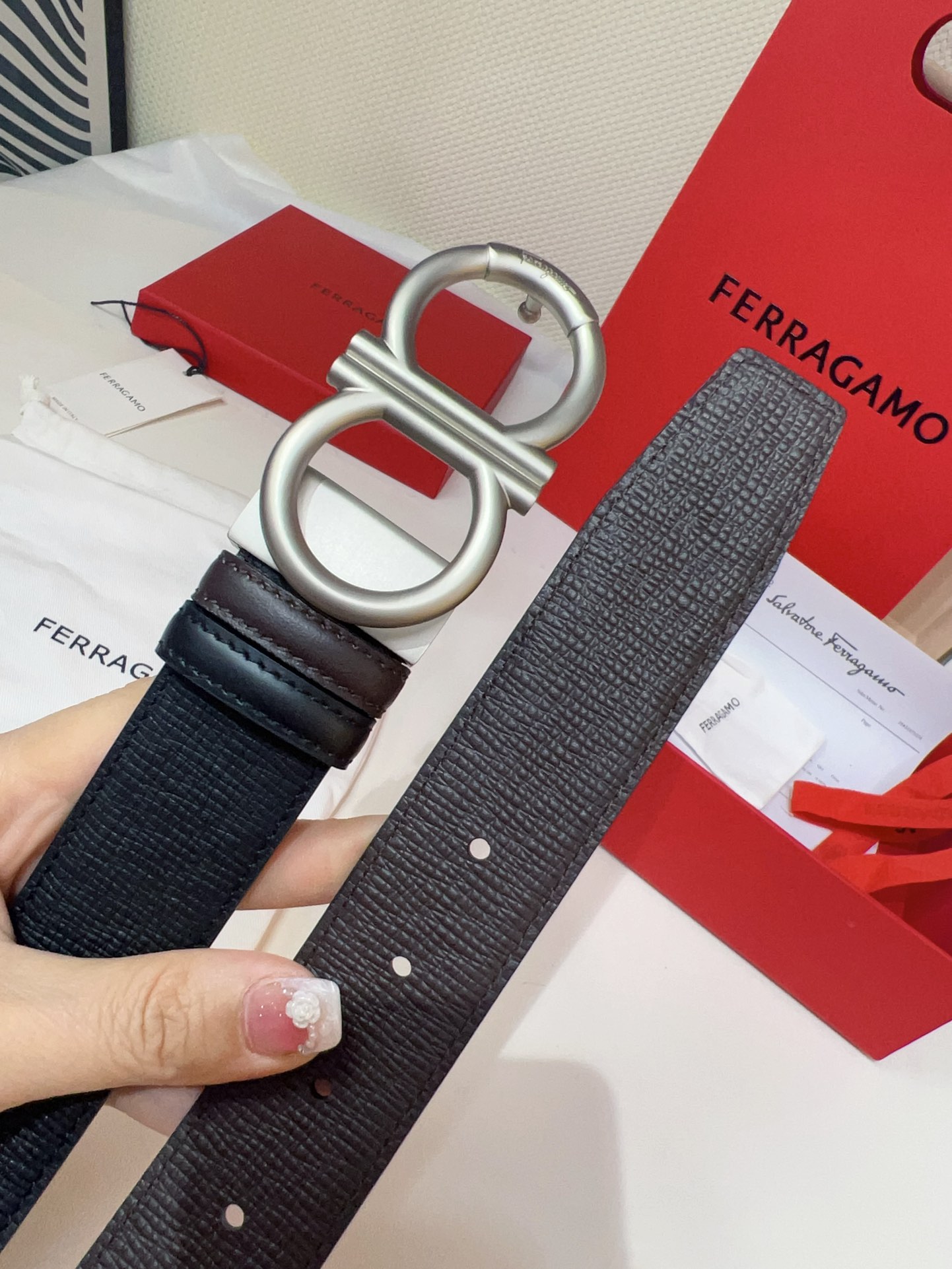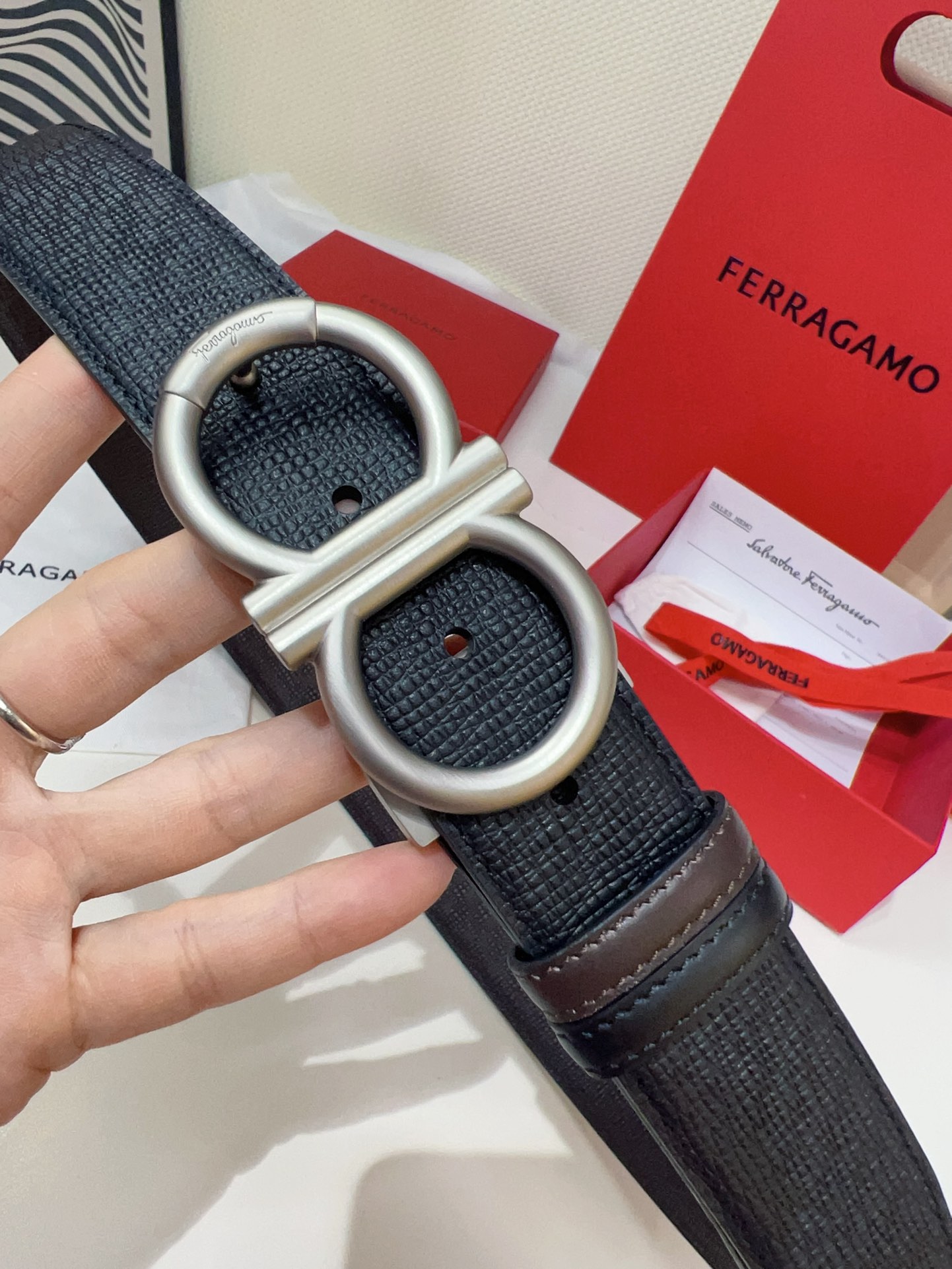 This double-sided belt features an elegant style with a dual-finish design, flexibly creating versatile looks while maintaining a sophisticated tone at all times, making it a staple accessory for the modern refined gentleman. The natural grained calfskin and hammered calfskin are spliced together, presenting an avant-garde and eye-catching edge effect. The Gancini buckle is paired with contrasting trim, adorned with logos at the connections. The adjustable length allows for a tailored, slim fit. The belt can be trimmed or additional eyelets added to achieve a tight or relaxed fit, 3.5 wide.