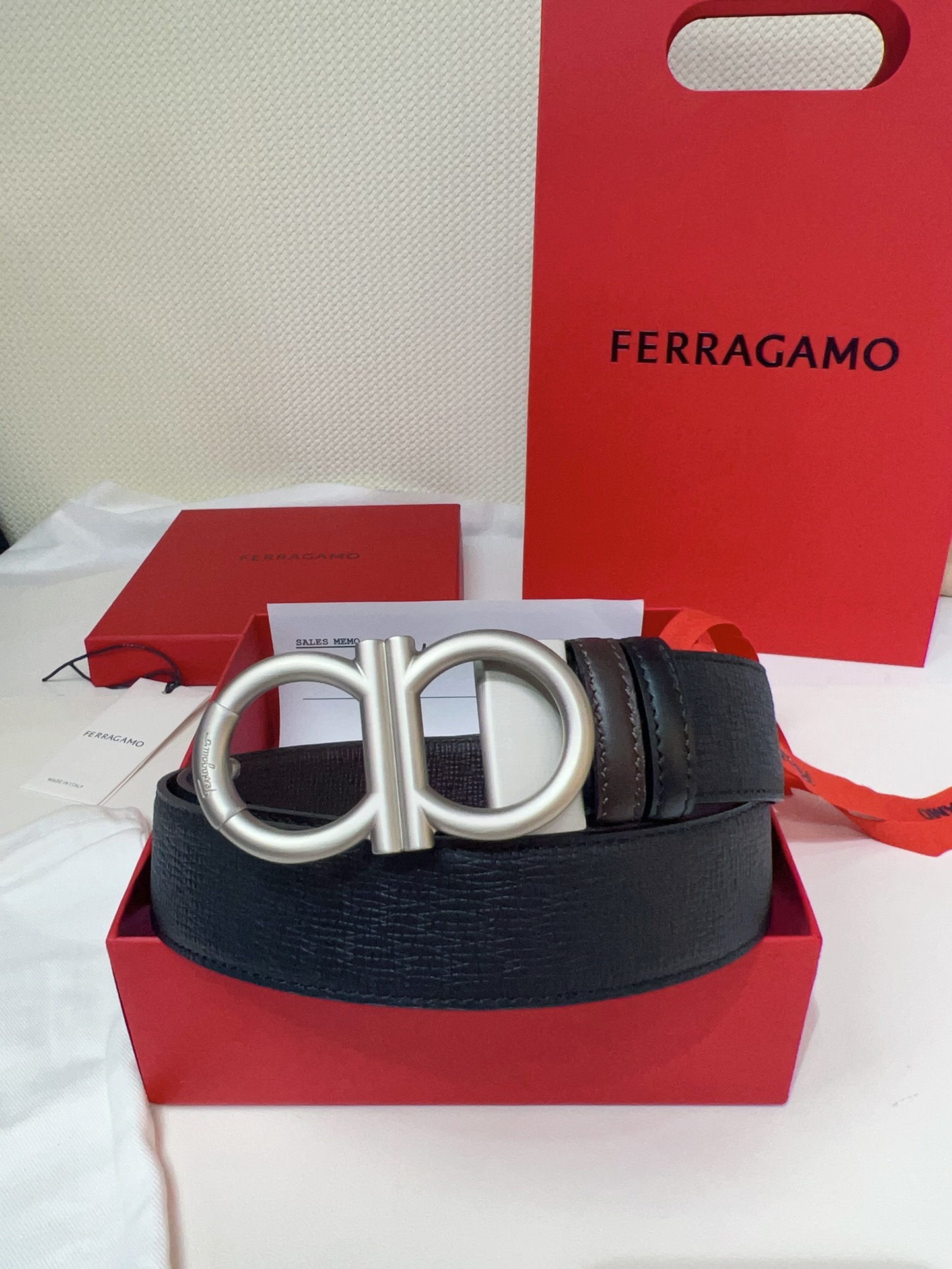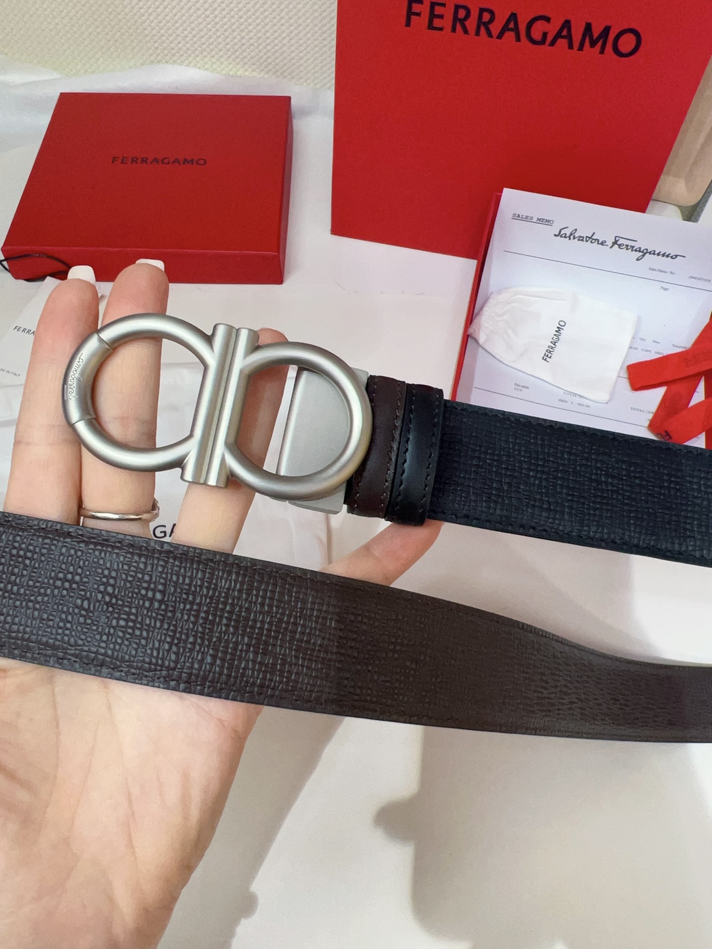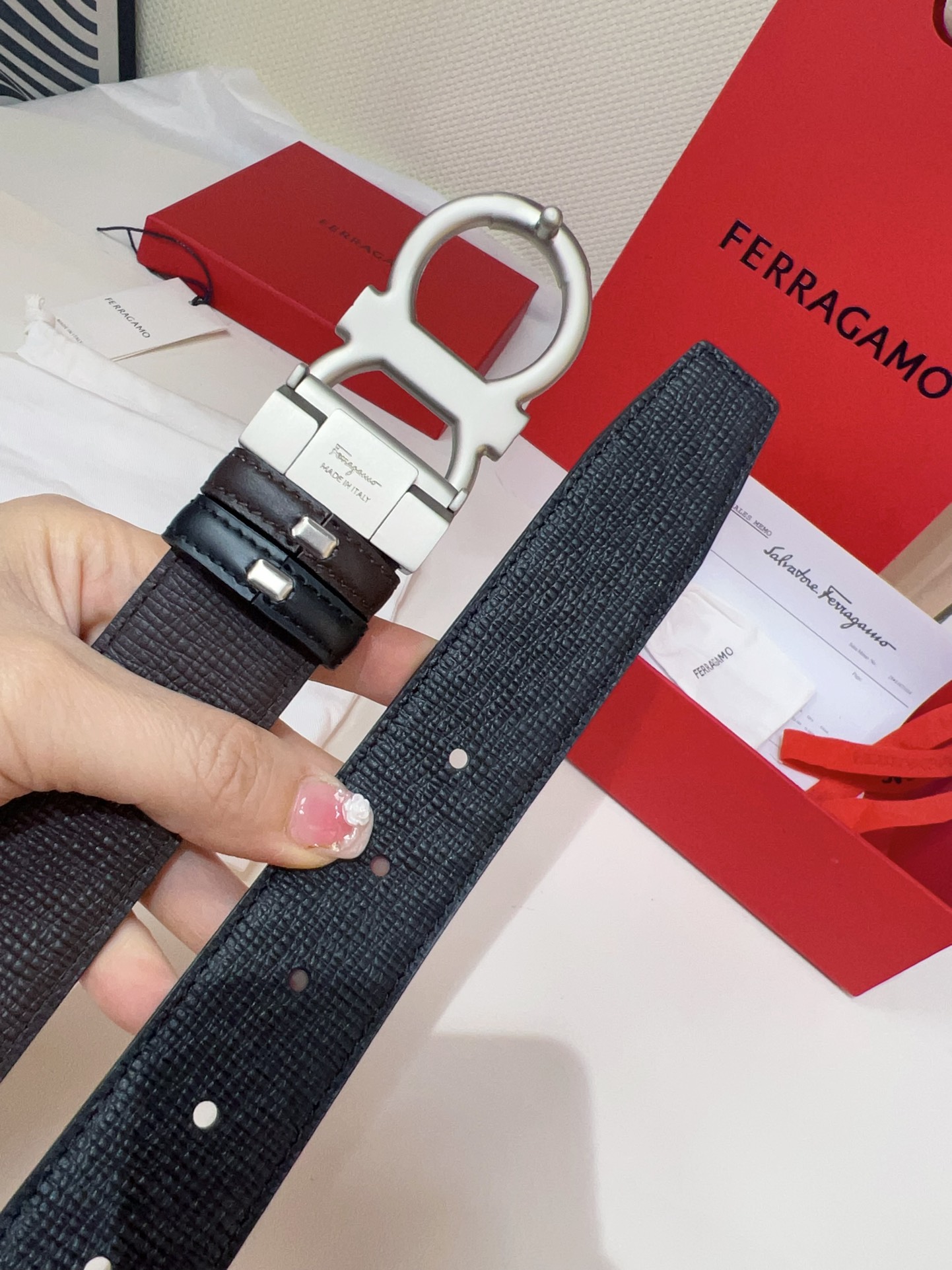 This double-sided belt features an elegant style with a dual-finish design, flexibly creating versatile looks while maintaining a sophisticated tone at all times, making it a staple accessory for the modern refined gentleman. The natural grained calfskin and hammered calfskin are spliced together, presenting an avant-garde and eye-catching edge effect. The Gancini buckle is paired with contrasting trim, adorned with logos at the connections. The adjustable length allows for a tailored, slim fit. The belt can be trimmed or additional eyelets added to achieve a tight or relaxed fit, 3.5 wide.
