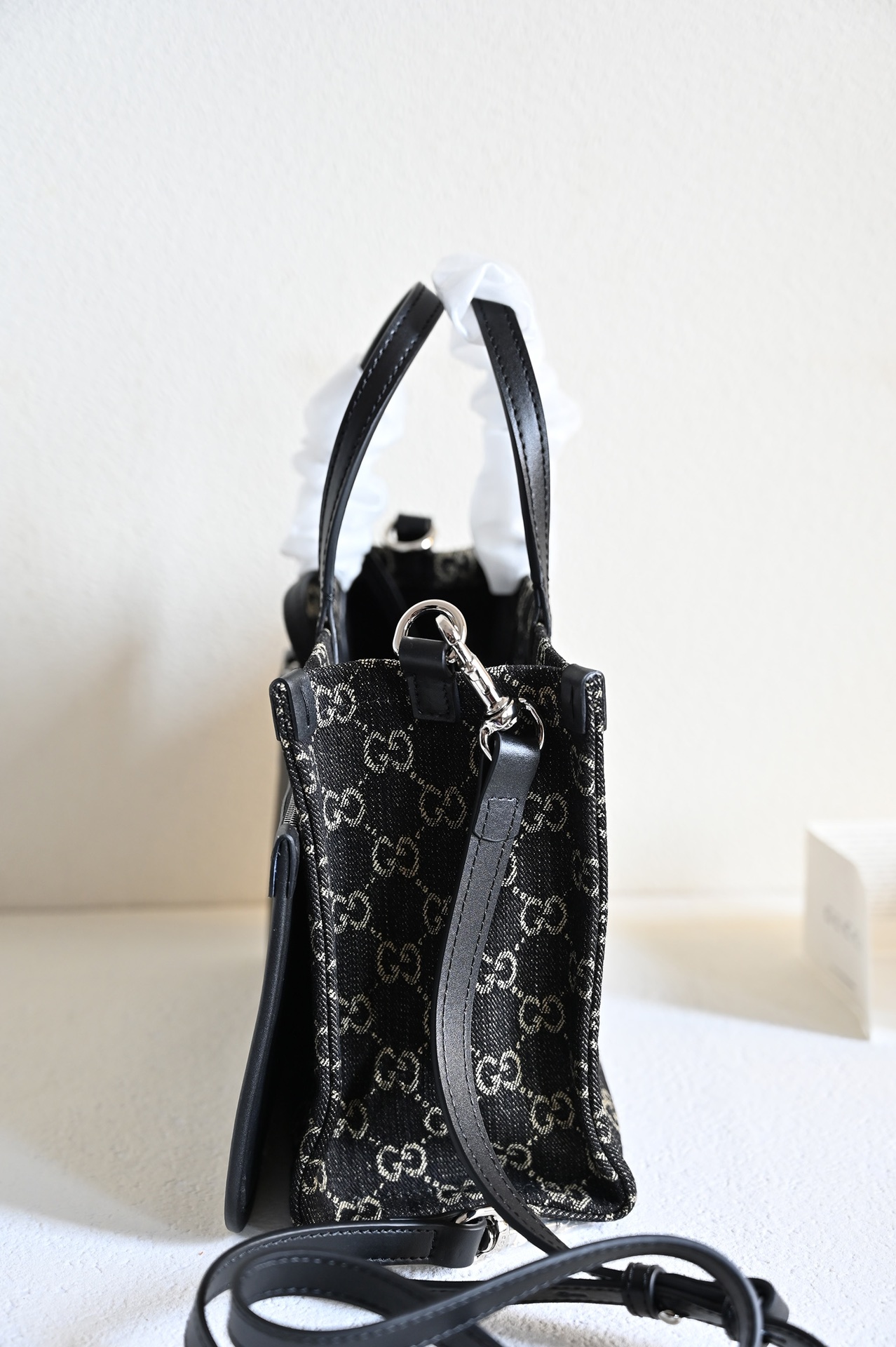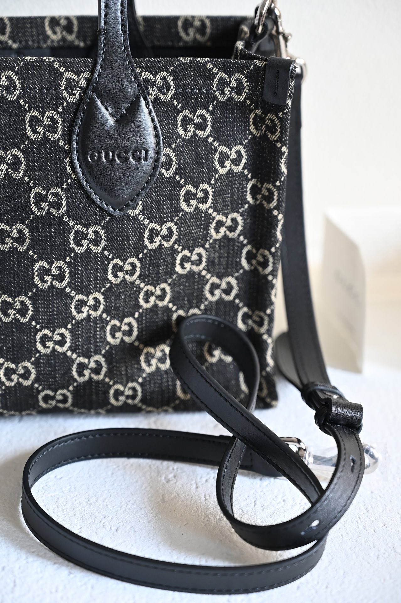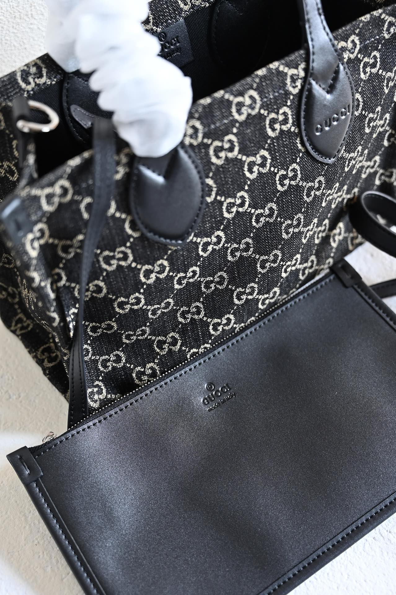 GG Medium Tote Bag. In the 2024 Early Spring Collection, the Ophidia series introduces multiple shoulder bags, tote bags, and handbags, meticulously crafted from GG black denim and skillfully integrated with silver-toned metallic accessories to create a contrasting charm. Made from black and gray GG denim with black leather trim, this product is a Gucci Tag selected item. It supports NFC technology, offering a digital innovation experience. Handle: 12 cm (height) Detachable shoulder strap.