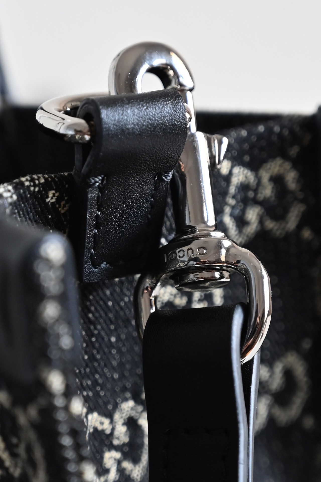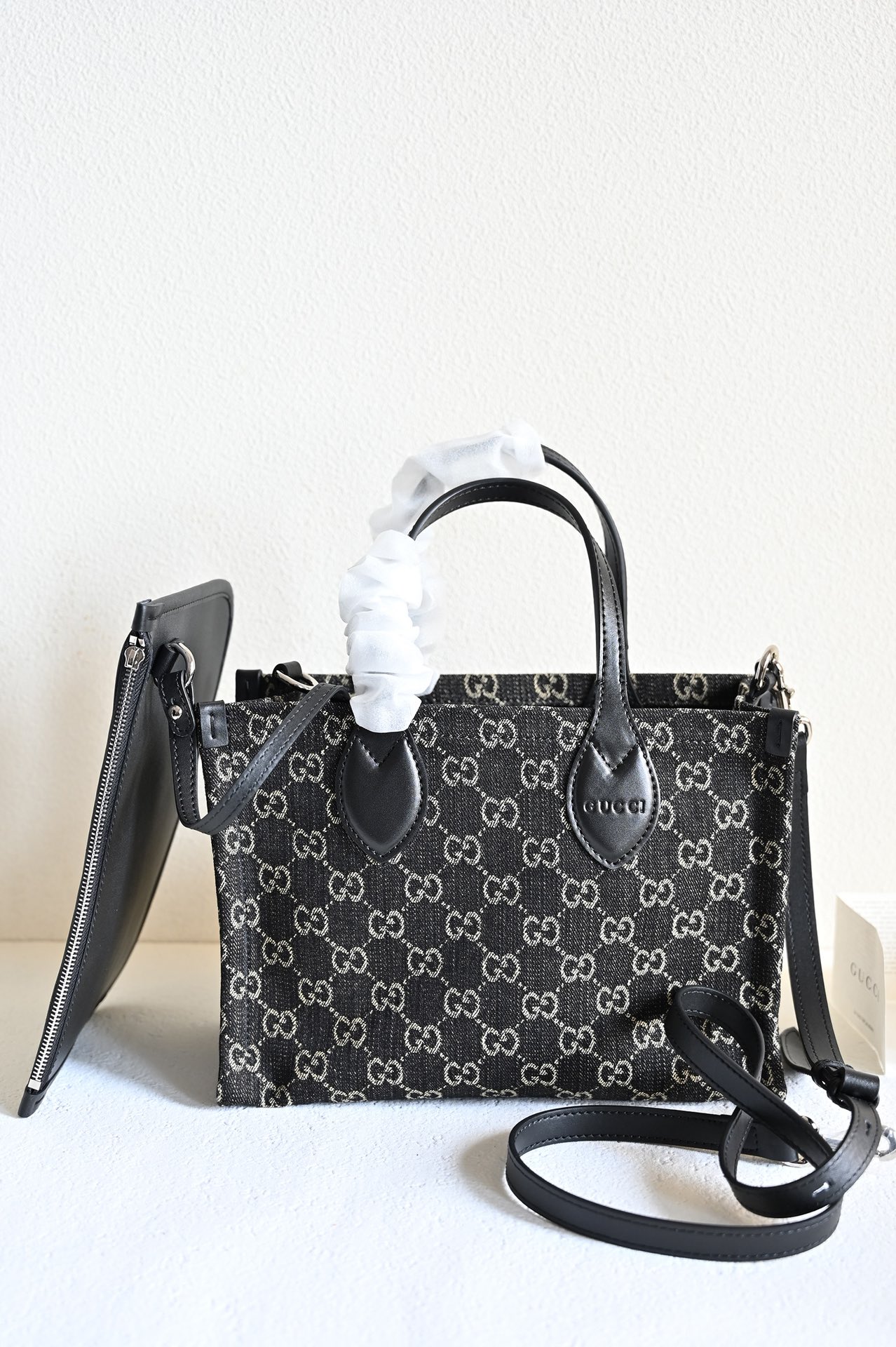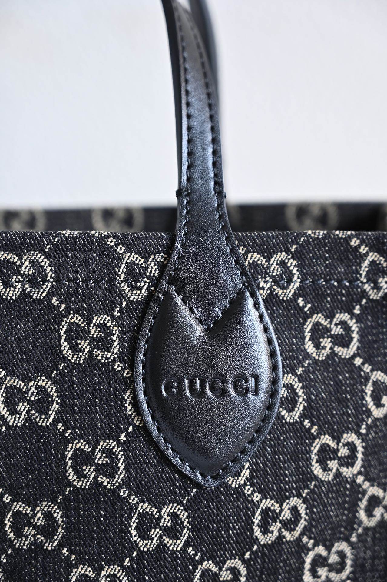 GG Medium Tote Bag. In the 2024 Early Spring Collection, the Ophidia series introduces multiple shoulder bags, tote bags, and handbags, meticulously crafted from GG black denim and skillfully integrated with silver-toned metallic accessories to create a contrasting charm. Made from black and gray GG denim with black leather trim, this product is a Gucci Tag selected item. It supports NFC technology, offering a digital innovation experience. Handle: 12 cm (height) Detachable shoulder strap.