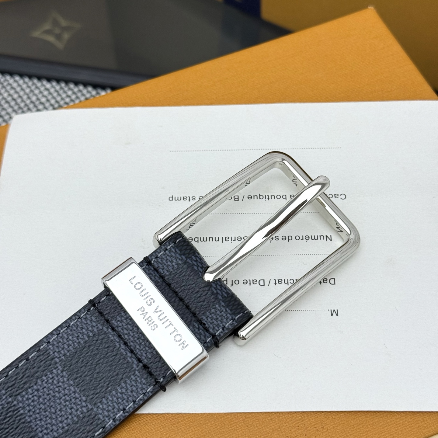 Home • Belt • Heritage Italian leather belt with brushed metal buckle and LV pin. Width: 3.5cm. Elegant for formal wear.