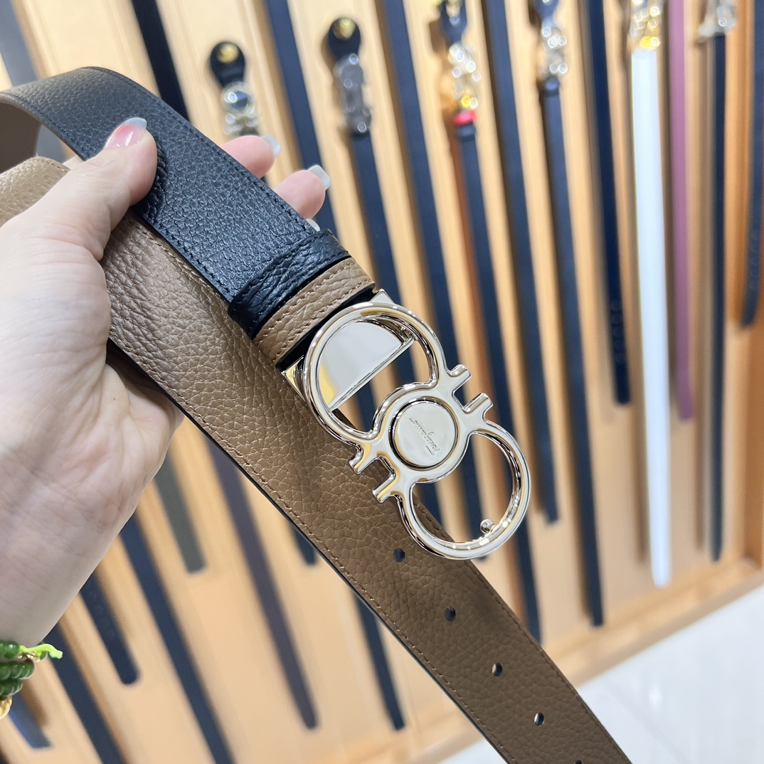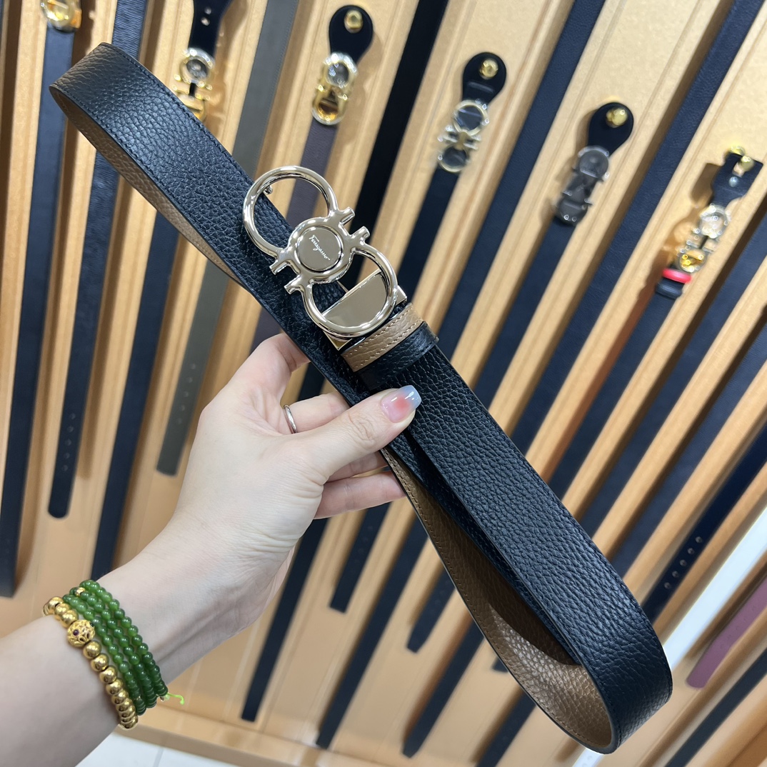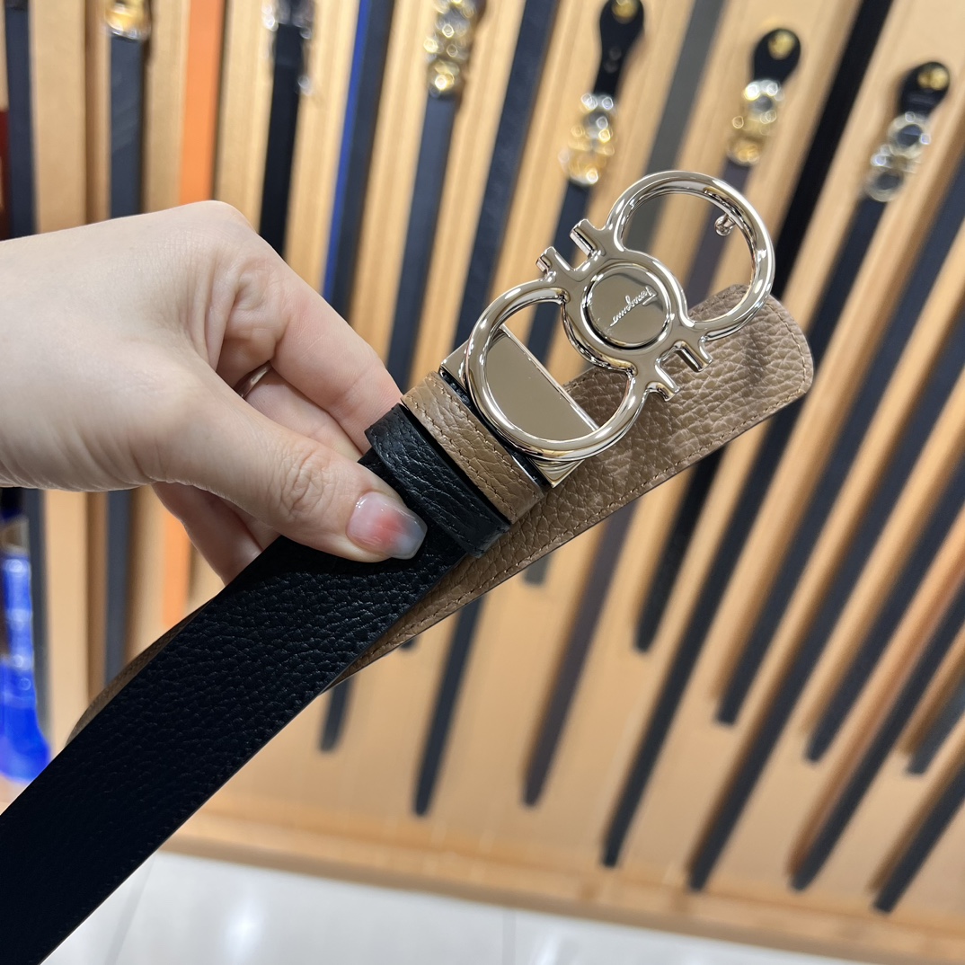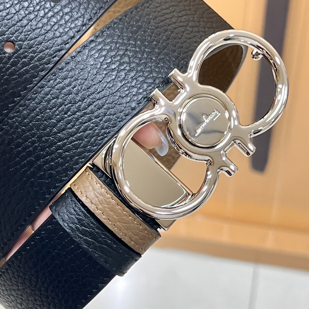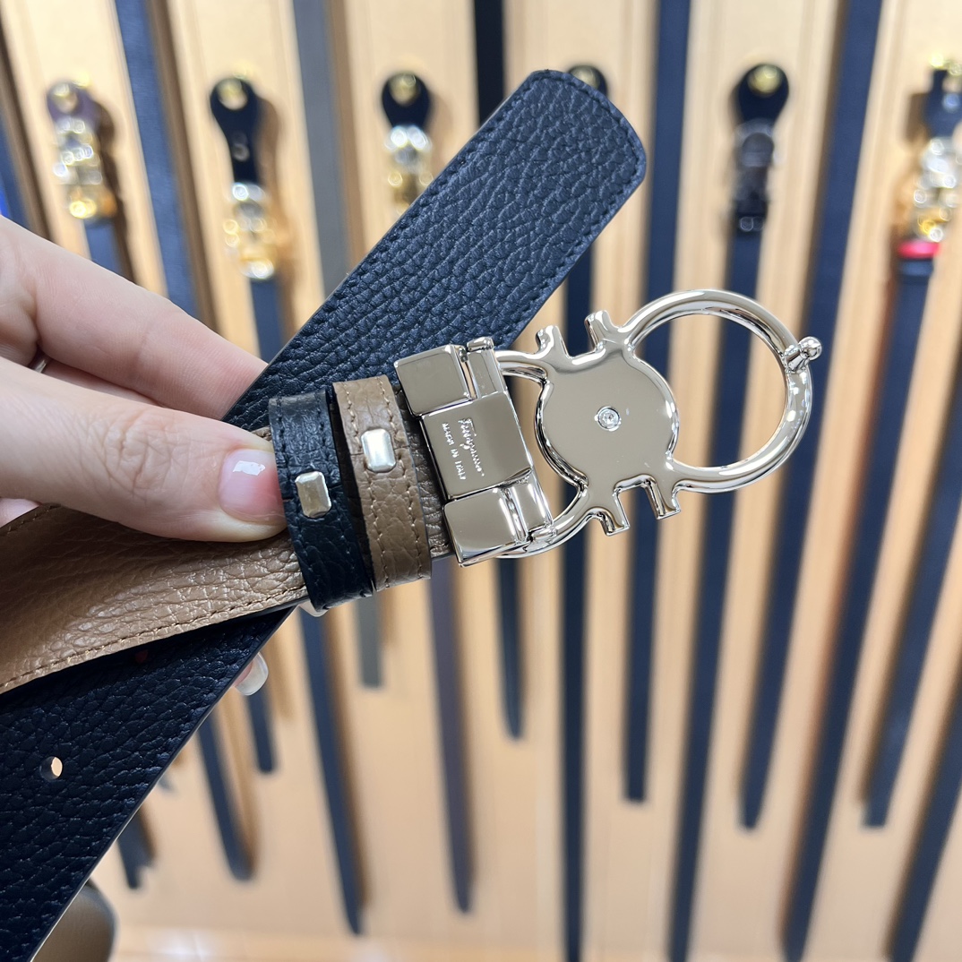This stylish and sleek Italian leather belt is adorned with a Gancini buckle, featuring a striking double-sided design: one side of the buckle has a smooth finish, while the other side is engraved with the Gancio pattern. This reversible belt is a versatile accessory, functional and practical, allowing for flexible styling in various outfits. The length is adjustable, providing a tailored, slimming effect. 3.5 wide