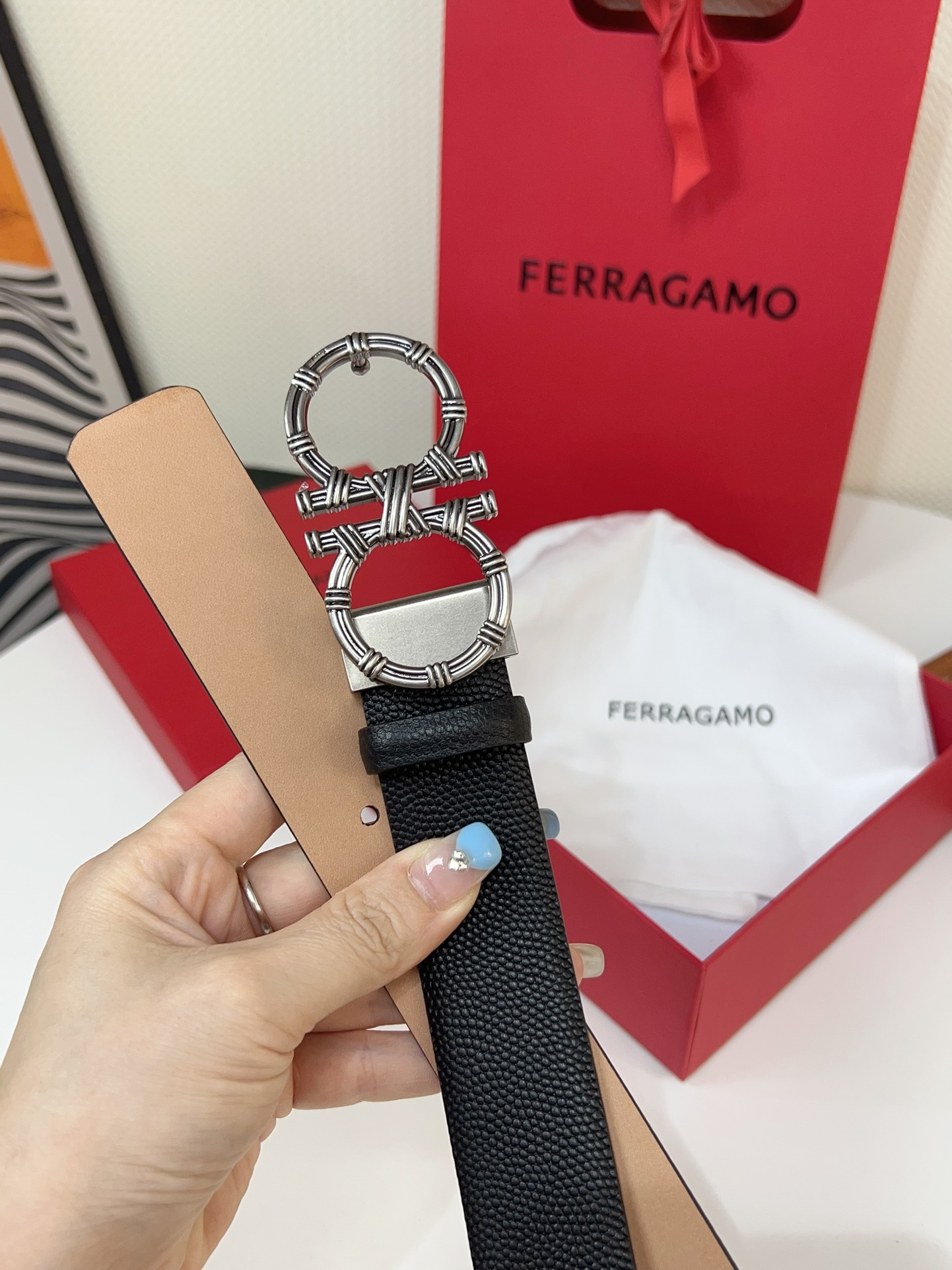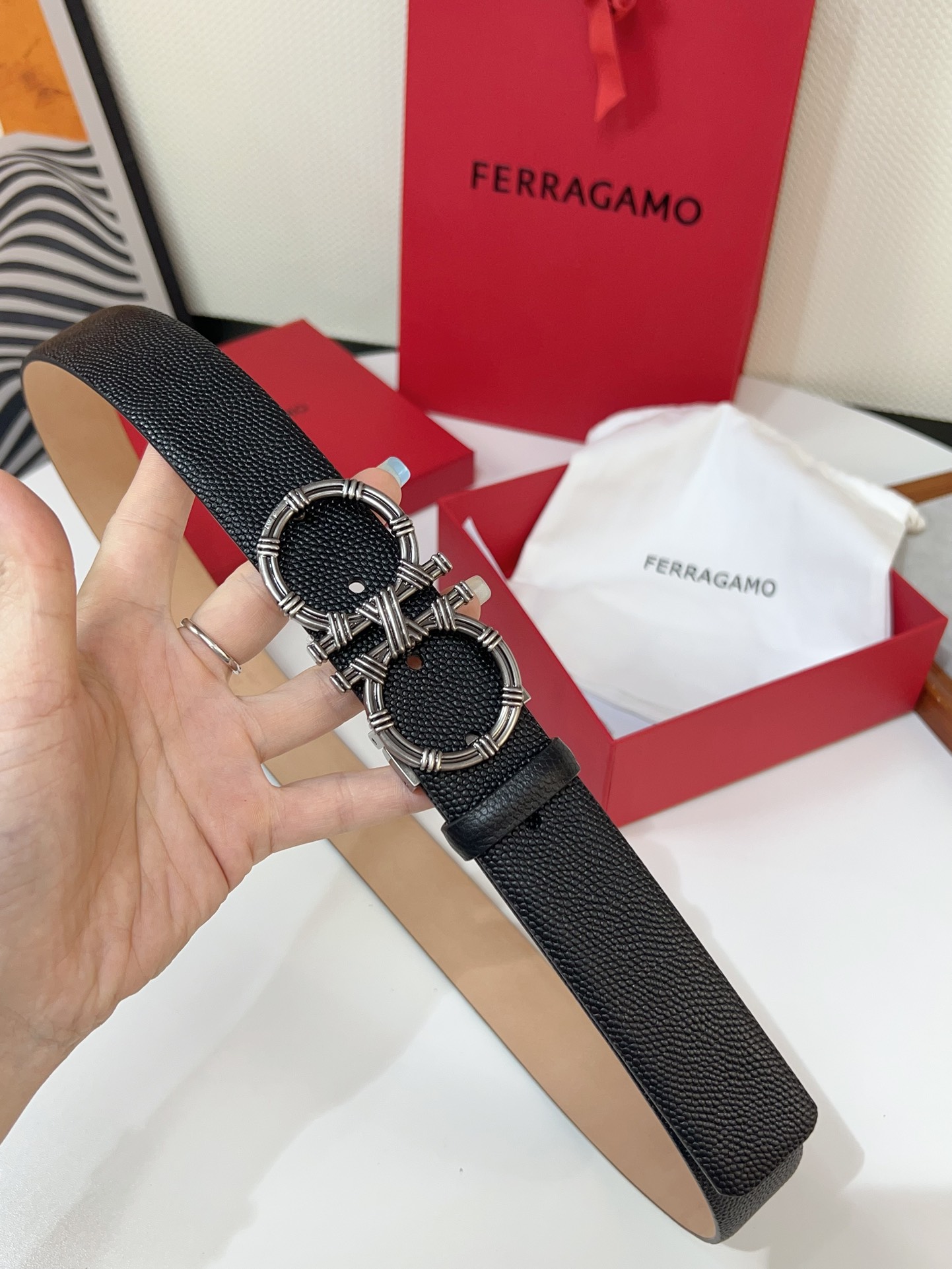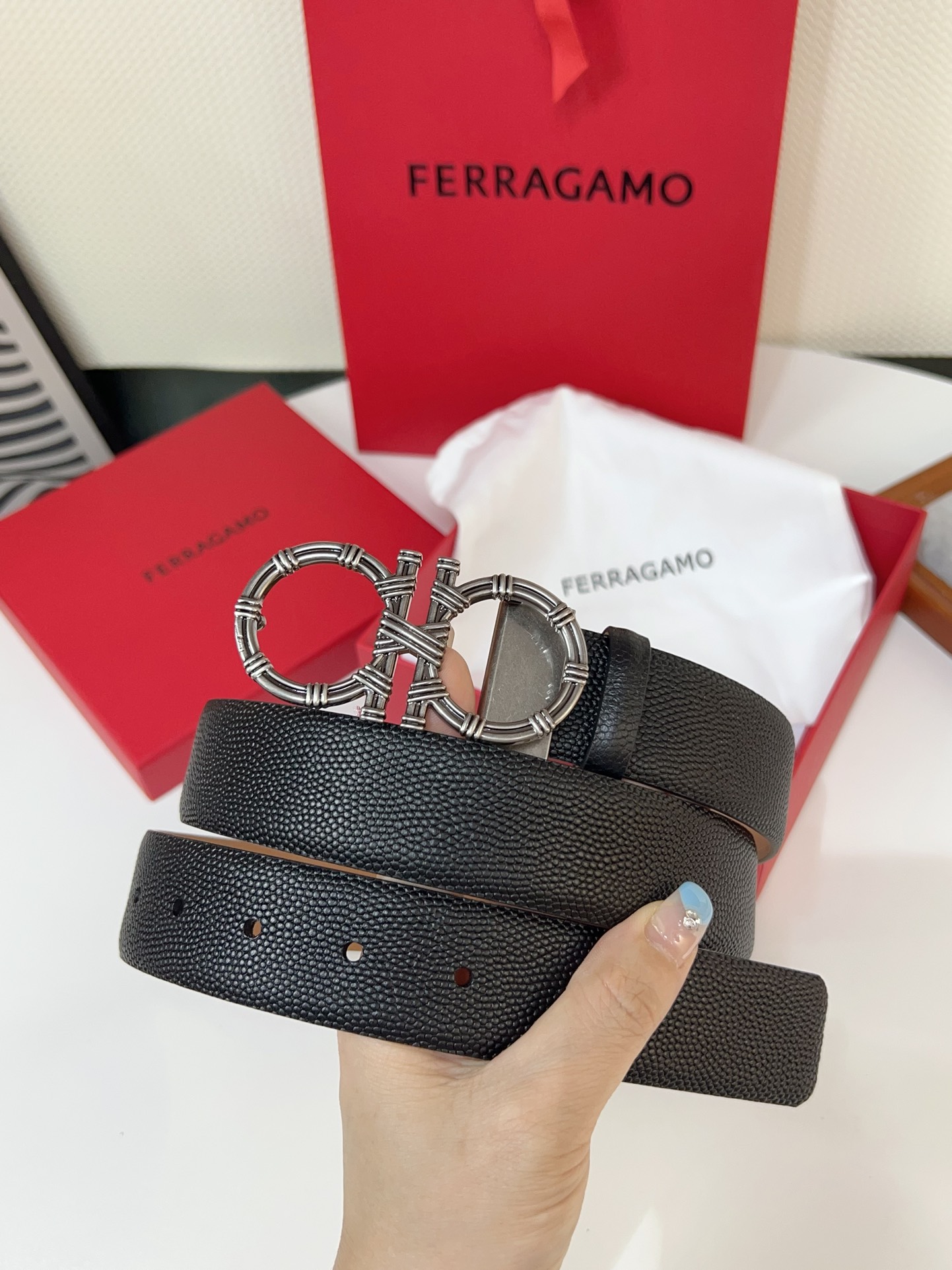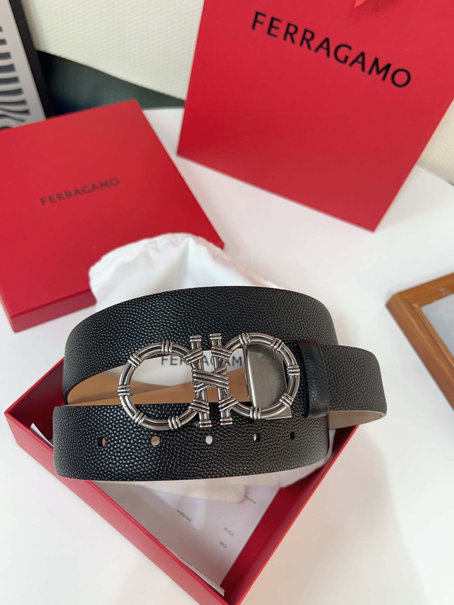 This double-sided belt is stylish and versatile, an indispensable men's accessory item. One side is made of hammered cowhide, while the other side is made of selected natural grained cowhide, adorned with a gold-finished Gancini buckle for an eye-catching touch. The interior features exquisite satin decorative details. The length is adjustable. The belt can be trimmed or additional eyelets can be added to create a tight or loose fit. 3.5 wide