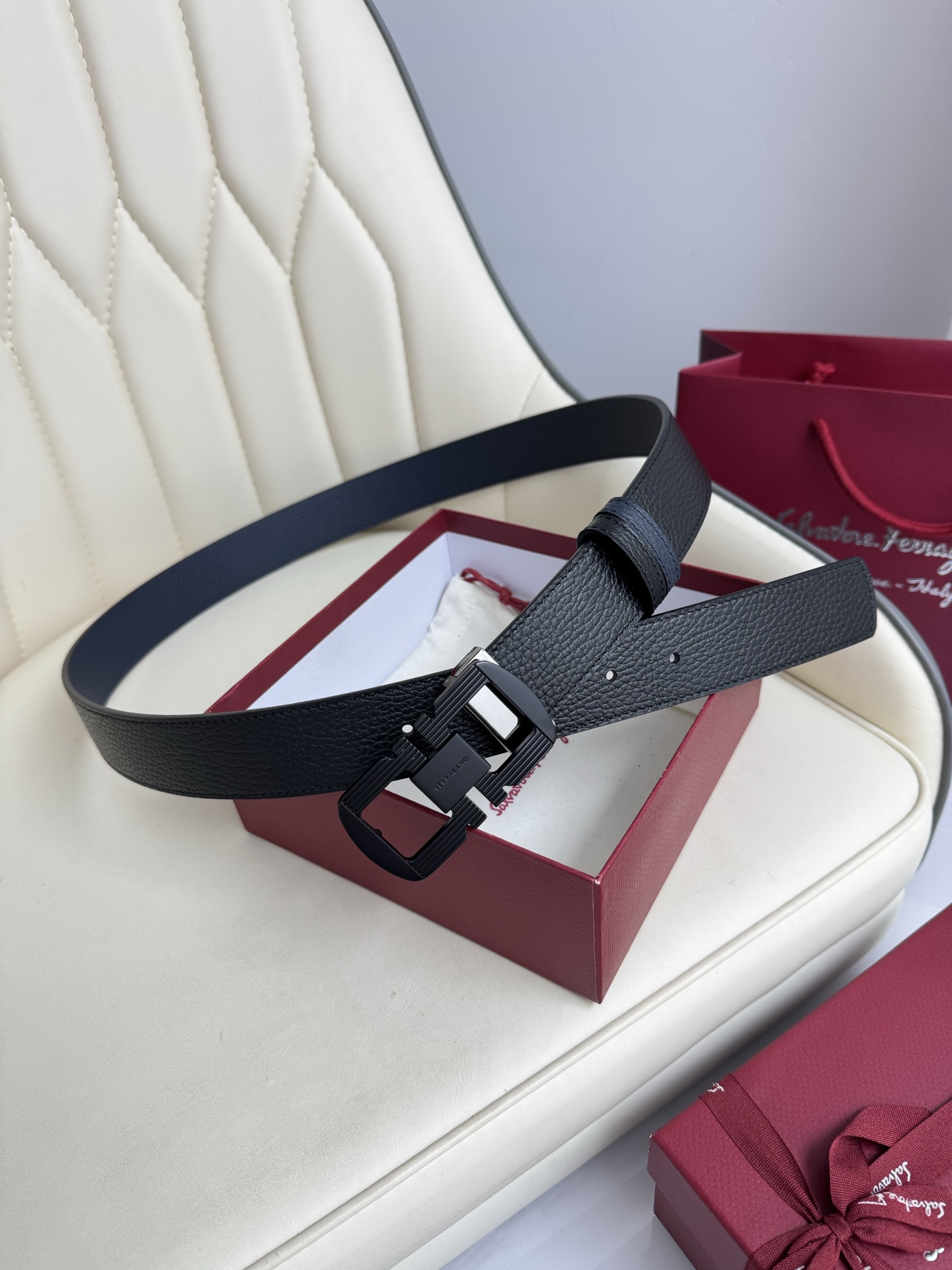 Ferragamo double-sided genuine leather belt with vacuum electroplated brass buckle. Versatile, fashionable, and includes full packaging.