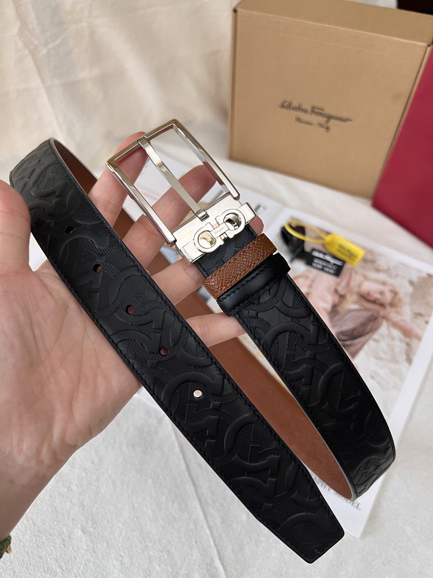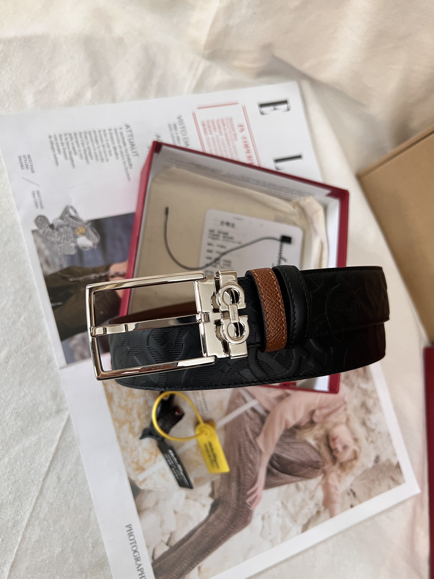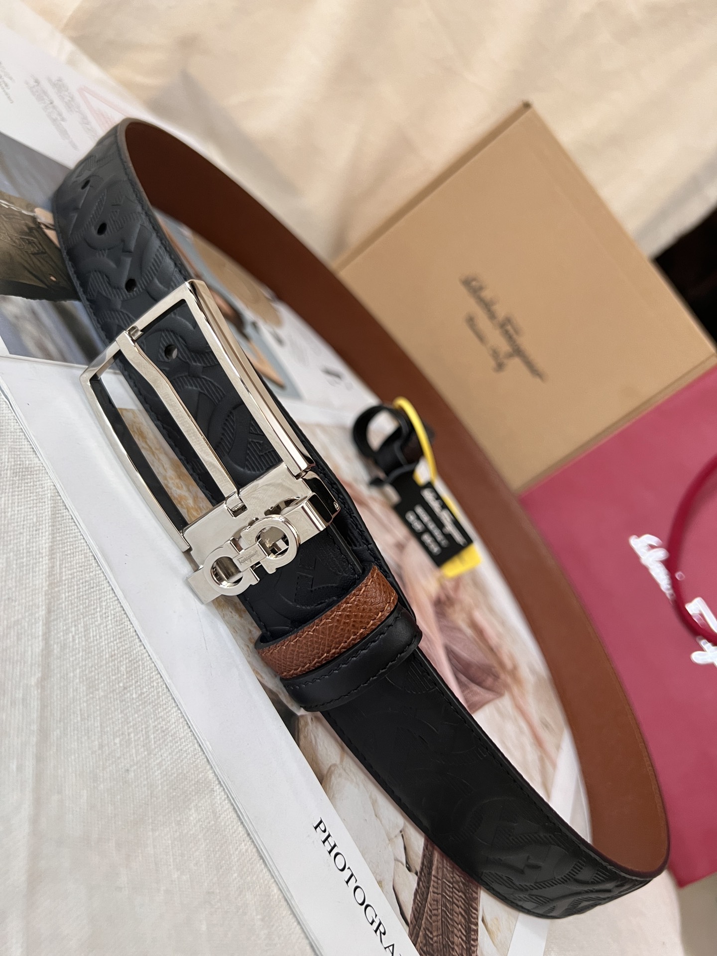 This belt is made of embossed calfskin, suitable for both business and casual occasions, easily creating a classic daily elegant style. It features a fashionable shiny palladium gold rectangular buckle, and a single belt loop adorned with the Ferragamo classic Gancini pattern. The double-sided, dual-color design is adjustable in length, ensuring flexibility and versatility, highlighting a fashionable style. 3.5 wide