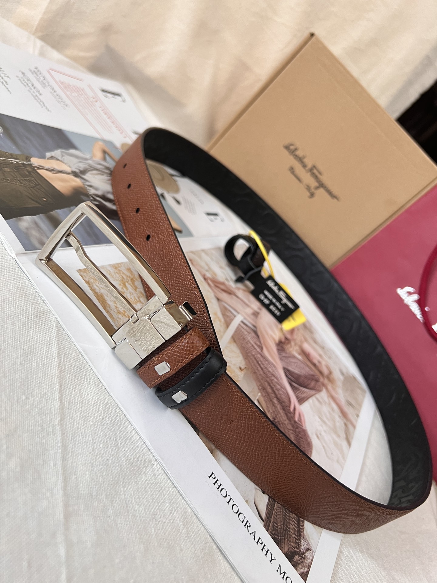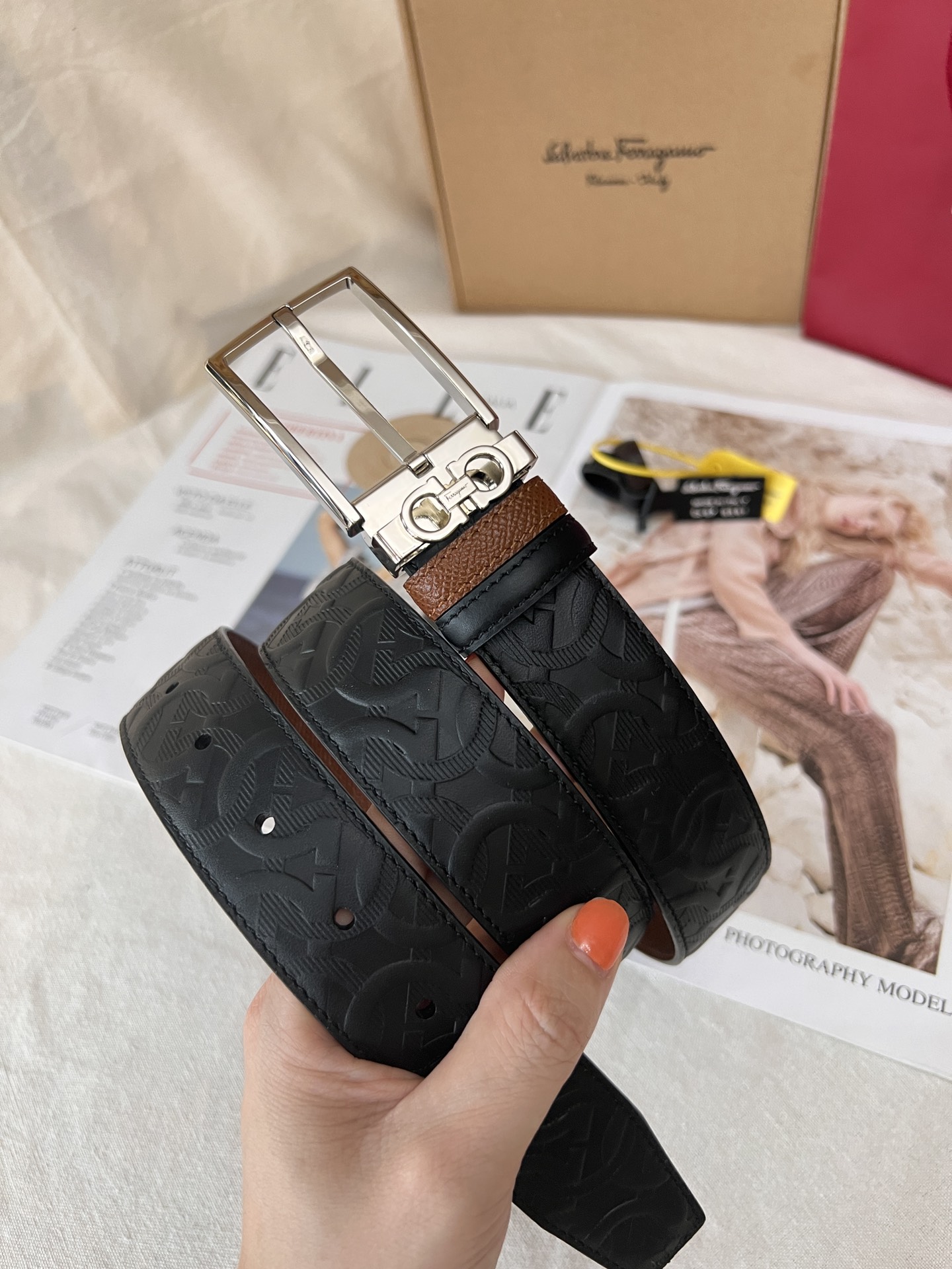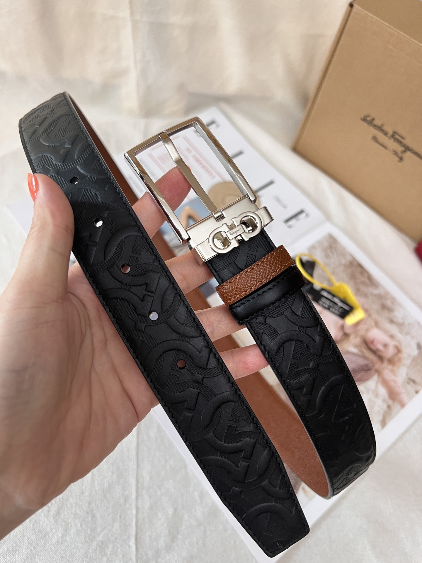 This belt is made of embossed calfskin, suitable for both business and casual occasions, easily creating a classic daily elegant style. It features a fashionable shiny palladium gold rectangular buckle, and a single belt loop adorned with the Ferragamo classic Gancini pattern. The double-sided, dual-color design is adjustable in length, ensuring flexibility and versatility, highlighting a fashionable style. 3.5 wide