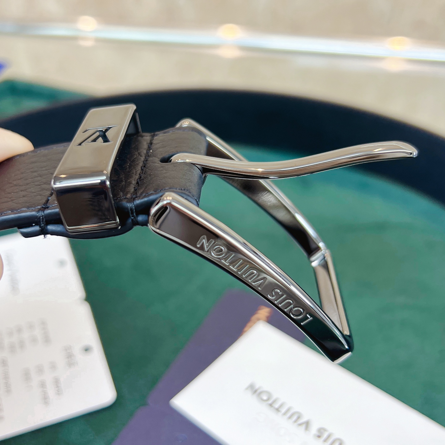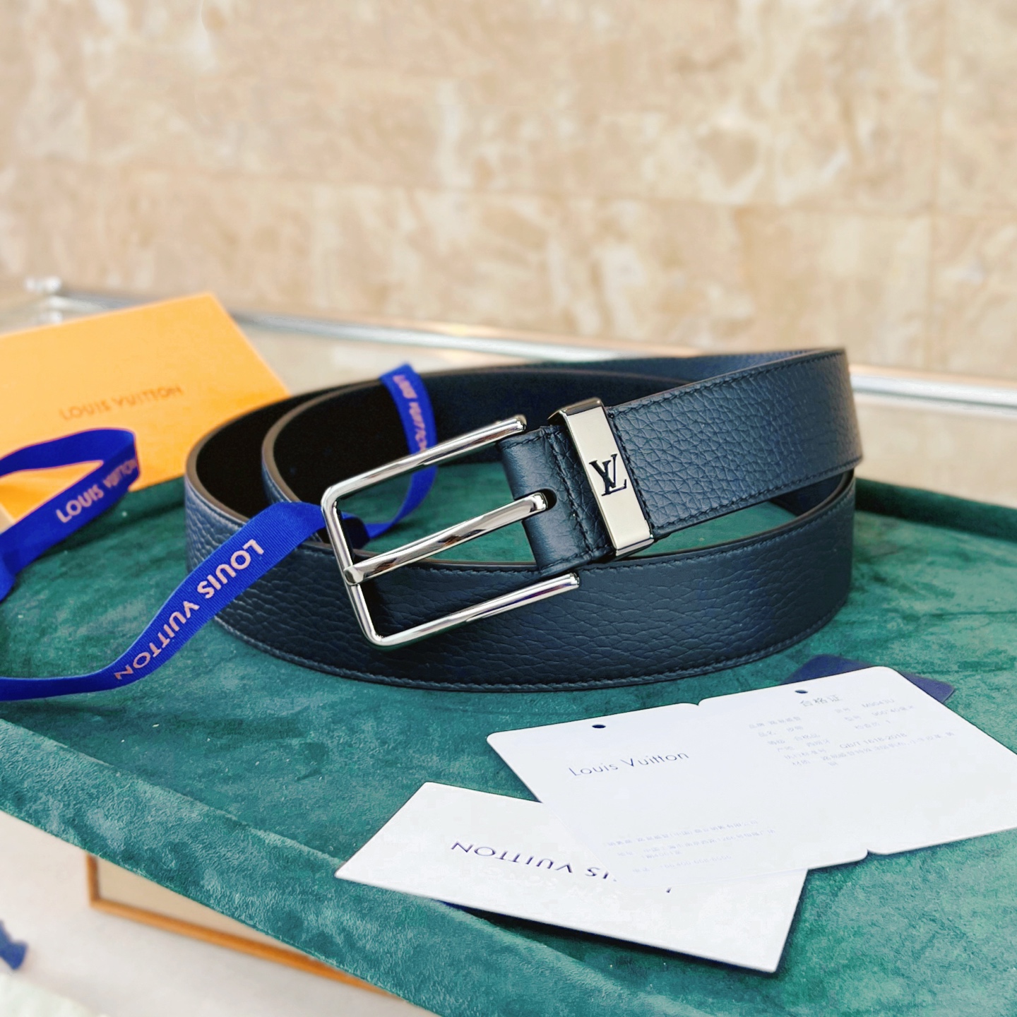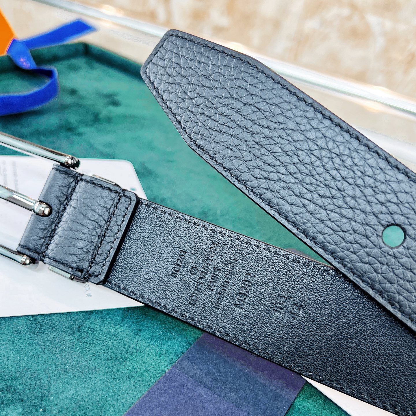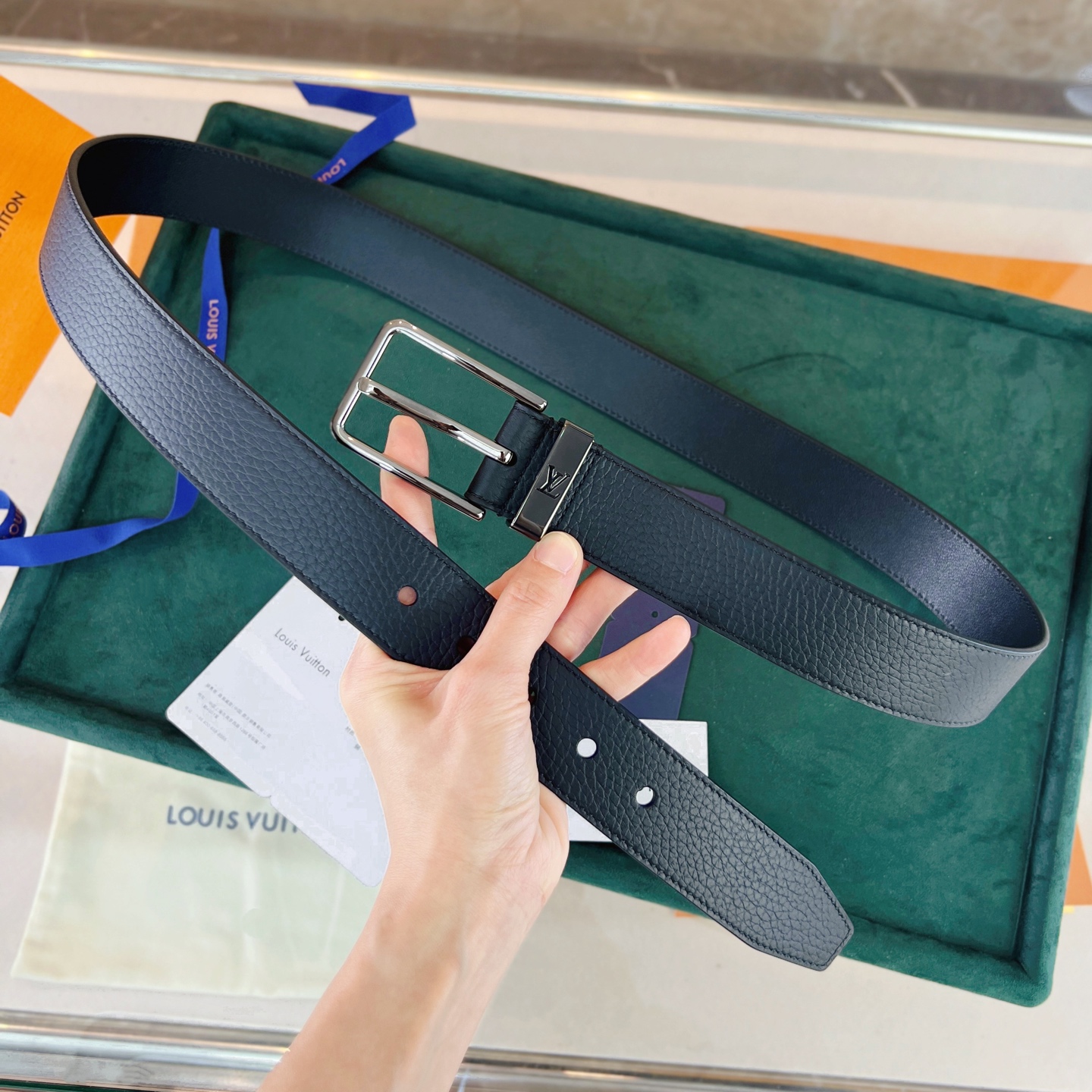 This Taurillon leather belt features a metal buckle with a cut-out LV logo, creating a calm and low-key gentlemanly style