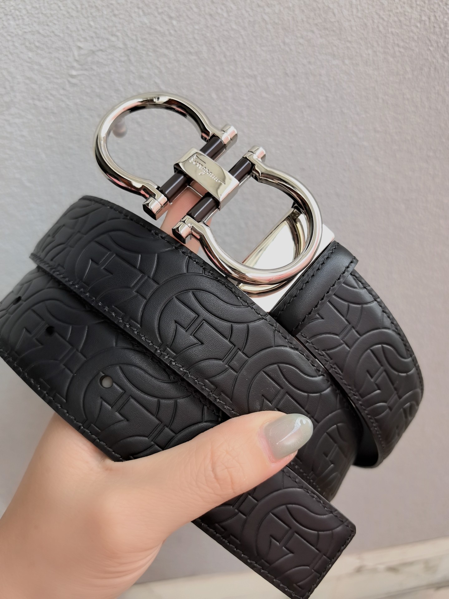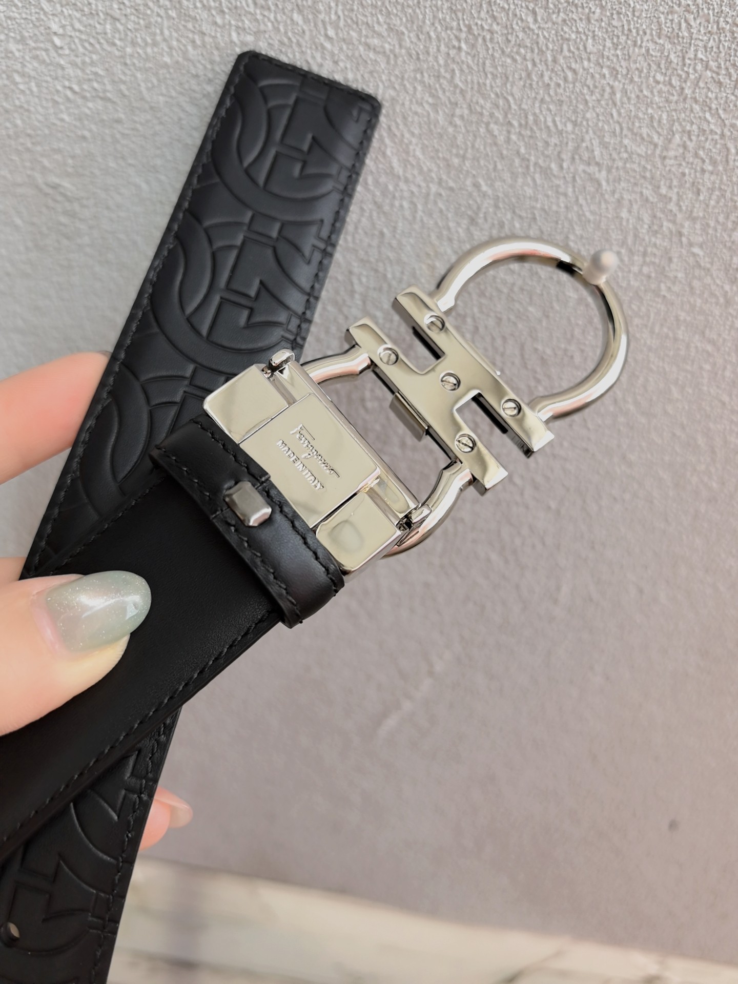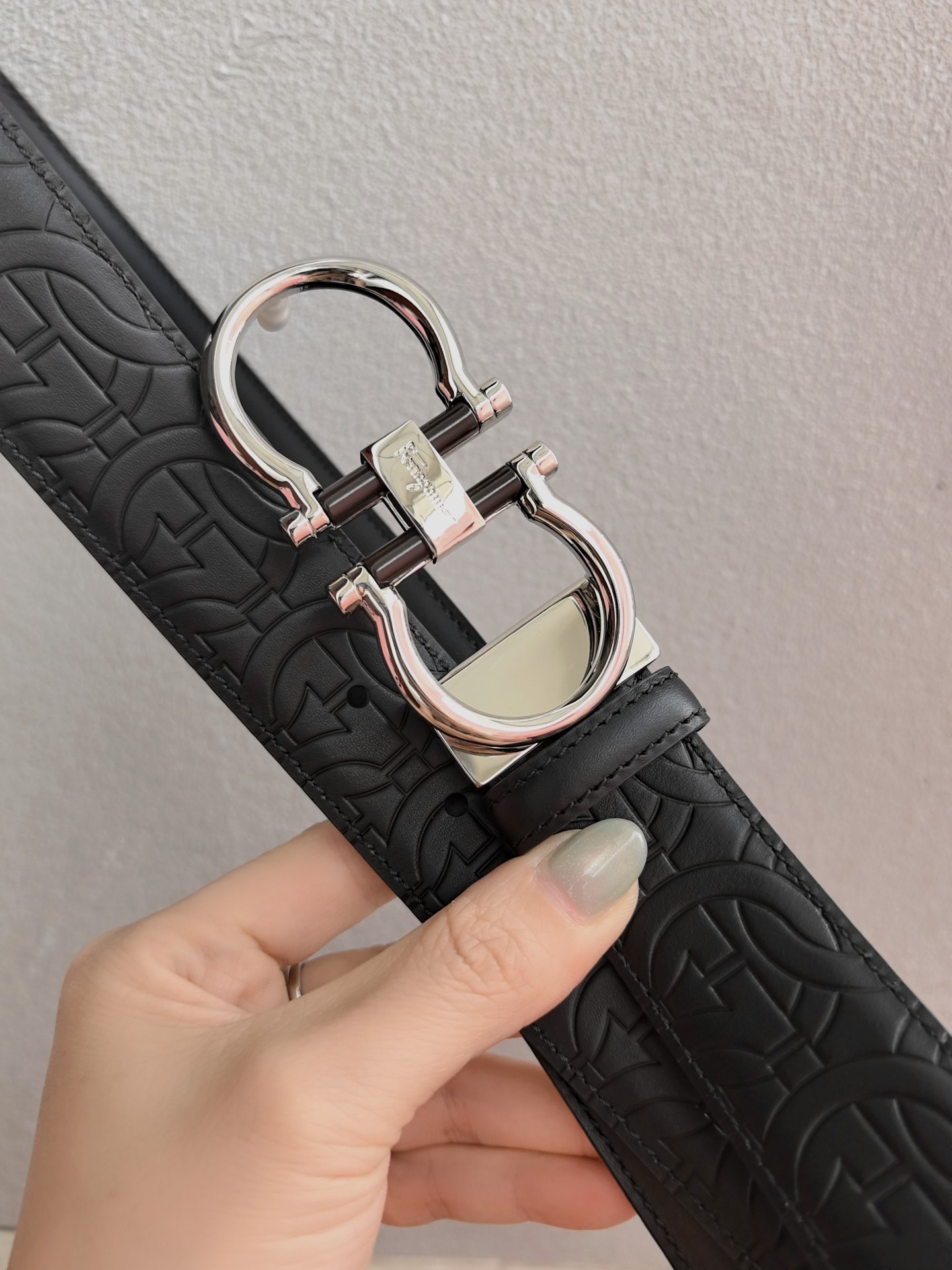 This belt features a double-sided design, with contrasting texture effects on both sides. One side is treated with wax immersion and natural tannin dyeing, resulting in a delicate and refined finish. The other side undergoes grinding and aniline dyeing, creating a luxurious and captivating texture. The painted buckle complements the Gancio silhouette, adorned with a central rectangular cutout pattern. The length is adjustable, allowing the belt to be trimmed to size or additional eyelets to be added. 3.5 wide