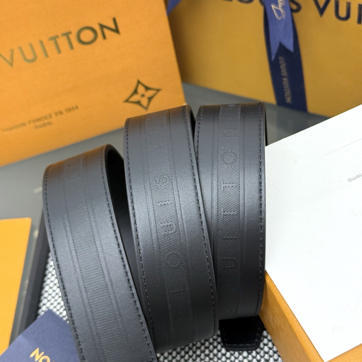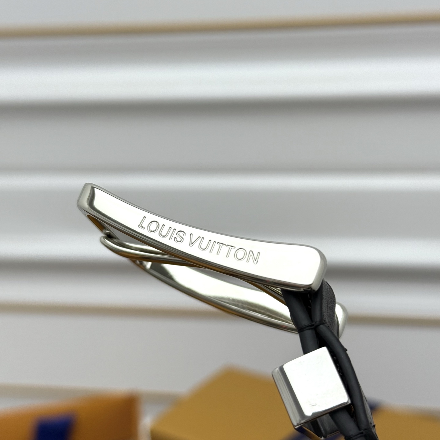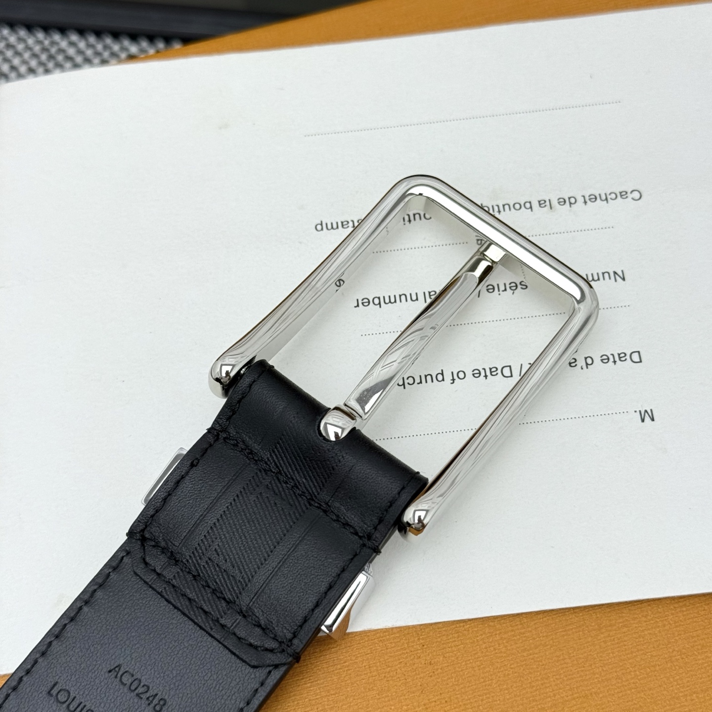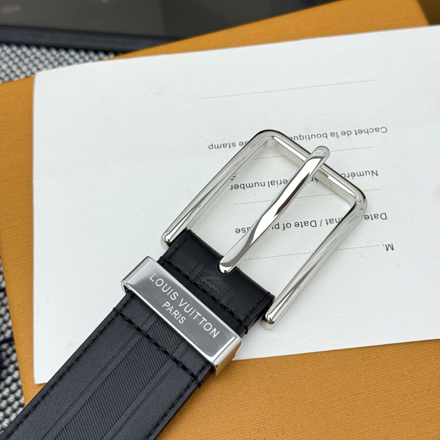 Heritage Italian original factory leather belt is made of grained and smooth leather, featuring a brushed metal curved buckle that highlights an elegant style. The LV pin adorns the end, making it suitable for formal attire. Width: 3.5cm