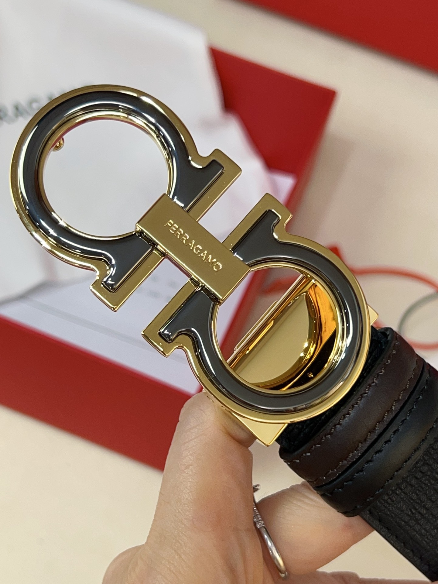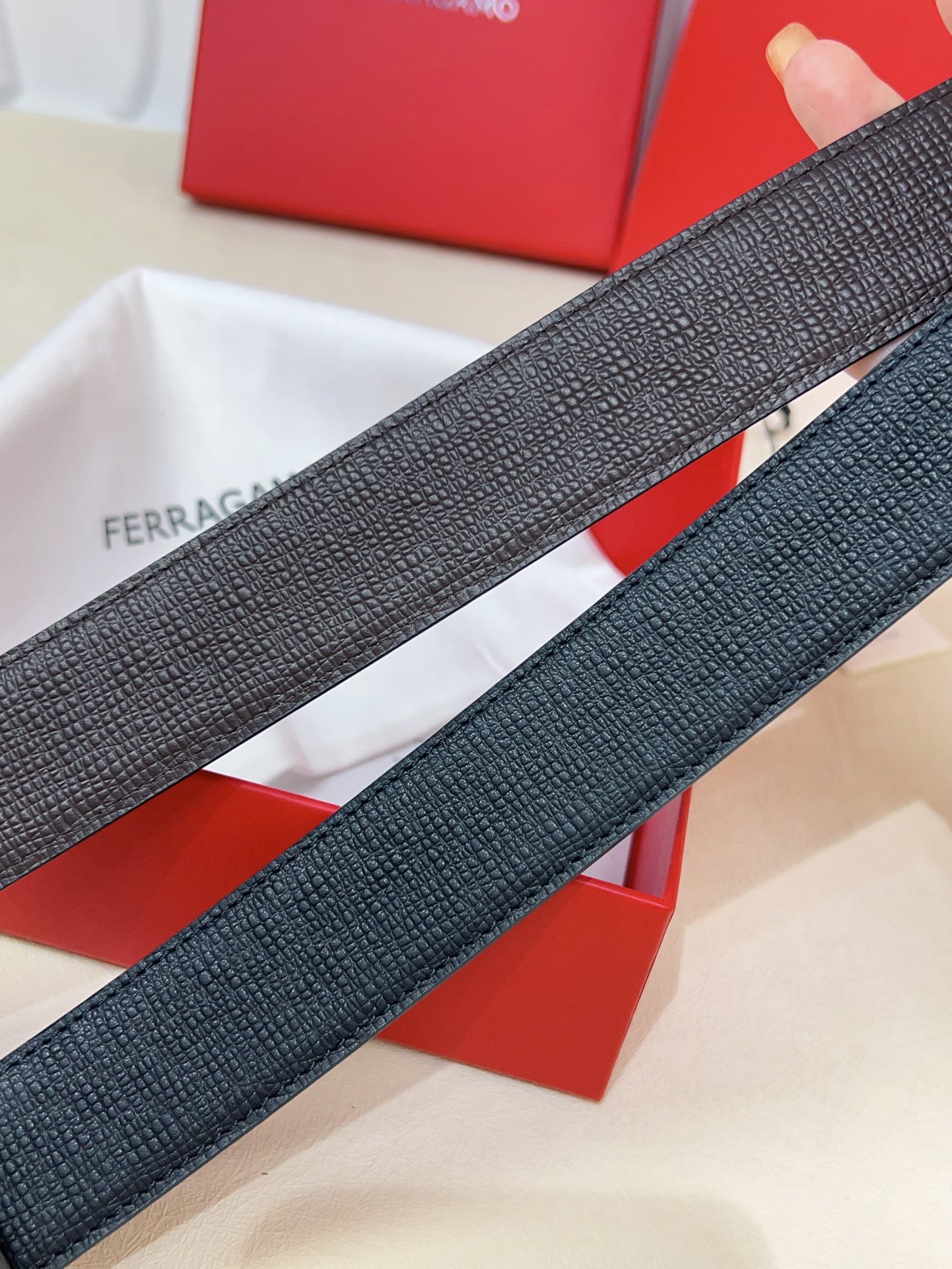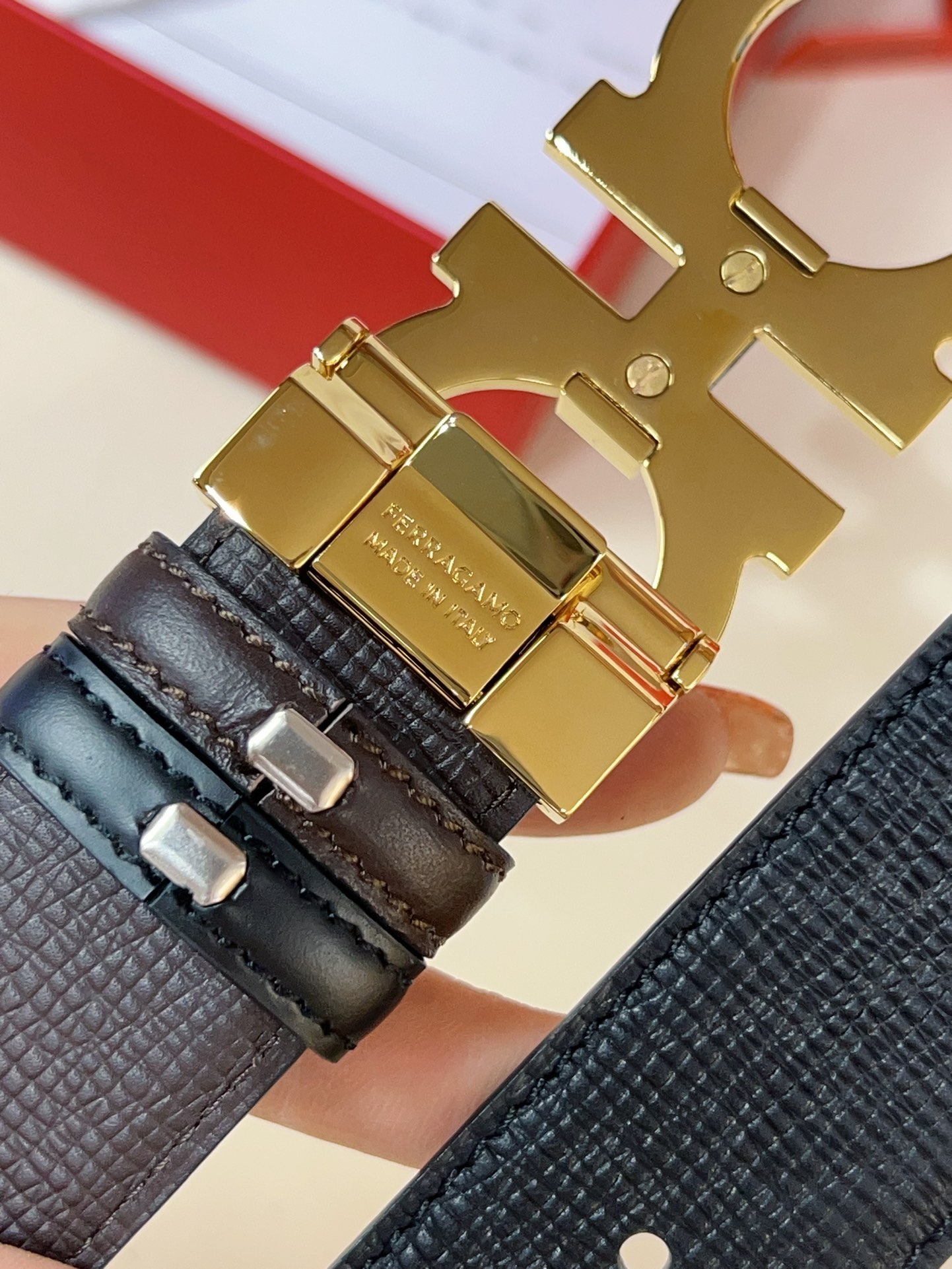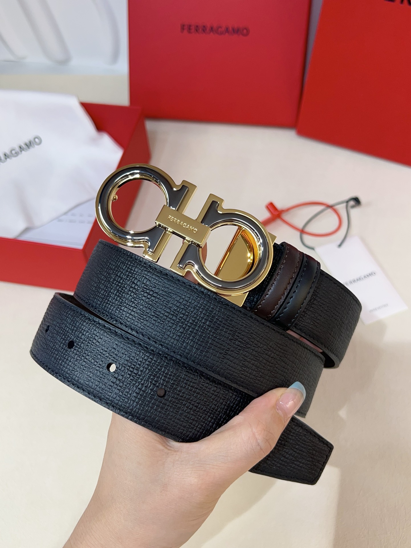 This double-sided belt is stylish and versatile, an indispensable men's accessory item. One side is made of hammered calfskin, while the other side uses selected natural grained calfskin, adorned with a gold-finished Gancini buckle for an eye-catching touch, and features exquisite satin decorative details on the inside. The length is adjustable. The belt can be trimmed or additional eyelets can be added to create a tight or loose fit, 3.5 wide.
