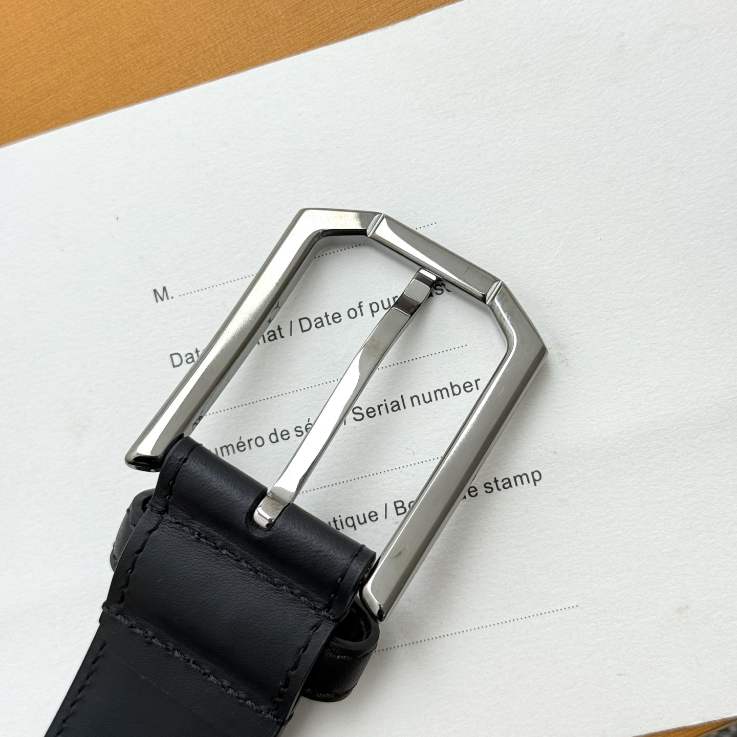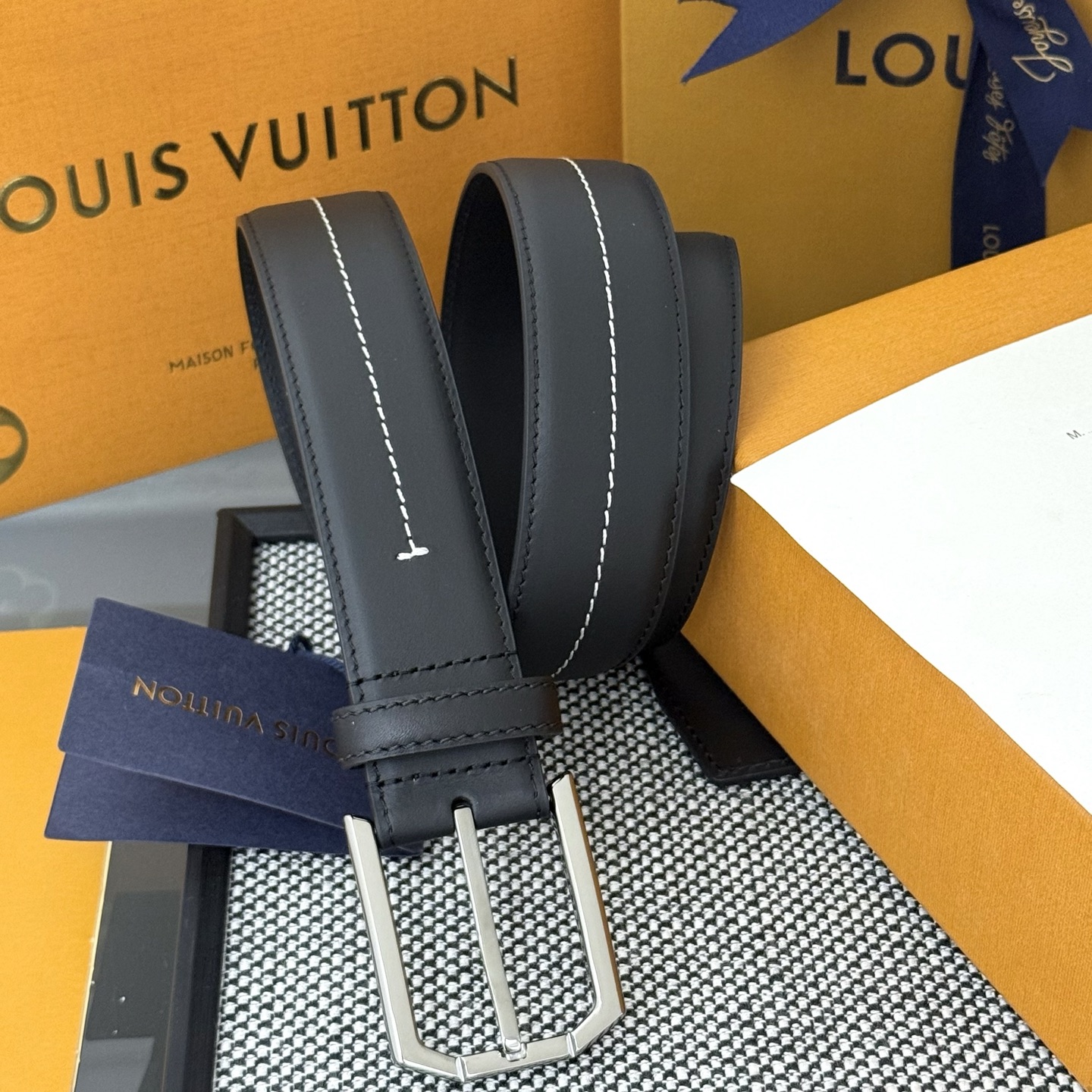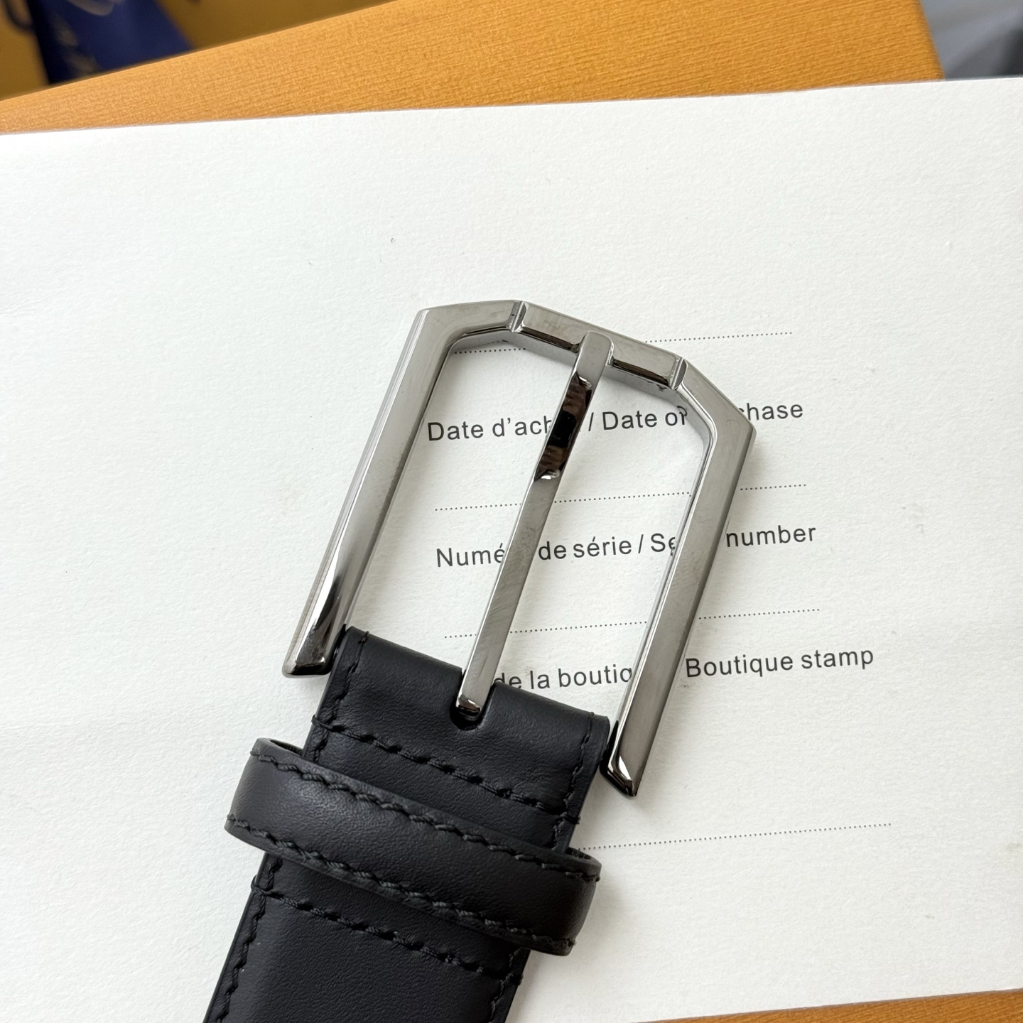 Heritage Italian original factory leather belt. The belt is made of grained and smooth leather, featuring a brushed metal curved buckle that highlights an elegant style. An LV decorative pin adorns the end, making it suitable for pairing with formal attire. Width: 3.5cm