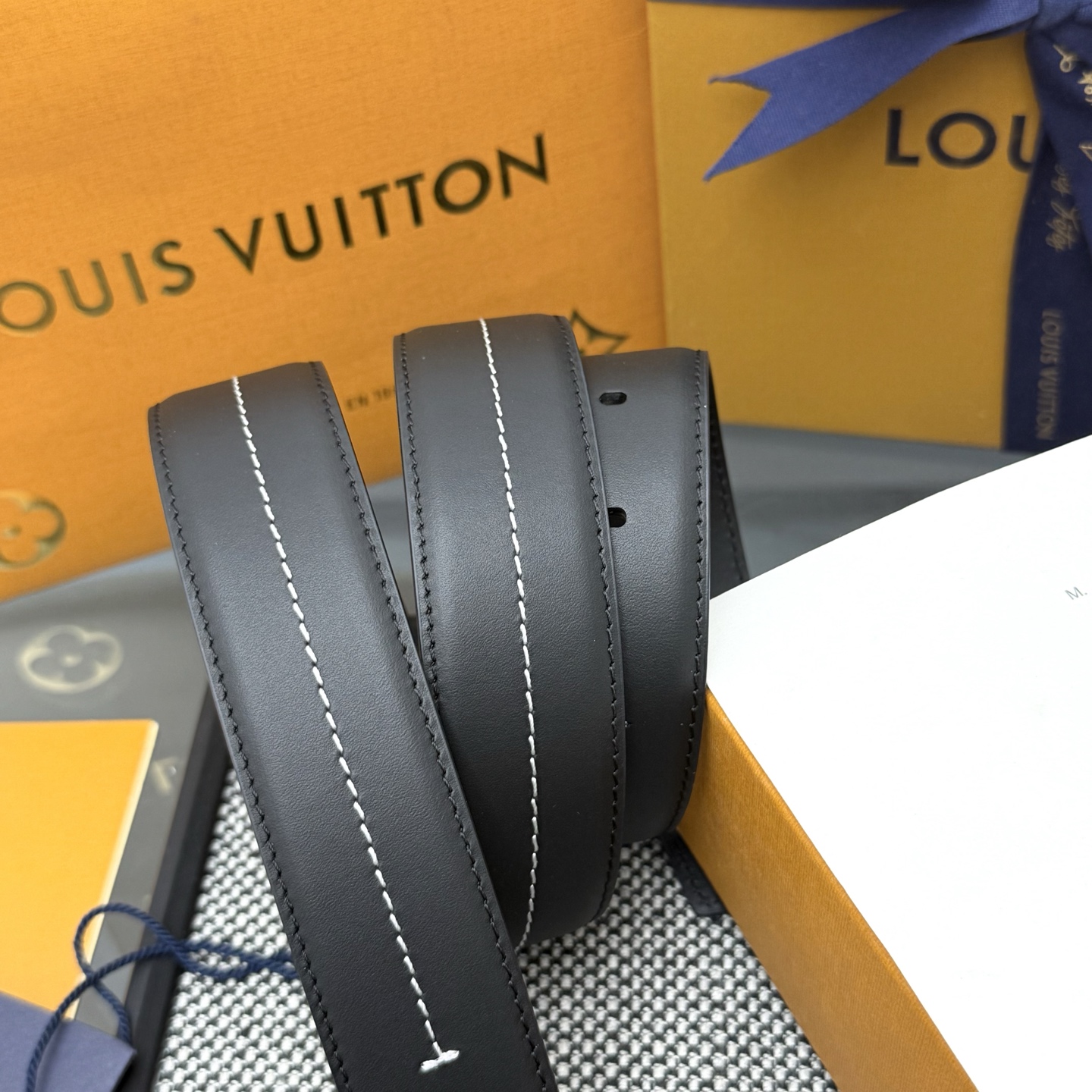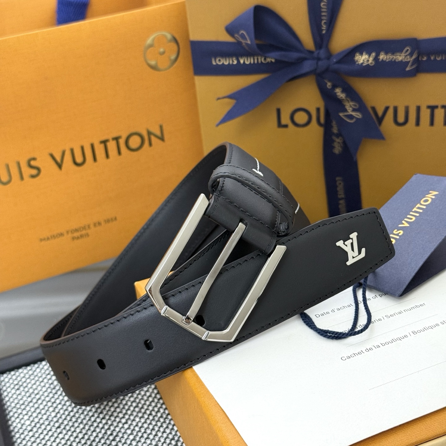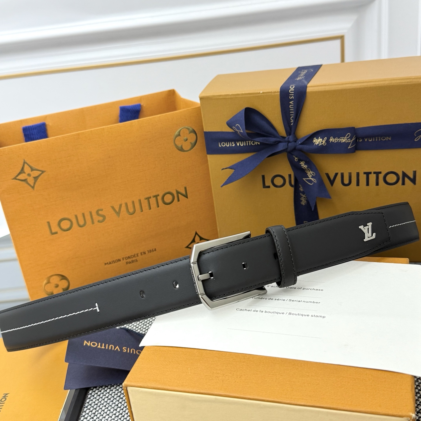 Heritage Italian original factory leather belt. The belt is made of grained and smooth leather, featuring a brushed metal curved buckle that highlights an elegant style. An LV decorative pin adorns the end, making it suitable for pairing with formal attire. Width: 3.5cm