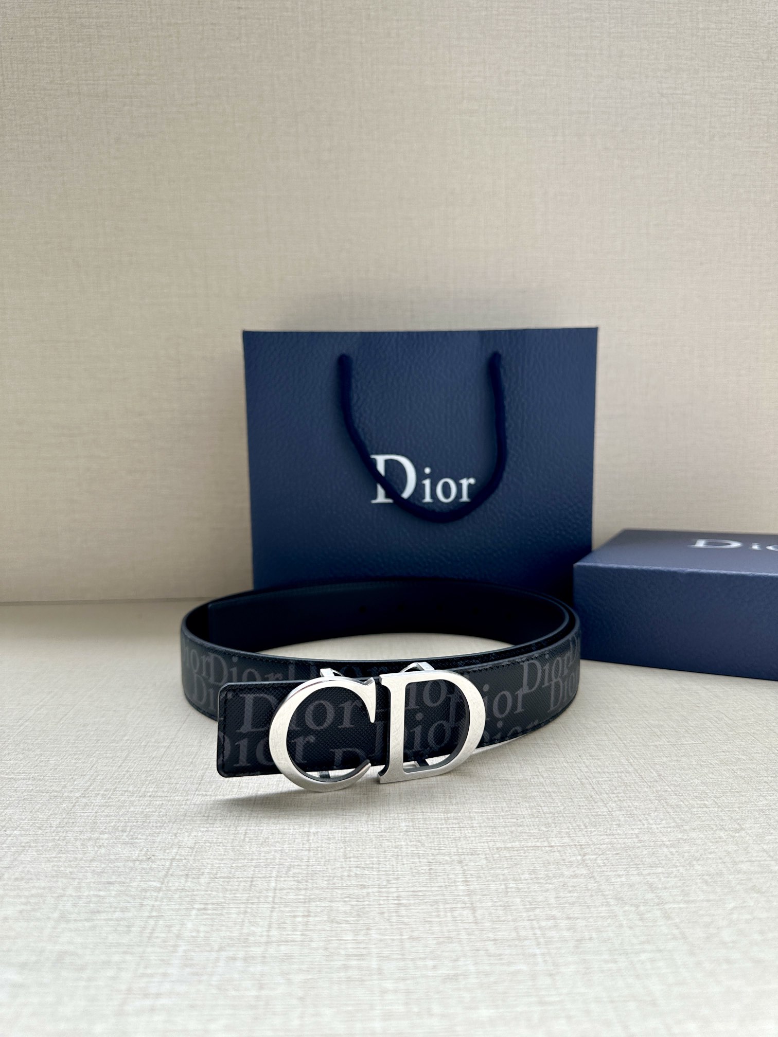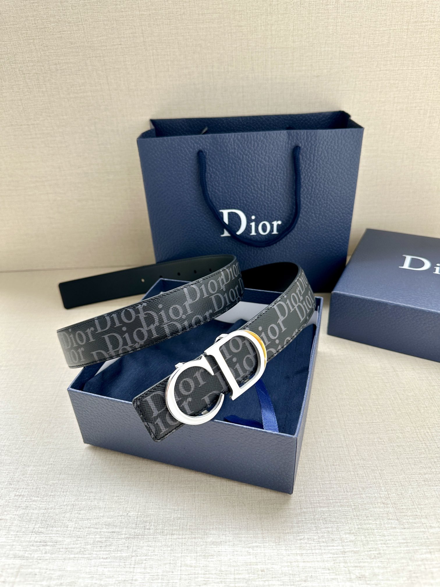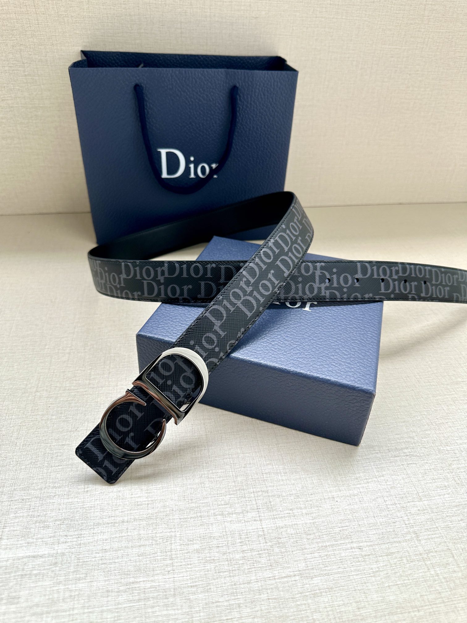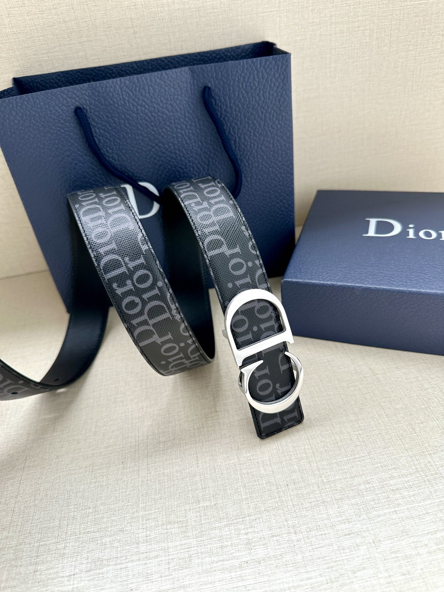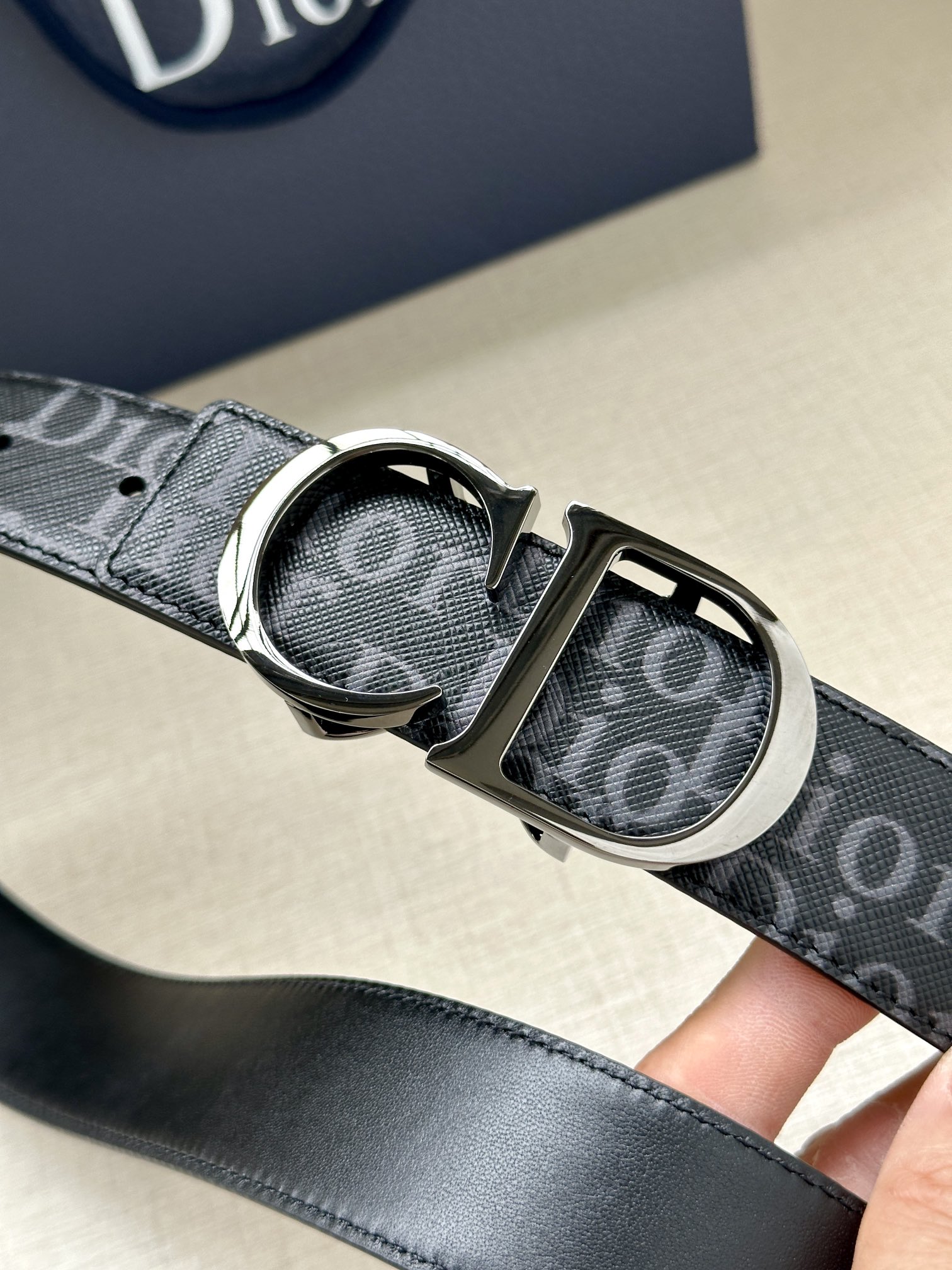 This 35mm reversible belt combines elegance with contemporary style. Featuring a double-sided design, one side is crafted from black Oblique Galaxy printed leather, while the other side is made of smooth black calfskin. The Oblique Galaxy printed leather showcases a cut-out Oblique pattern on the smooth calfskin, highlighting Dior's exceptional craftsmanship. Enhanced with reflective lining, it can be paired with various 35mm belt buckles to create a distinctive and versatile accessory.