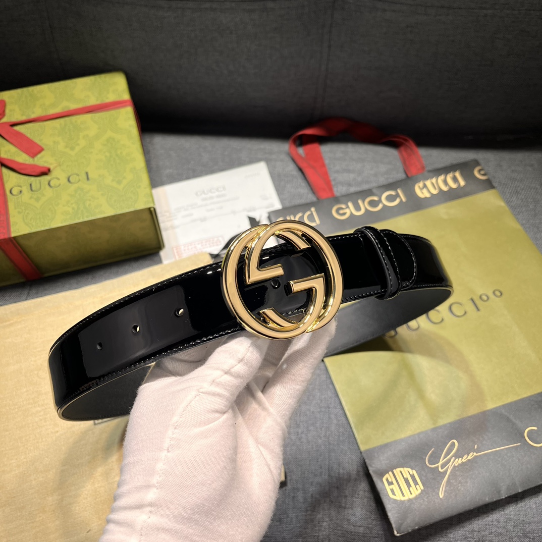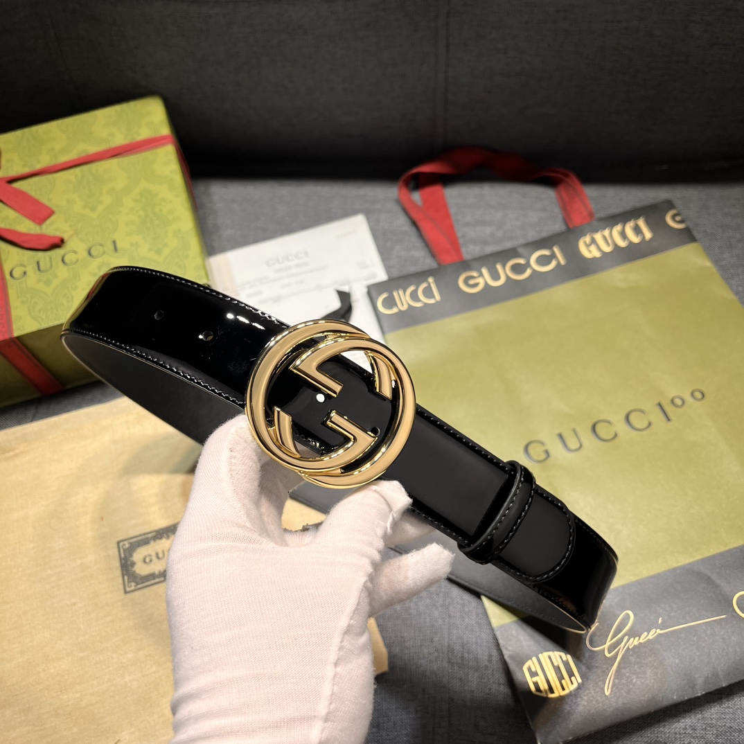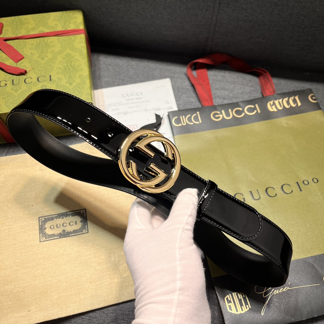 Gucci width 4.0cm new model classic details and modern elements add eye-catching highlights to Gucci's new series. Skillfully integrated with classic letter interlocking shape accessories, paying tribute to the brand founder Mr. Guccio Gucci. This belt is made of top-layer leather, meticulously decorated with GG belt buckle
