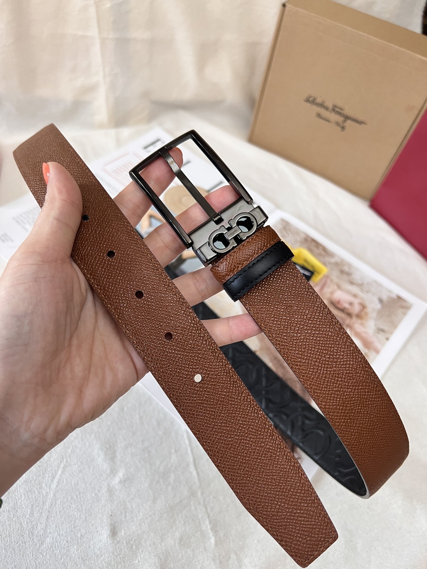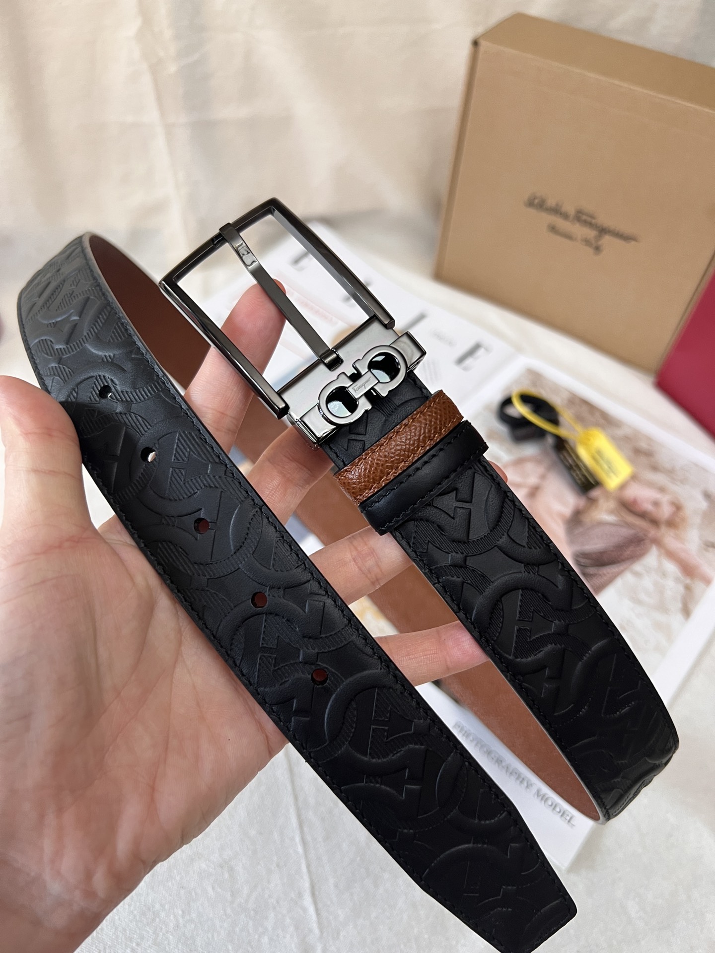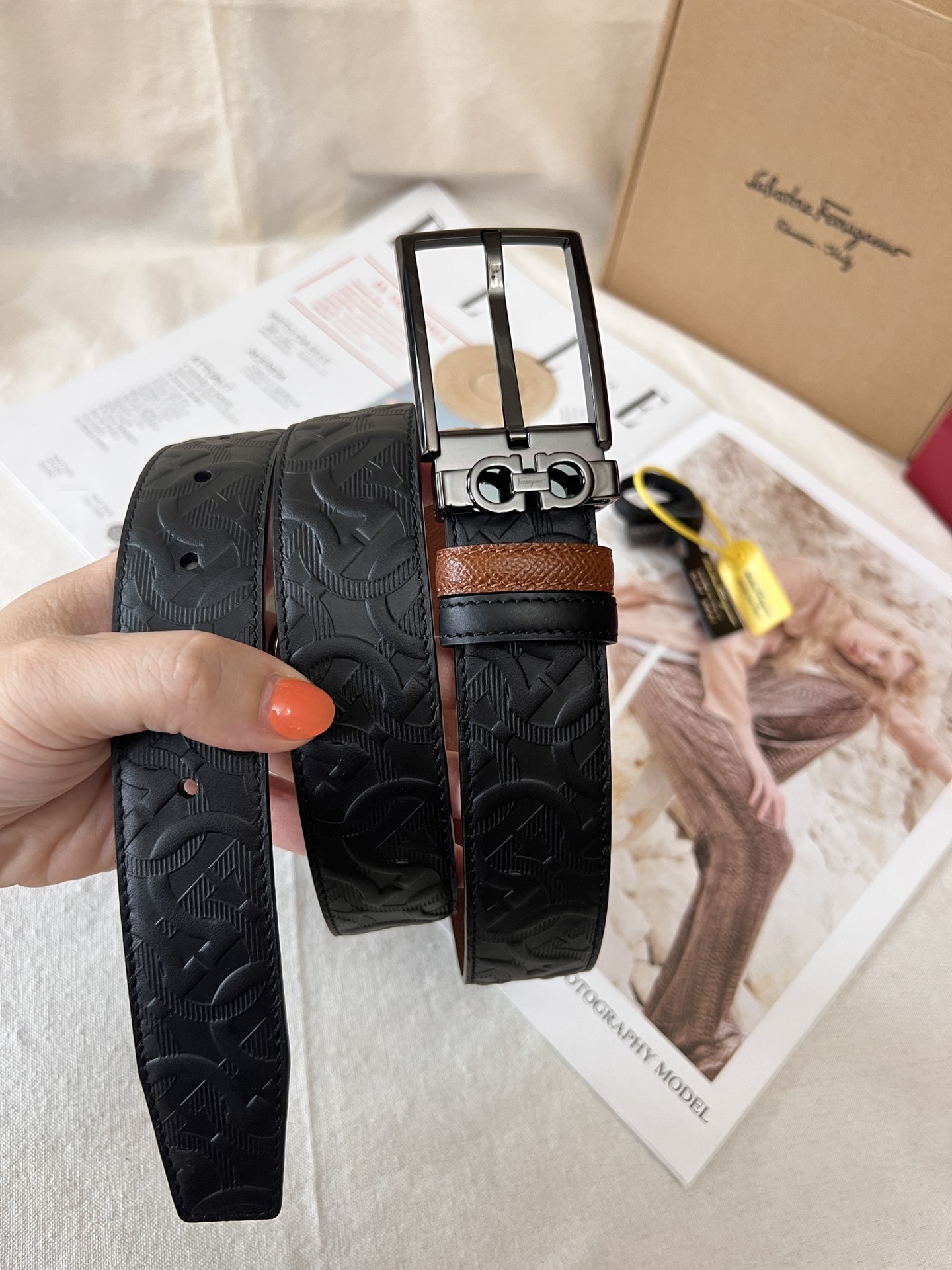 This belt is made of embossed calfskin and is suitable for both business and casual occasions, easily creating a classic daily elegant style. It features a fashionable shiny palladium gold rectangular buckle, and a single belt loop adorned with the Ferragamo classic Gancini pattern. The double-sided, dual-color design and adjustable length ensure versatility and highlight a fashionable style. 3.5 wide