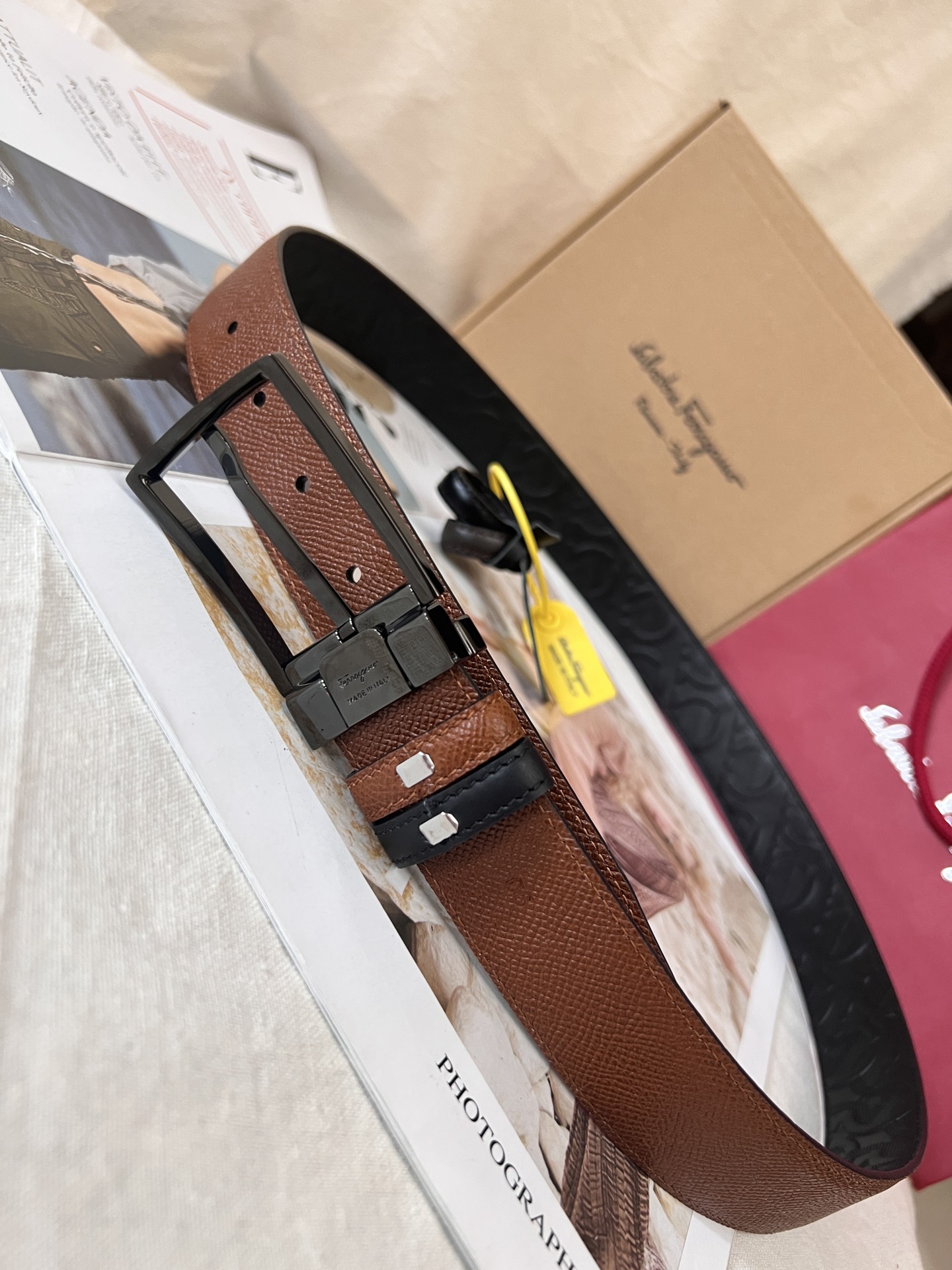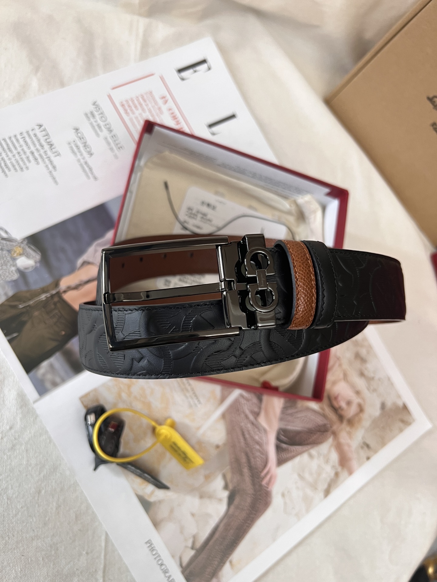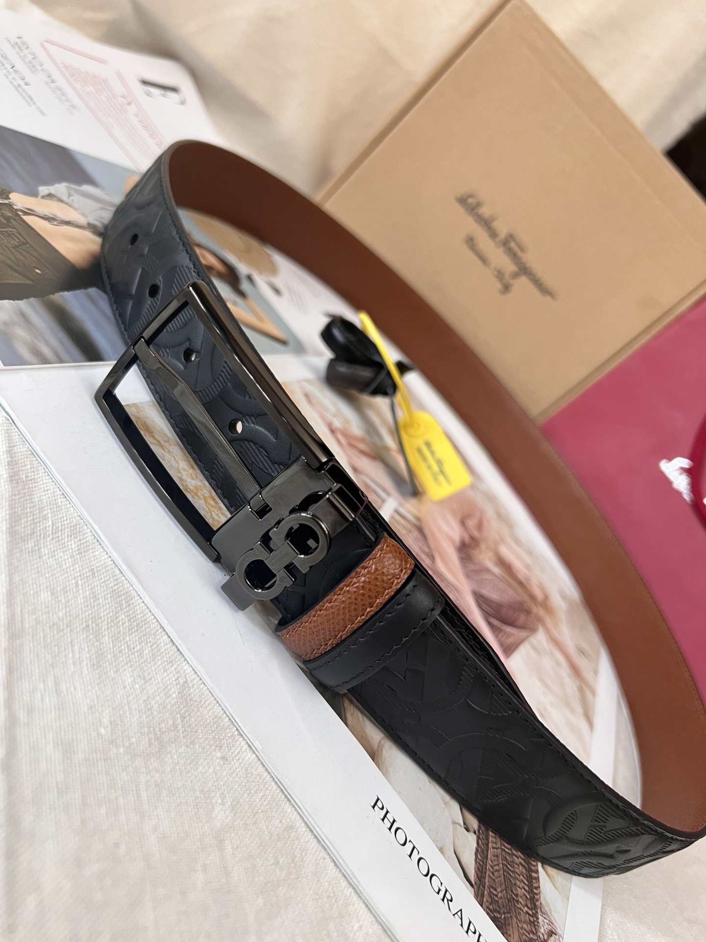 This belt is made of embossed calfskin and is suitable for both business and casual occasions, easily creating a classic daily elegant style. It features a fashionable shiny palladium gold rectangular buckle, and a single belt loop adorned with the Ferragamo classic Gancini pattern. The double-sided, dual-color design and adjustable length ensure versatility and highlight a fashionable style. 3.5 wide