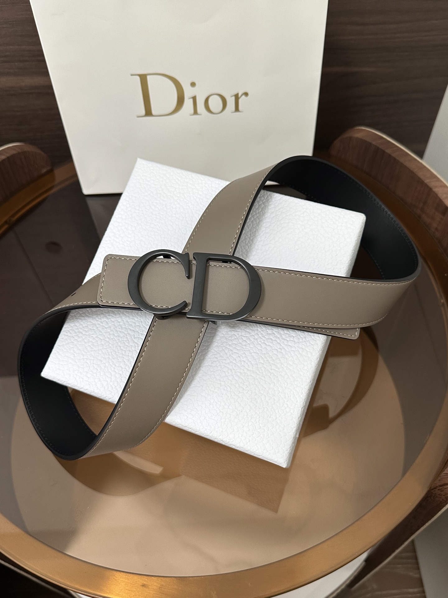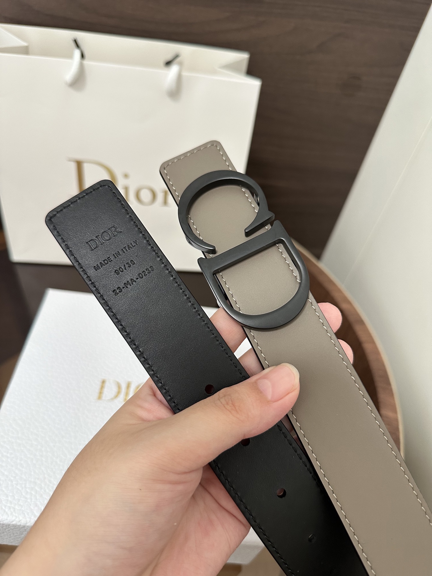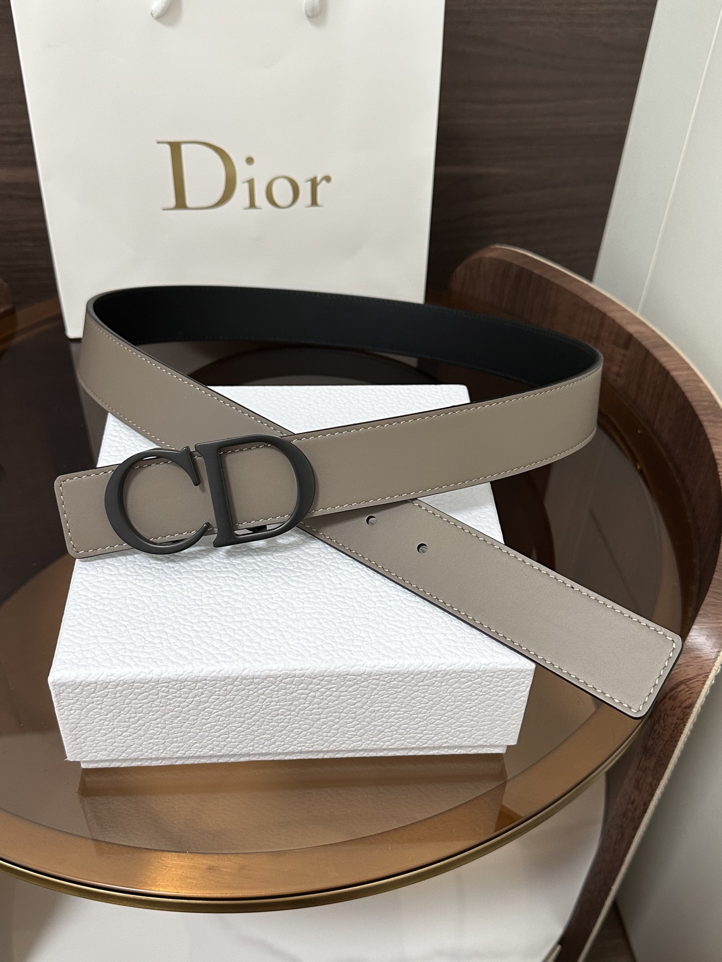 DI0R New Double-sided Belt This 35 mm double-sided belt combines elegant temperament with modern style. Both sides are meticulously crafted from calf leather. It can be paired with various 35 mm belt buckles to create distinctive, fashionable, and versatile pieces.