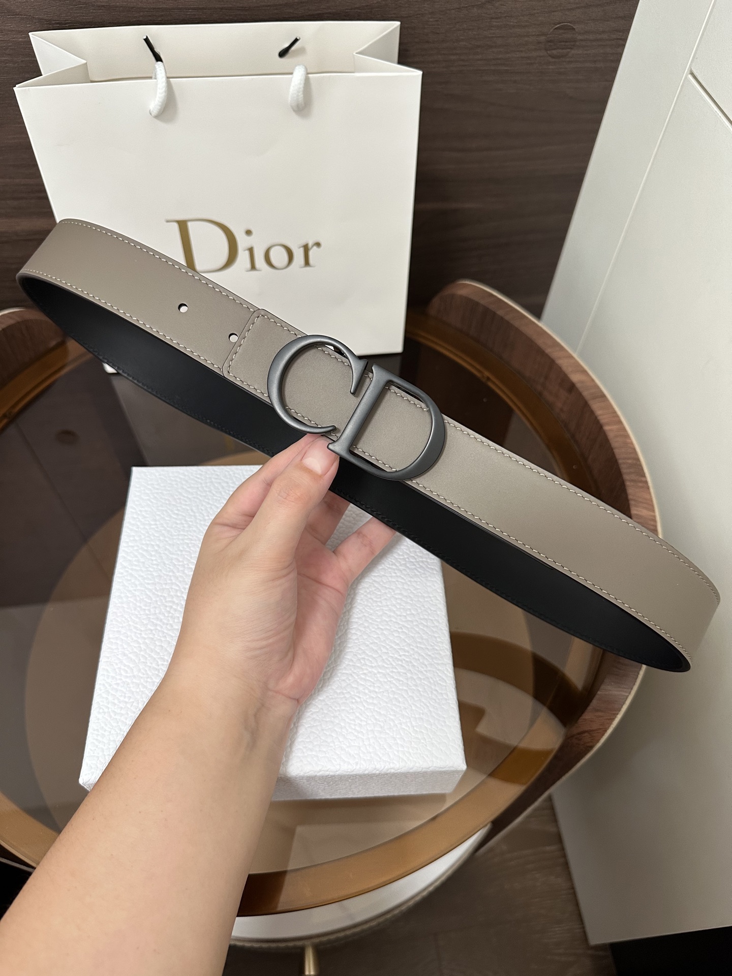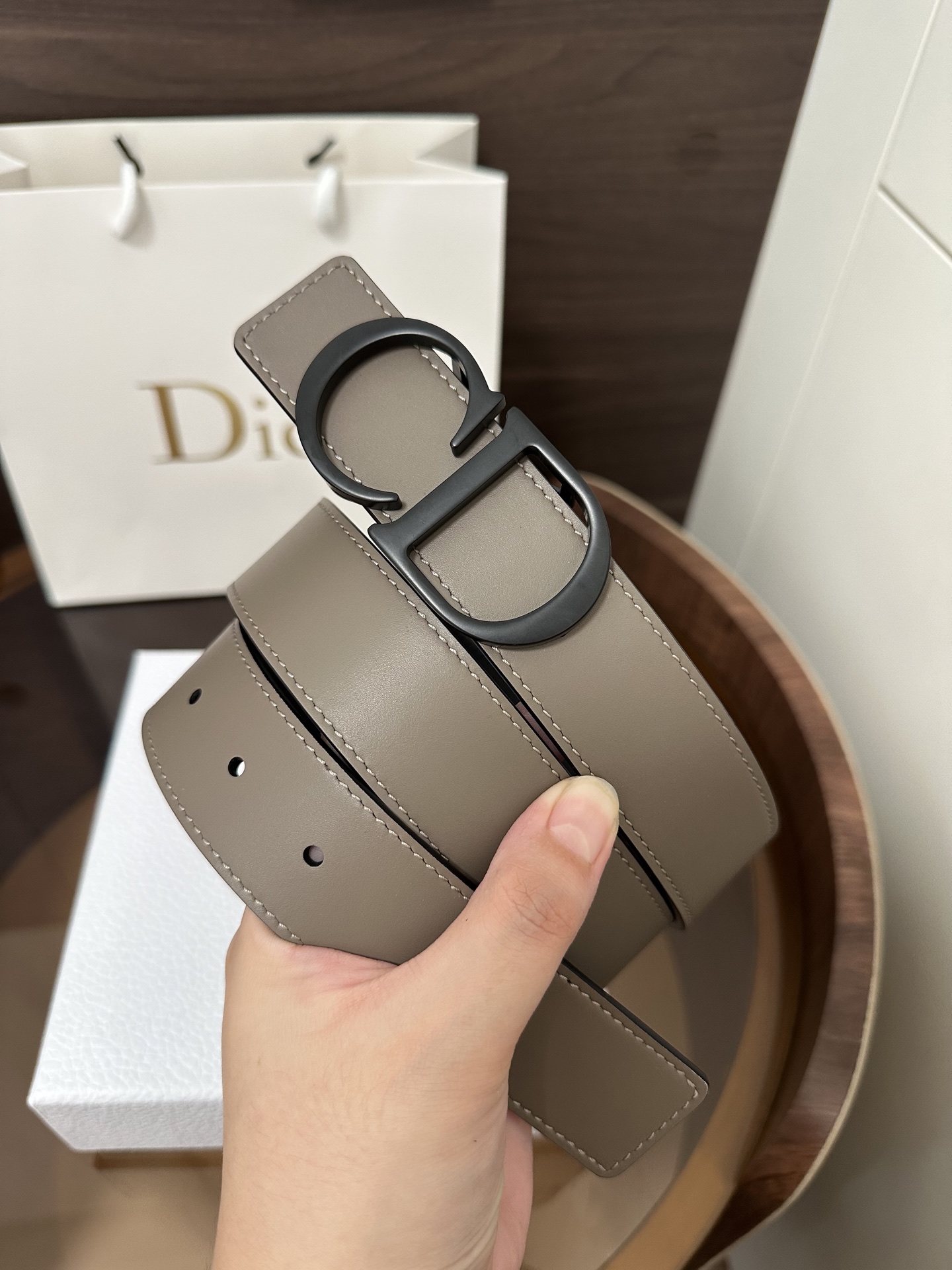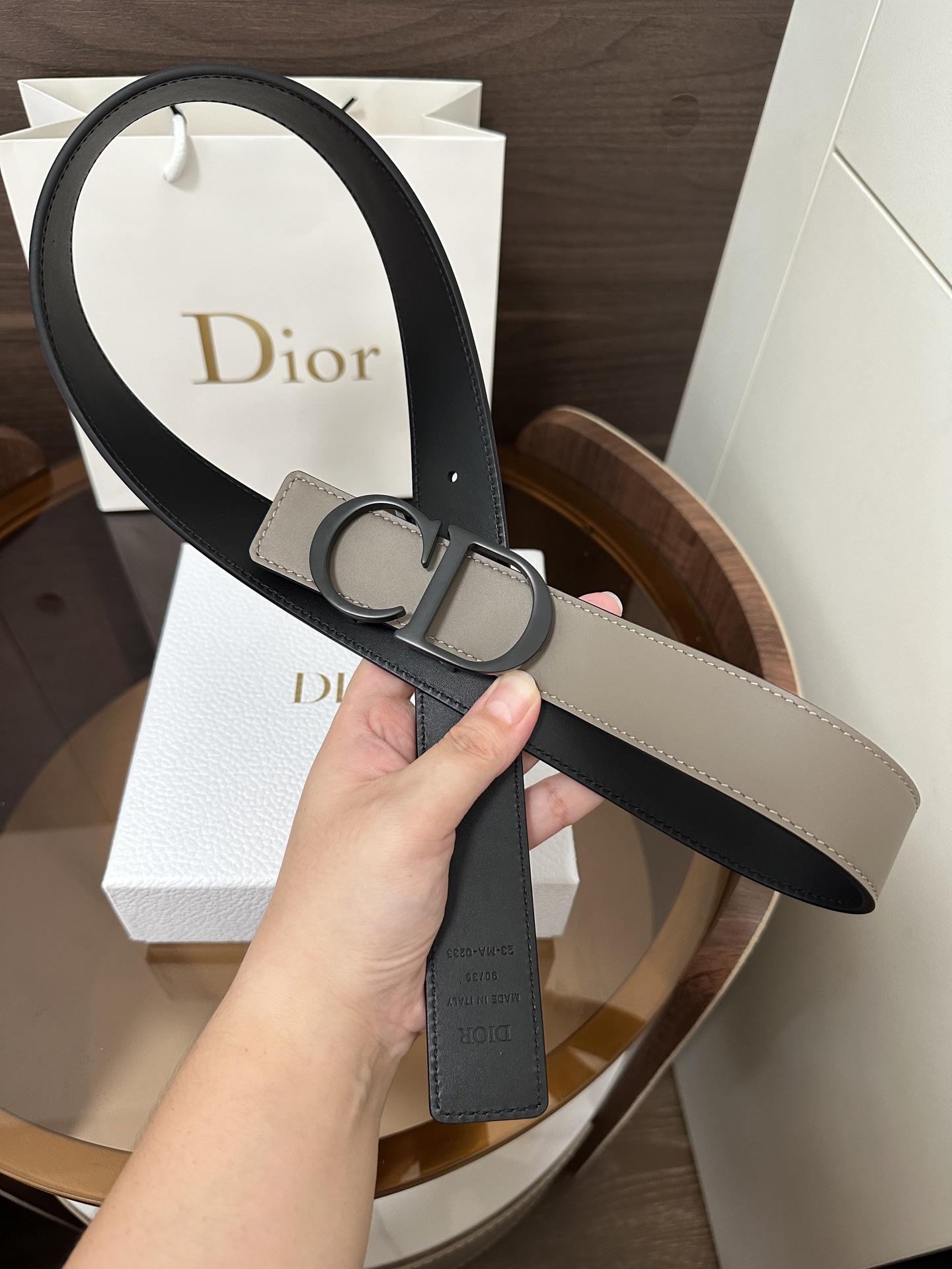 DI0R New Double-sided Belt This 35 mm double-sided belt combines elegant temperament with modern style. Both sides are meticulously crafted from calf leather. It can be paired with various 35 mm belt buckles to create distinctive, fashionable, and versatile pieces.