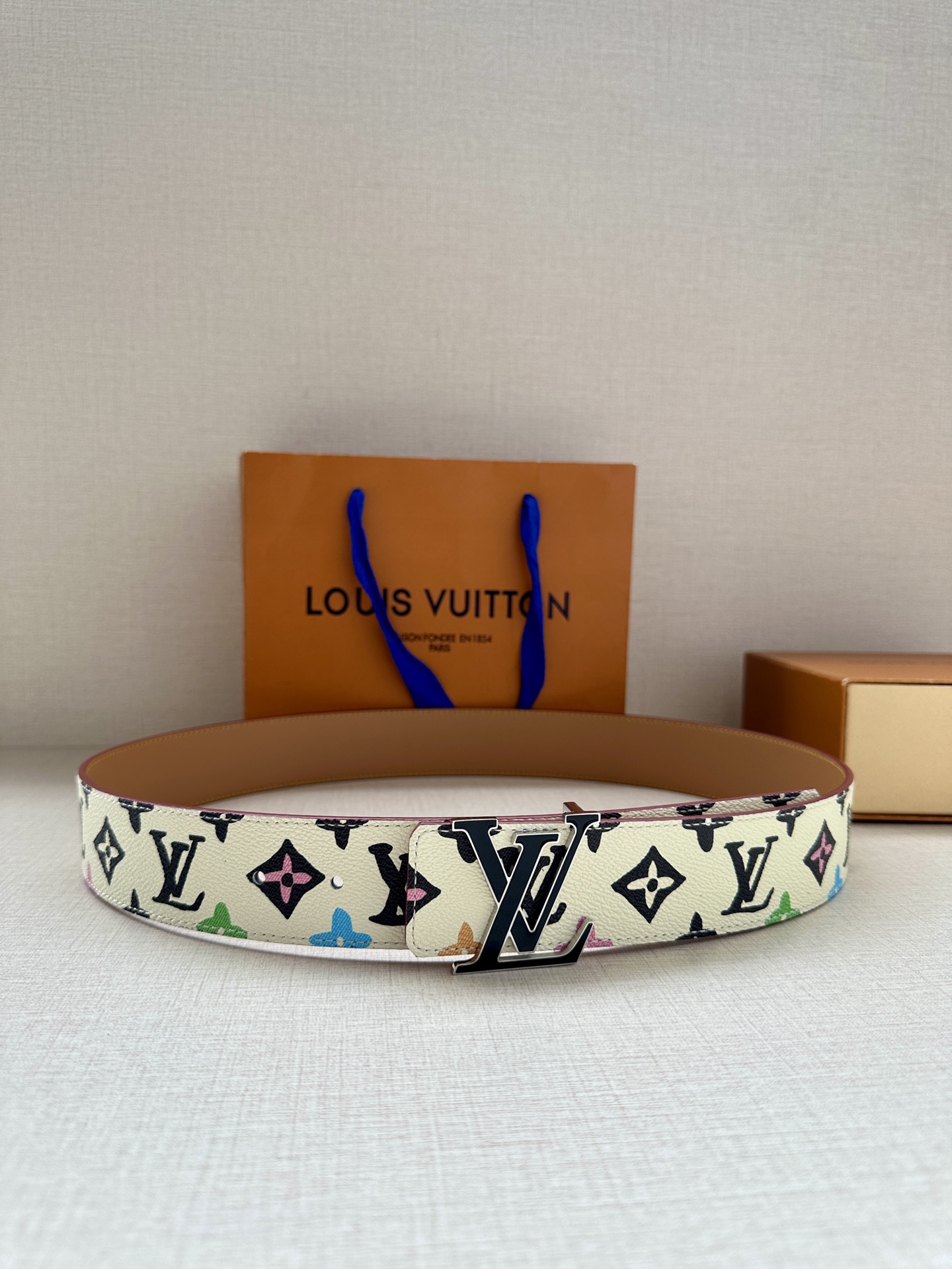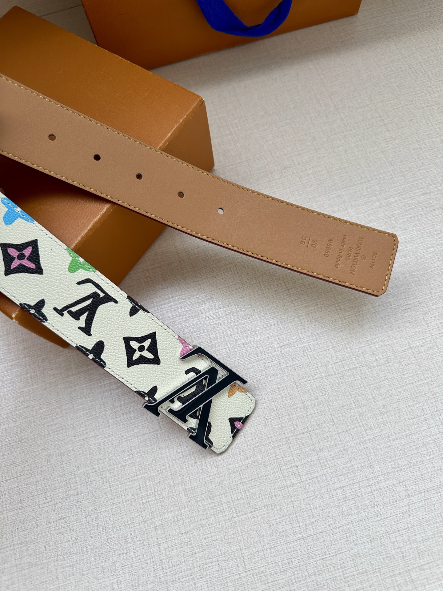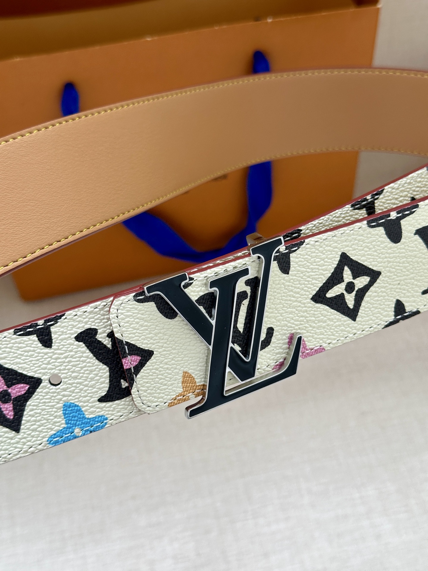 This 4.0 wide LV Tag reversible belt comes from the brand's collaboration series with Tyler, featuring a playful Monogram Craggy pattern on one side, and when flipped over, reveals the Louis Vuitton logo embossed leather. The LV Tag buckle upgrades the modern look.