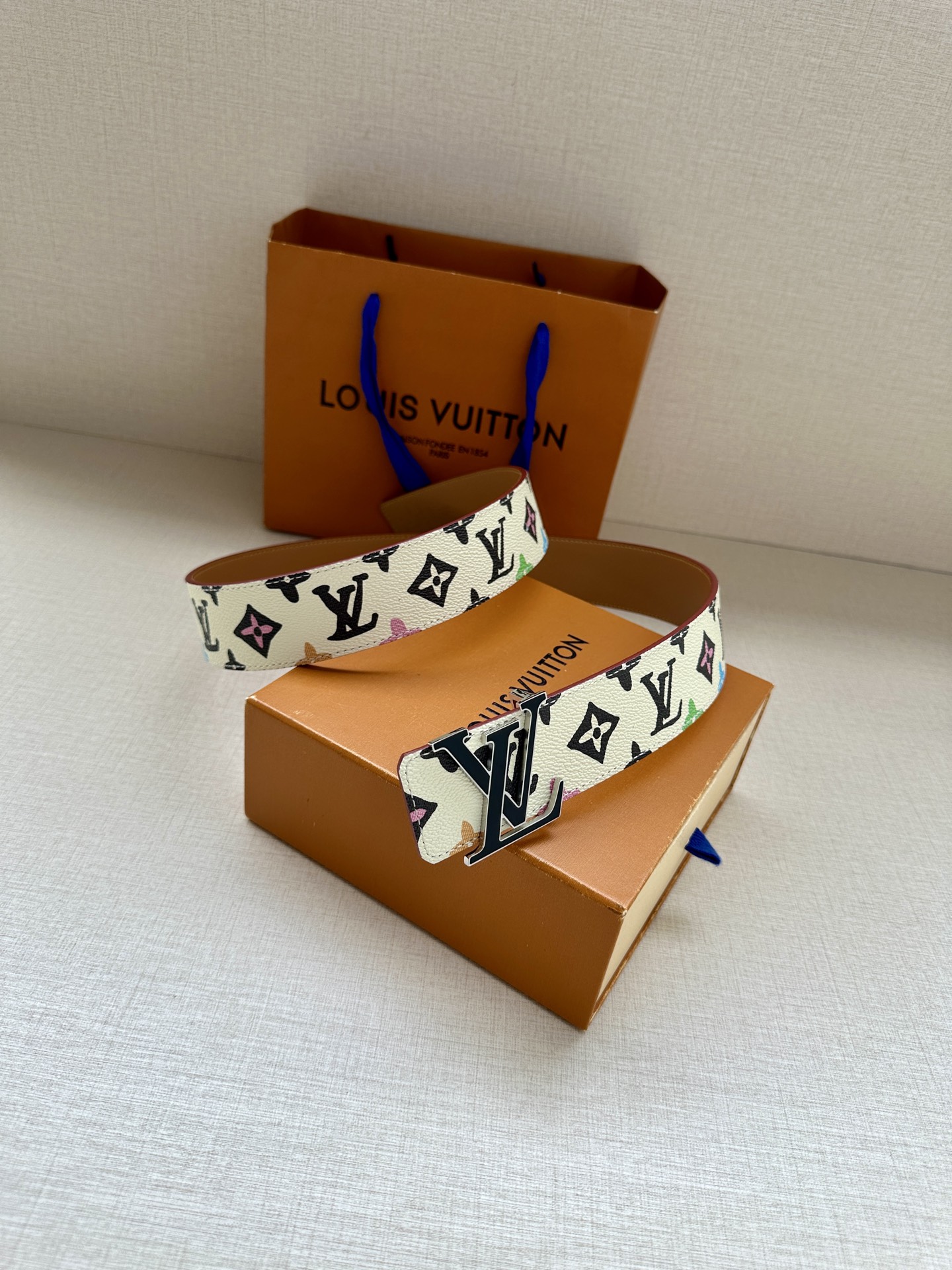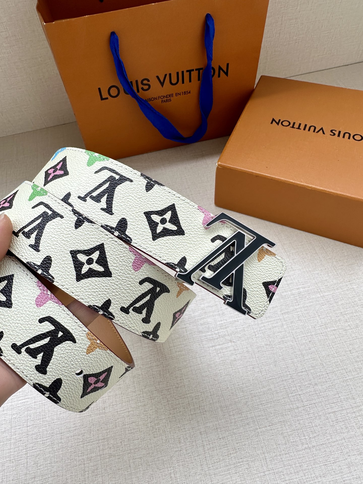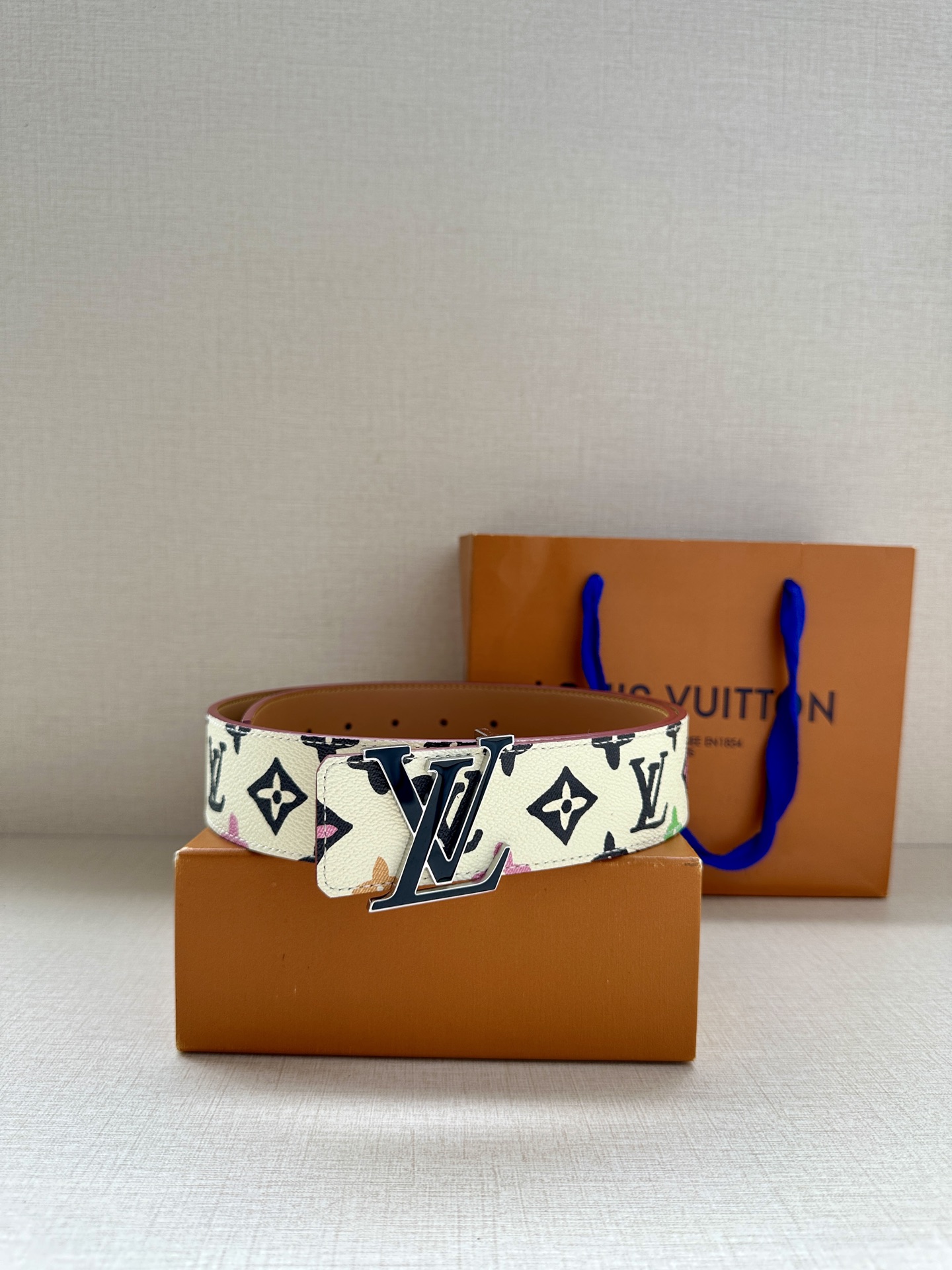 This 4.0 wide LV Tag reversible belt comes from the brand's collaboration series with Tyler, featuring a playful Monogram Craggy pattern on one side, and when flipped over, reveals the Louis Vuitton logo embossed leather. The LV Tag buckle upgrades the modern look.