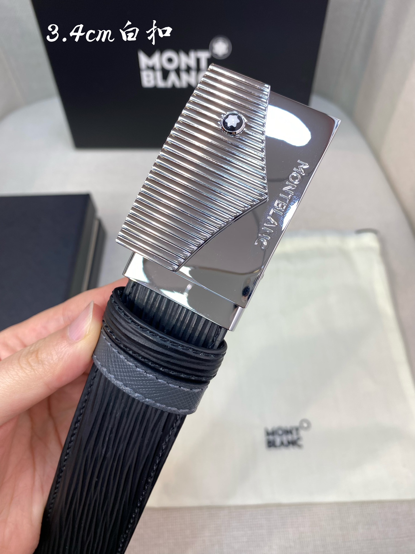 Montblanc 3.5cm wide genuine leather belt with pin buckle, adjustable for business casual wear.