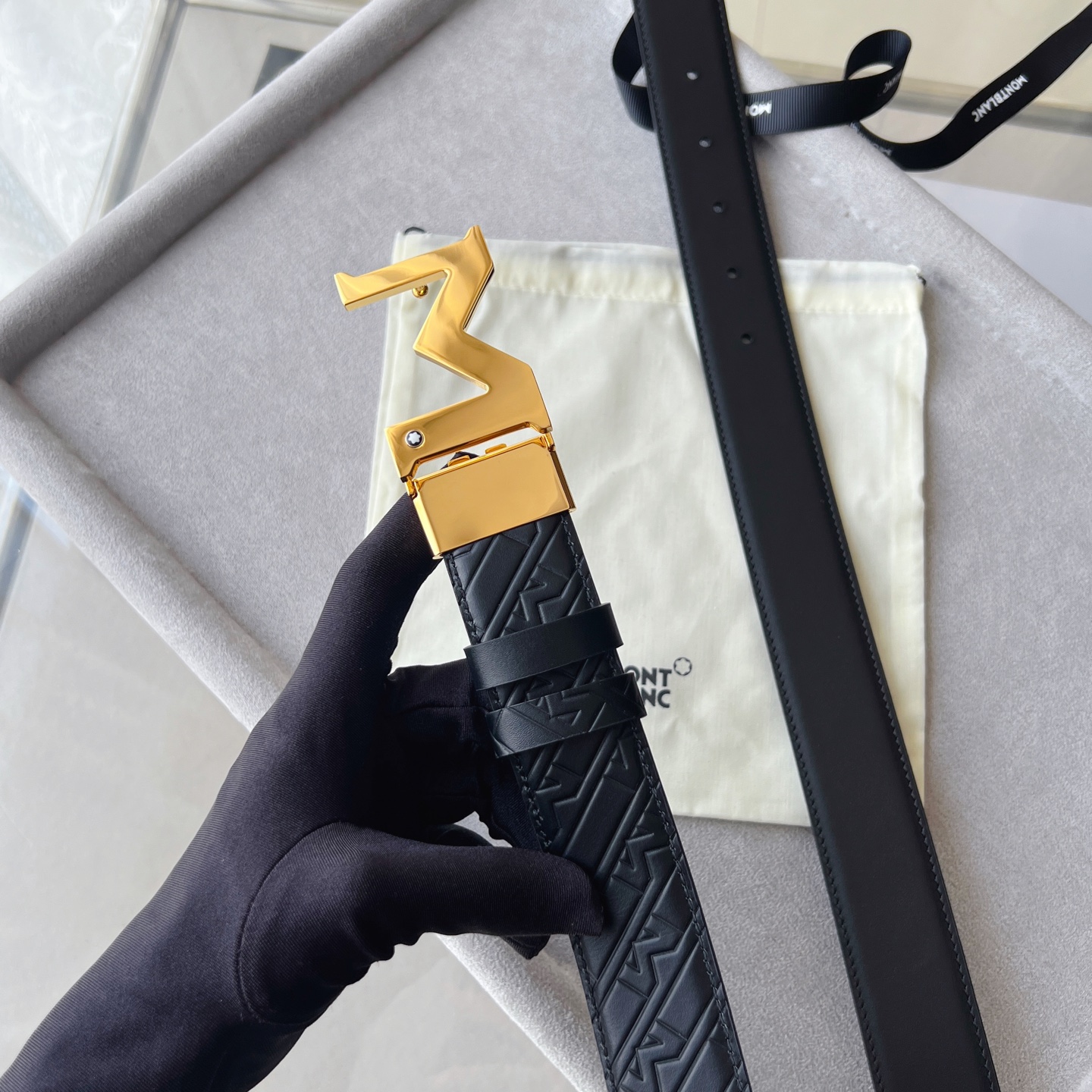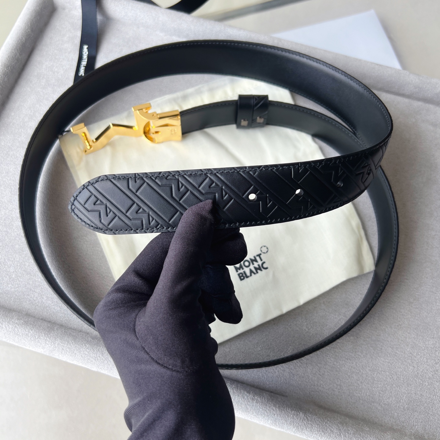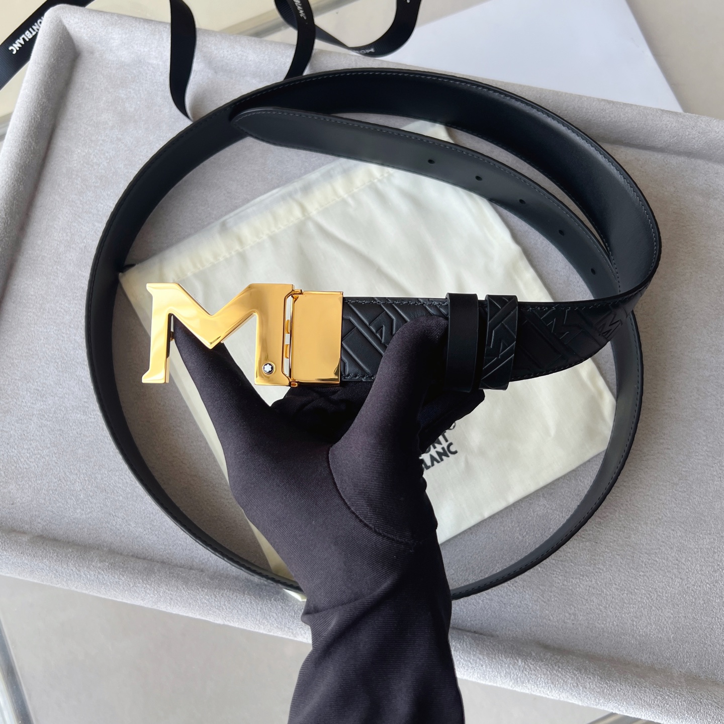 Palladium-plated "M" motif buckle. Adjustable length, 3.5 cm x 120 cm, double-sided black grained and black polished leather belt for a sporty look.