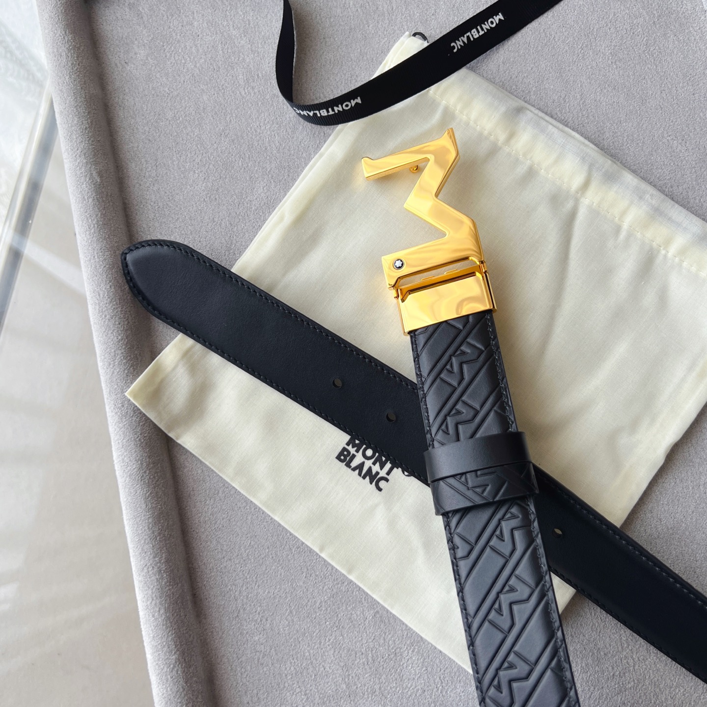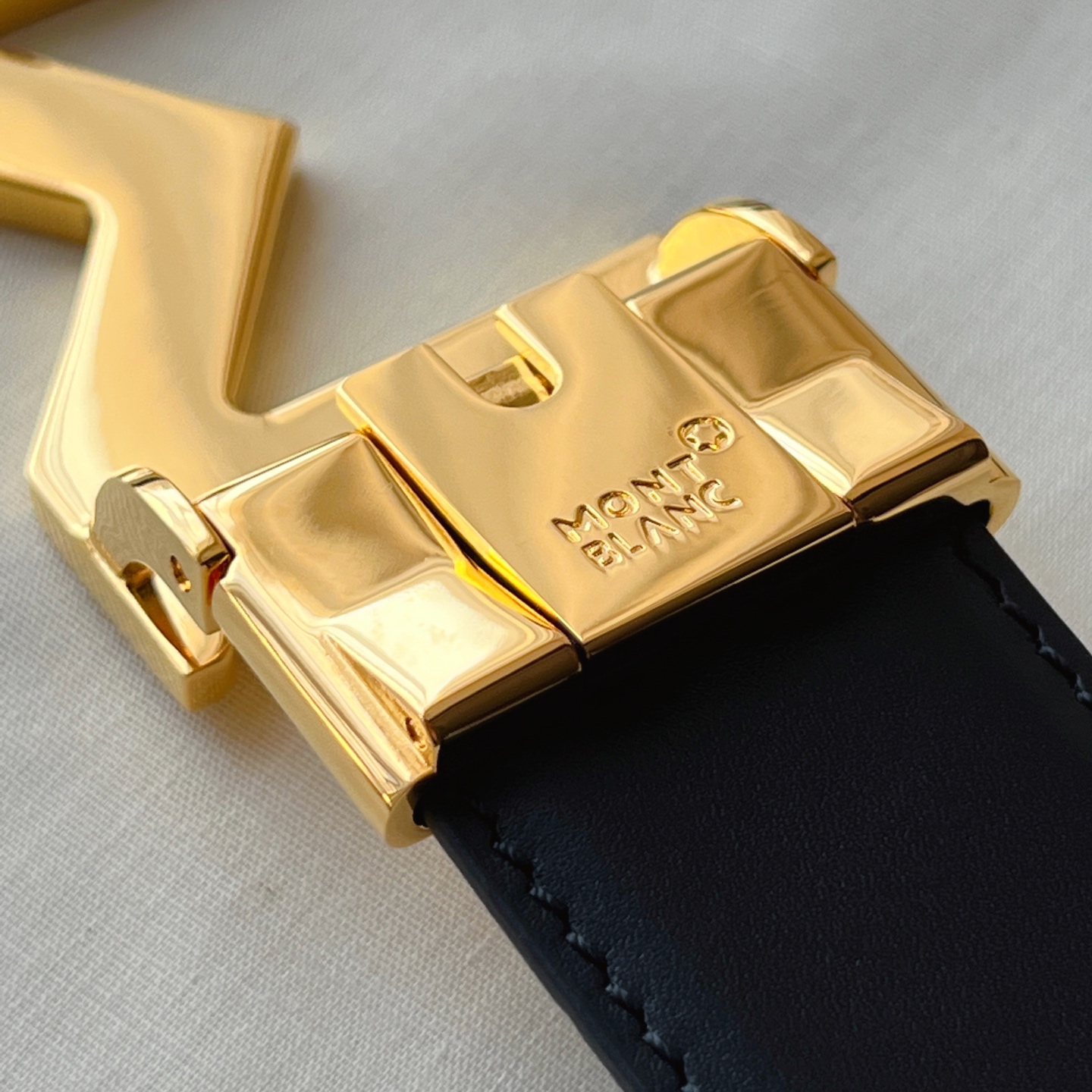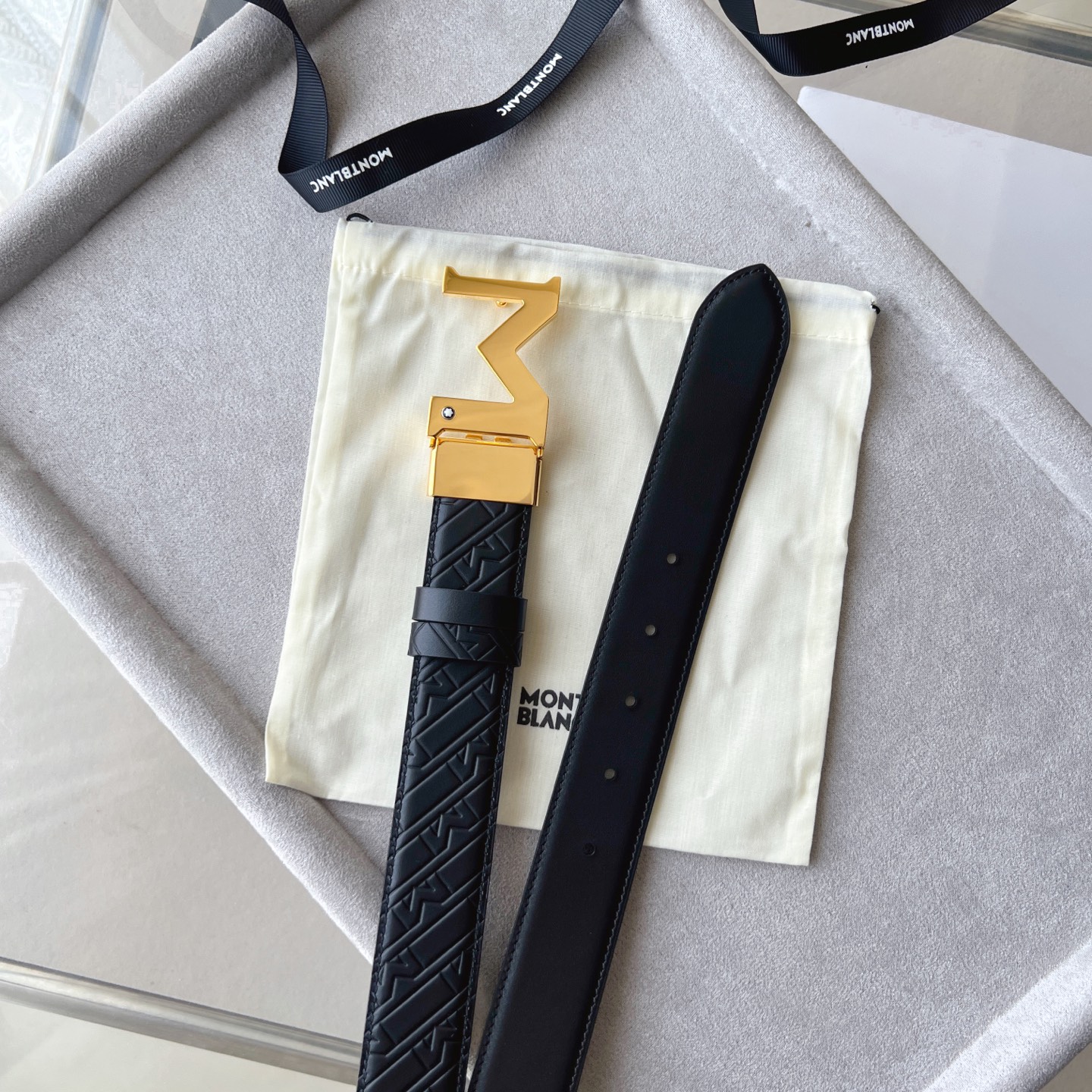 Palladium-plated "M" motif buckle. Adjustable length, 3.5 cm x 120 cm, double-sided black grained and black polished leather belt for a sporty look.