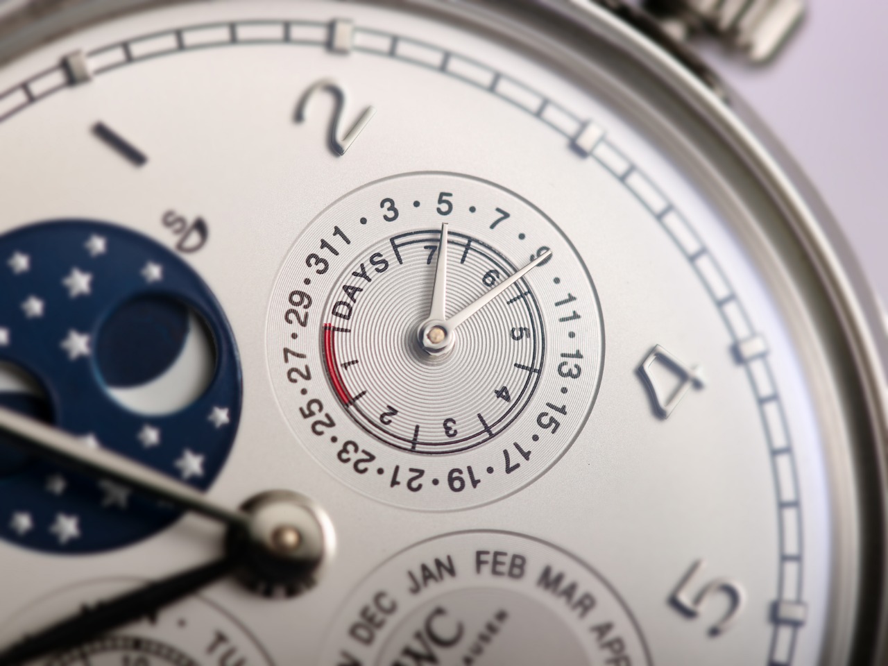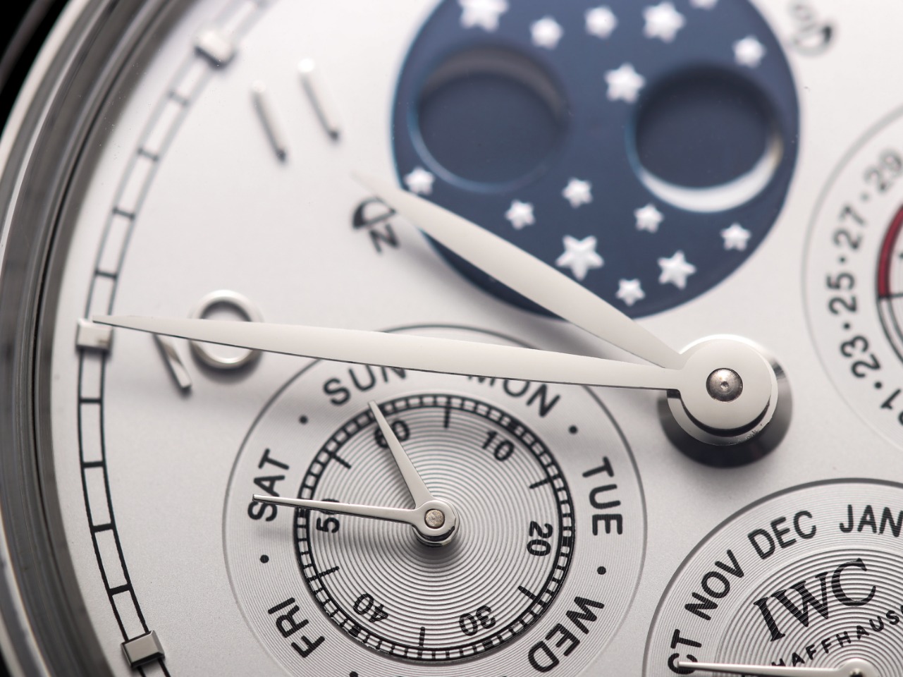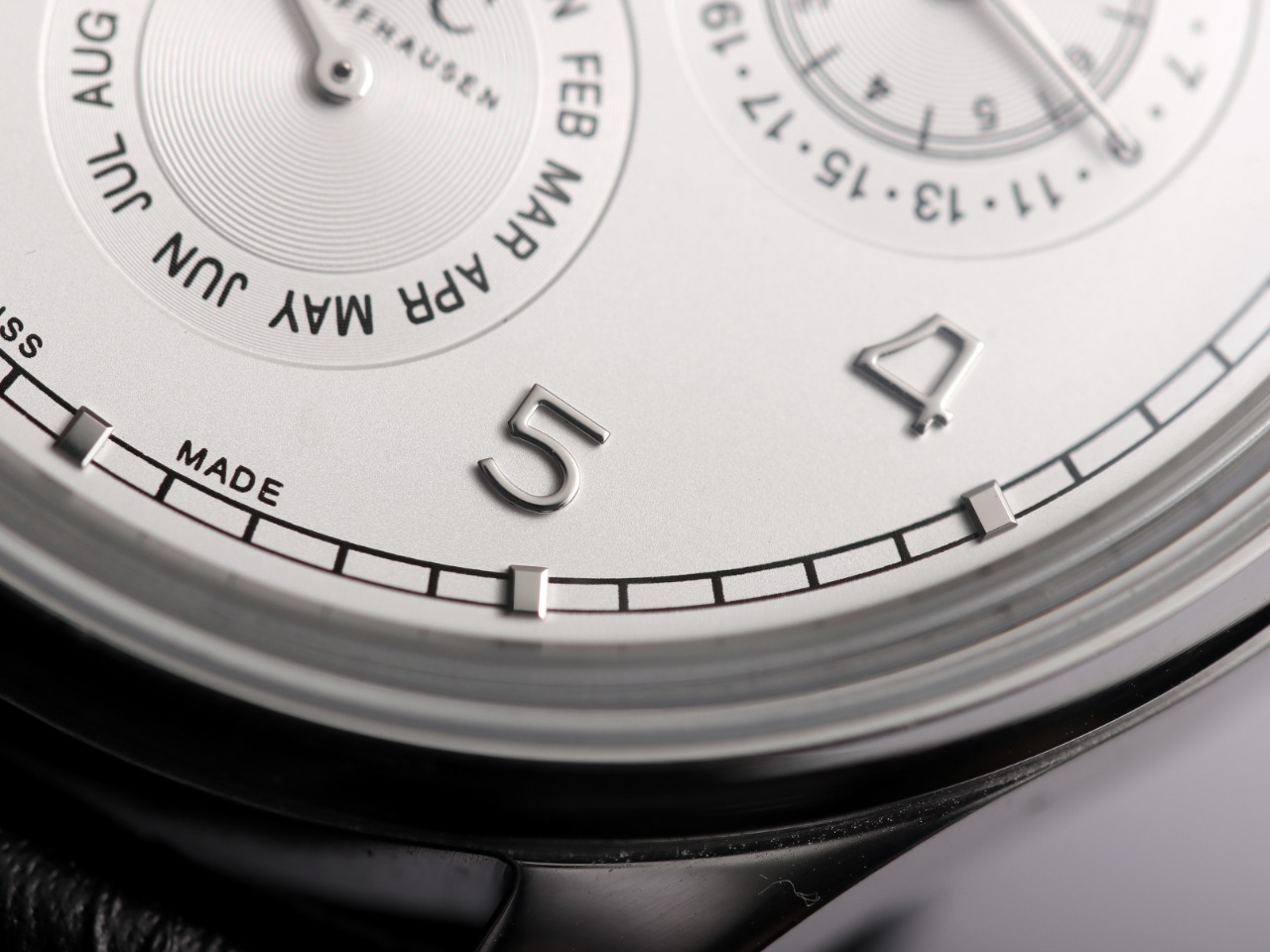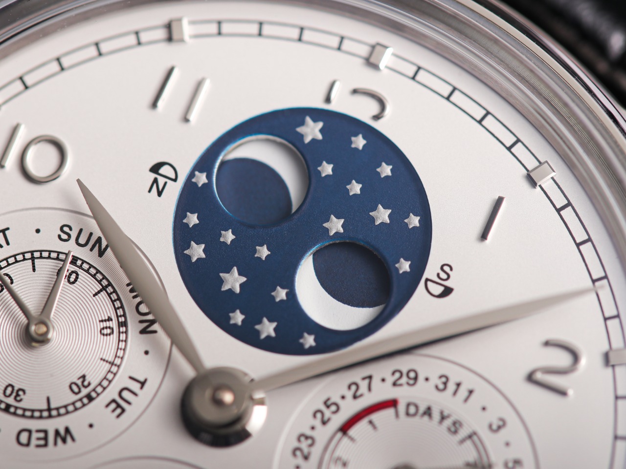 2. 【Date, Month, Day】—The date (3 o'clock position), month (6 o'clock position), and day (9 o'clock position) all operate normally and can be manually adjusted (the date can be adjusted bidirectionally by pulling out the crown to the second position; the month can be adjusted via the hidden button at the 8 o'clock position; the day can be adjusted by moving the hands).