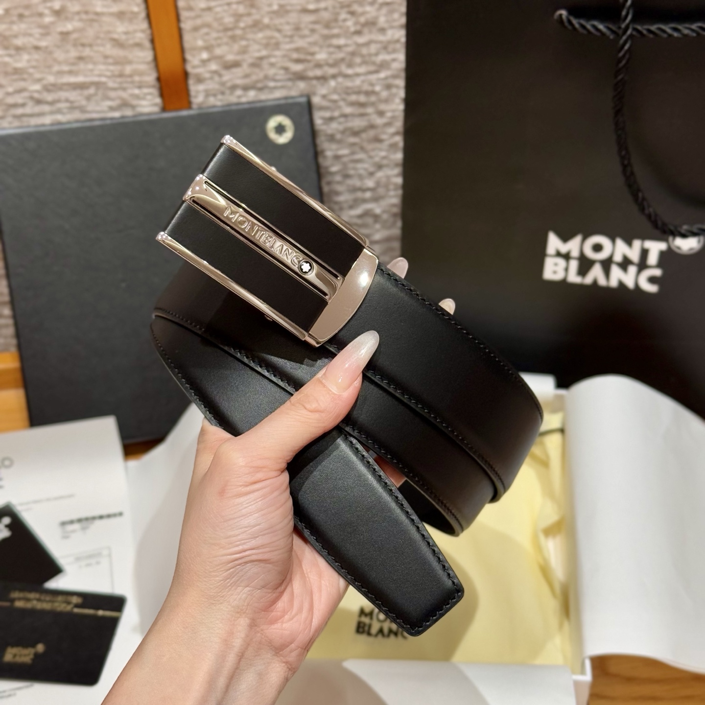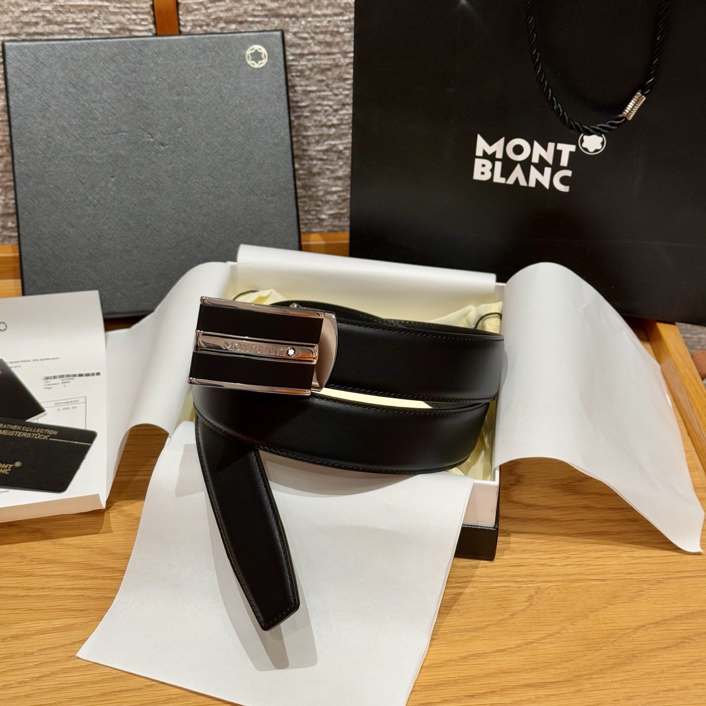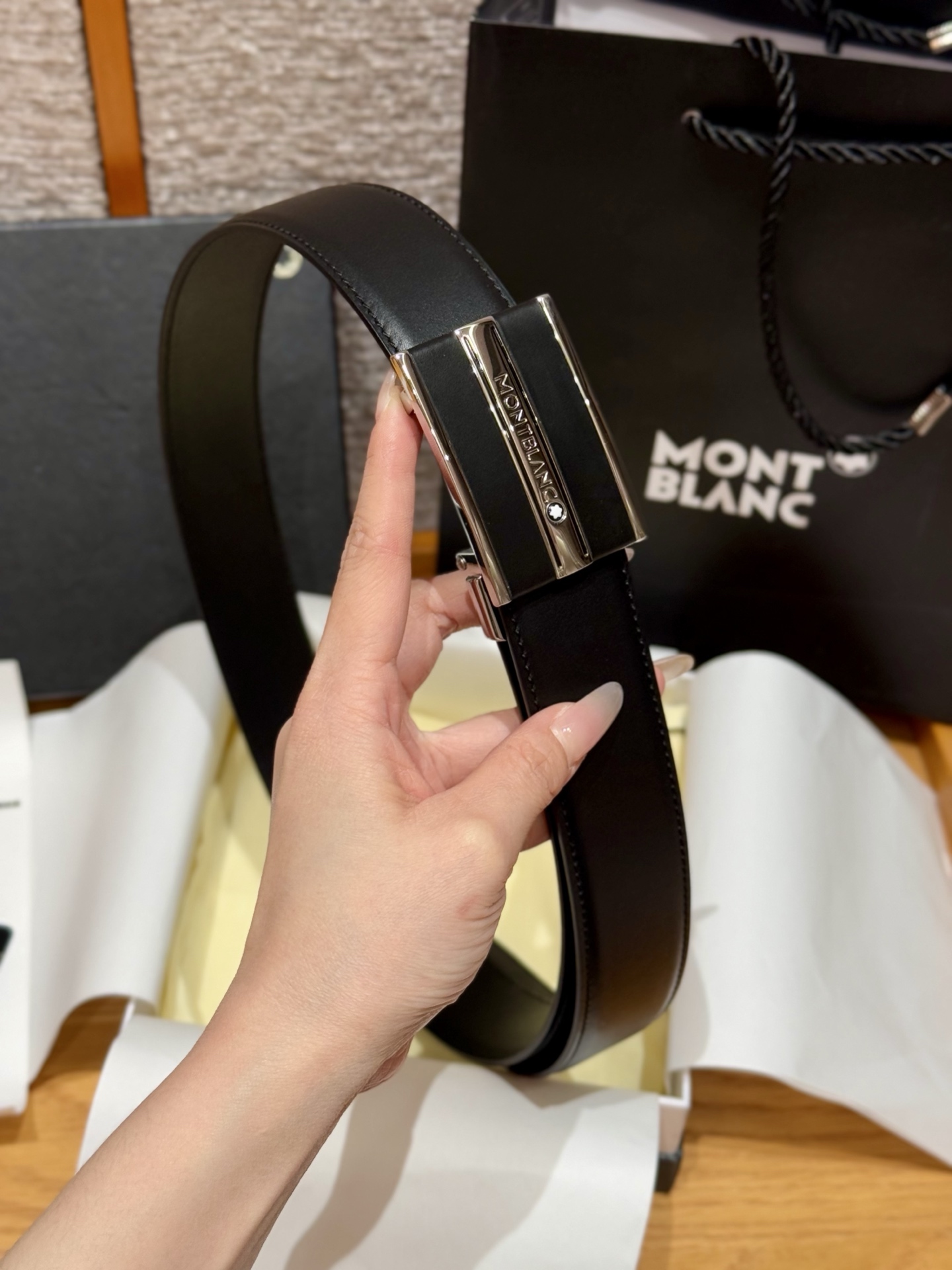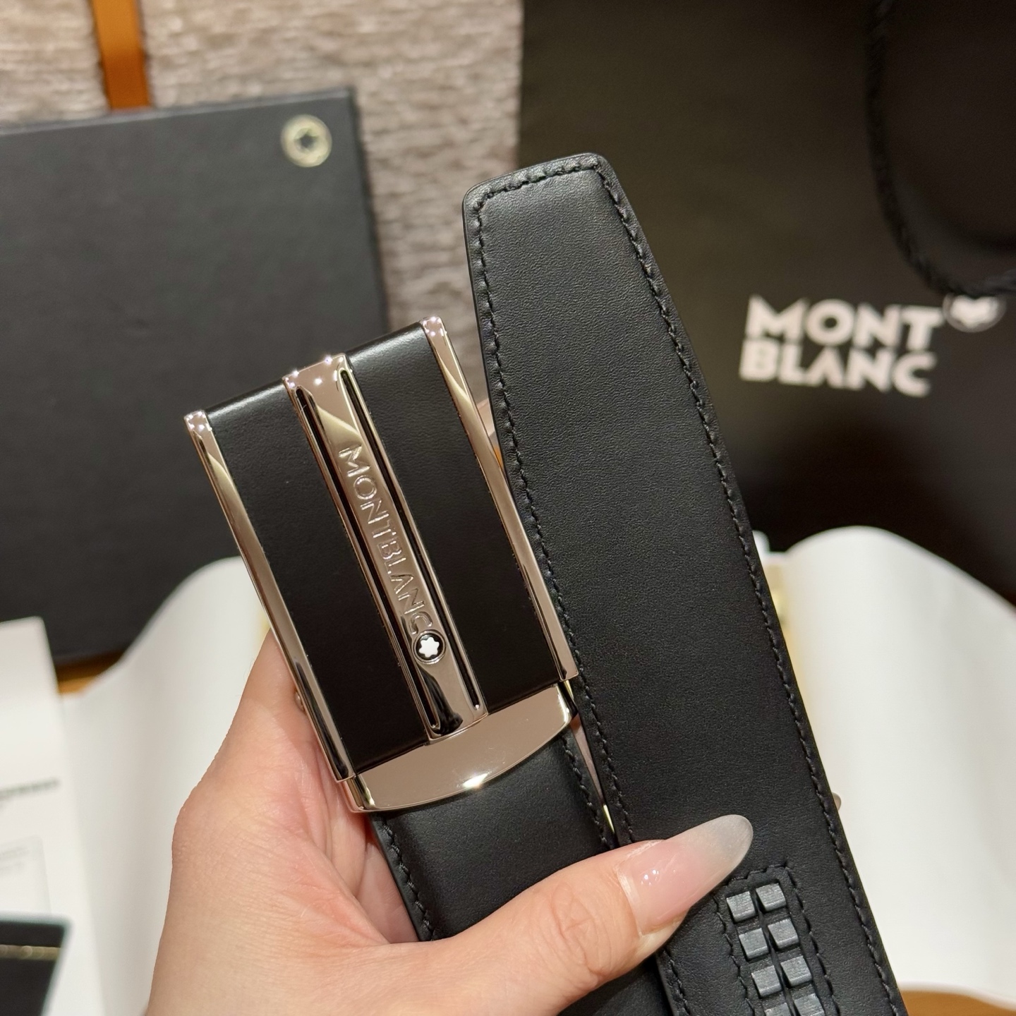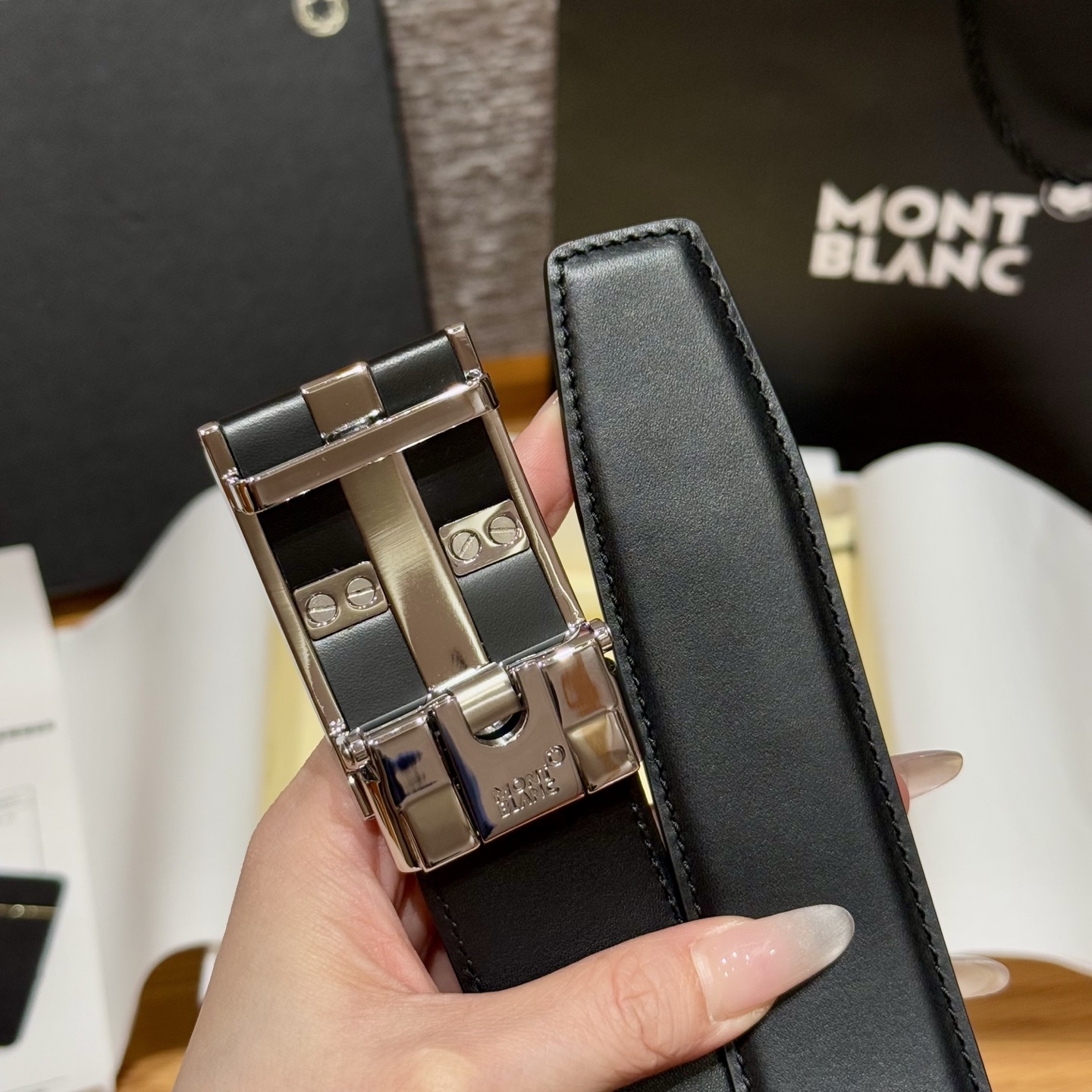 This men's belt uses an automatic buckle process, with a rectangular shiny stainless steel buckle, equipped with leather inserts and a sliding device. The new sliding structure allows easy opening or fixing of the belt length without the need for a pin buckle. The classic white hexagon star flat grain leather is very durable.