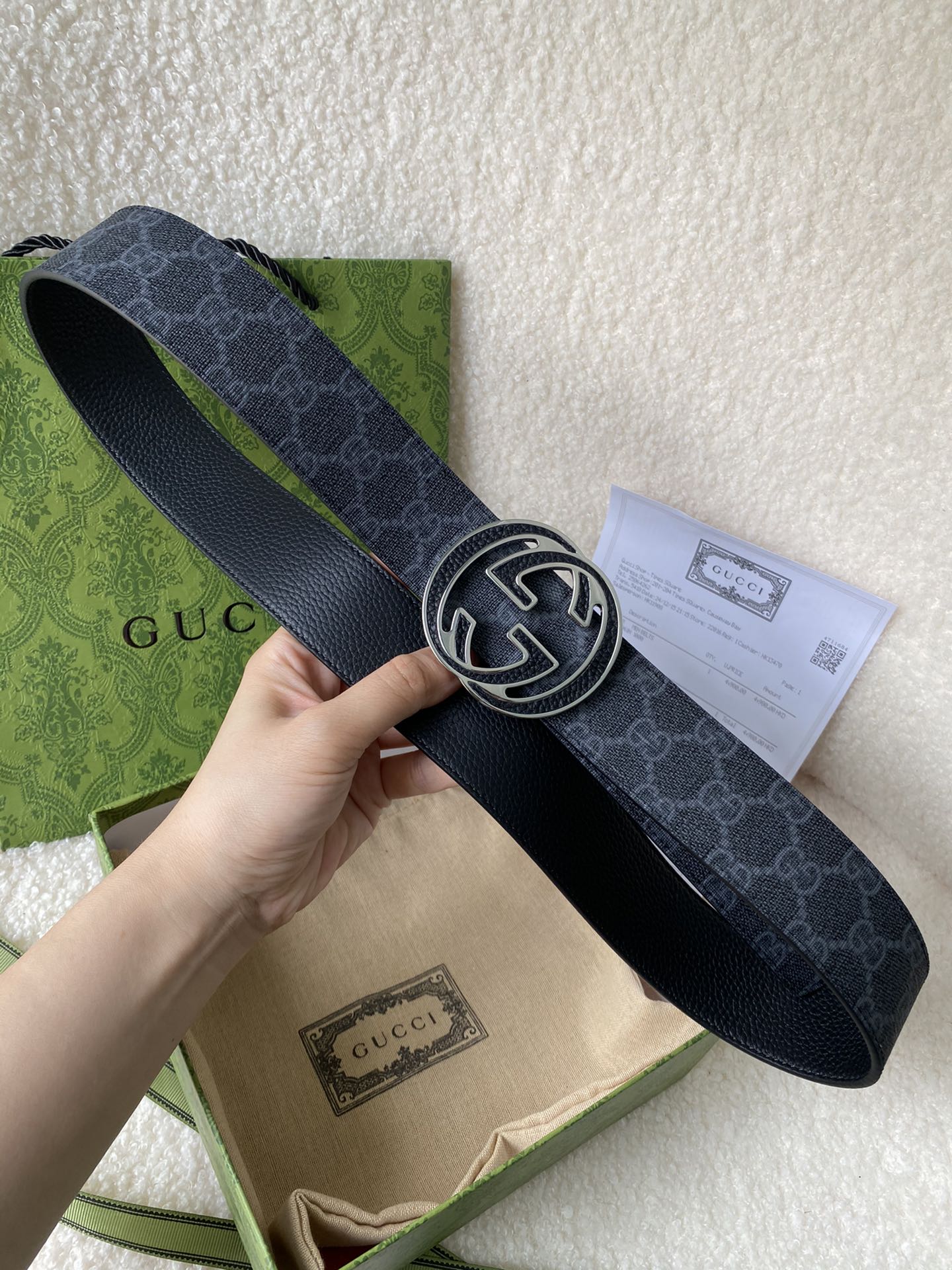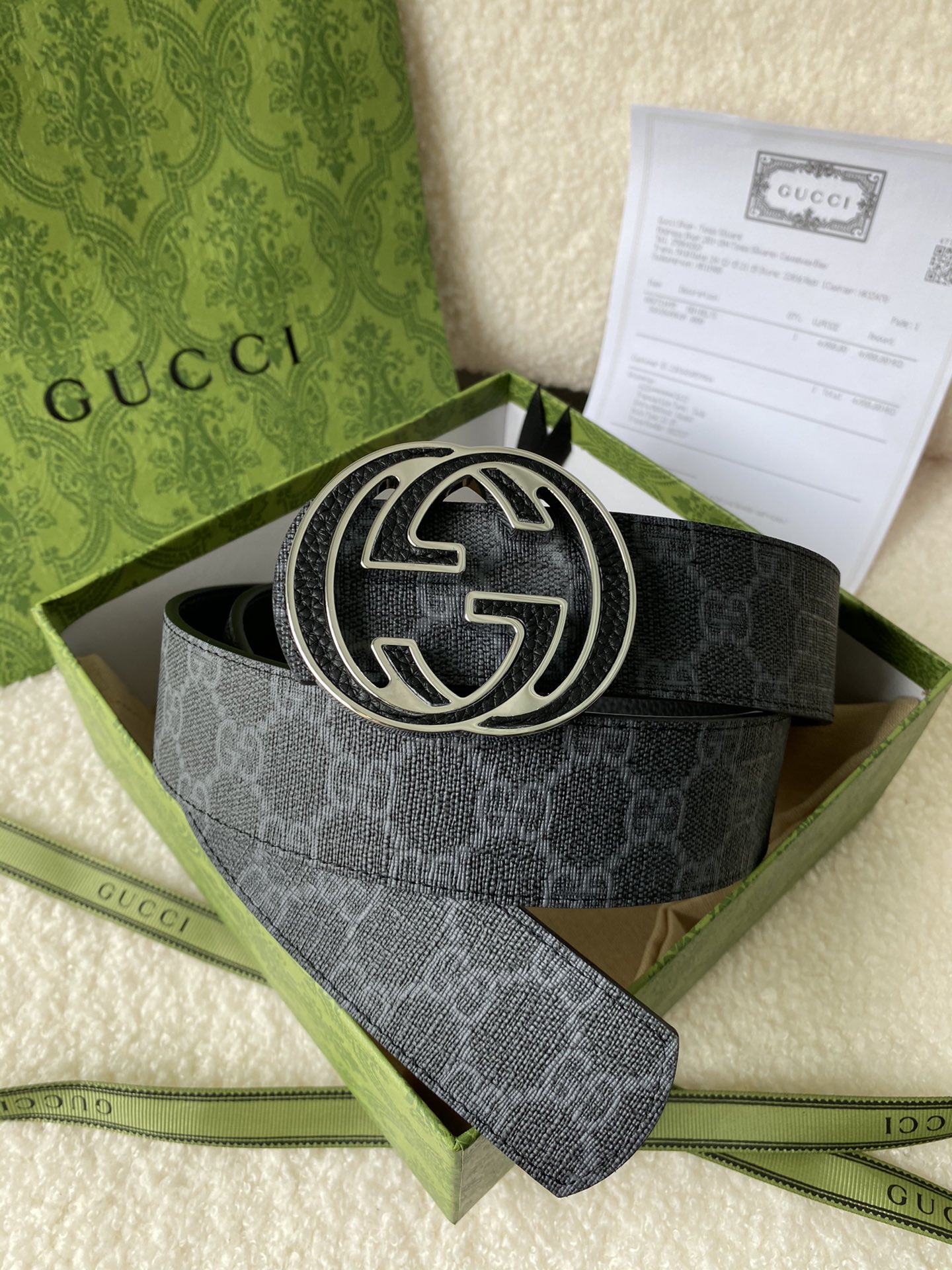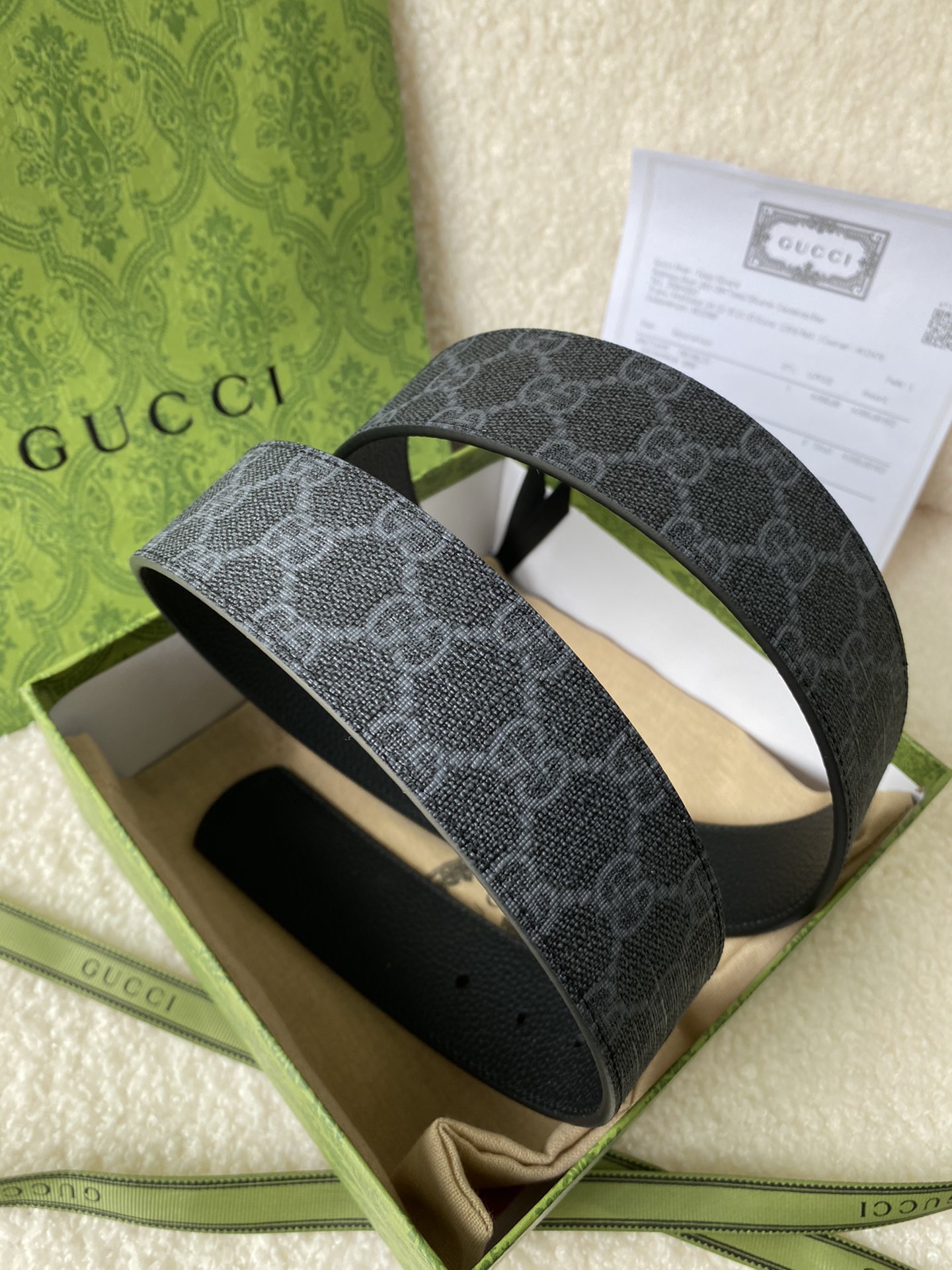 Gucci Double G Buckle Men's New Belt, In Sync With Boutique, Width 4 cm, Strap Material Canvas Black Monogram - Combined With Imported Pebble Grain Black, Exquisite Vacuum Plated Double G Steel Buckle, Reversible