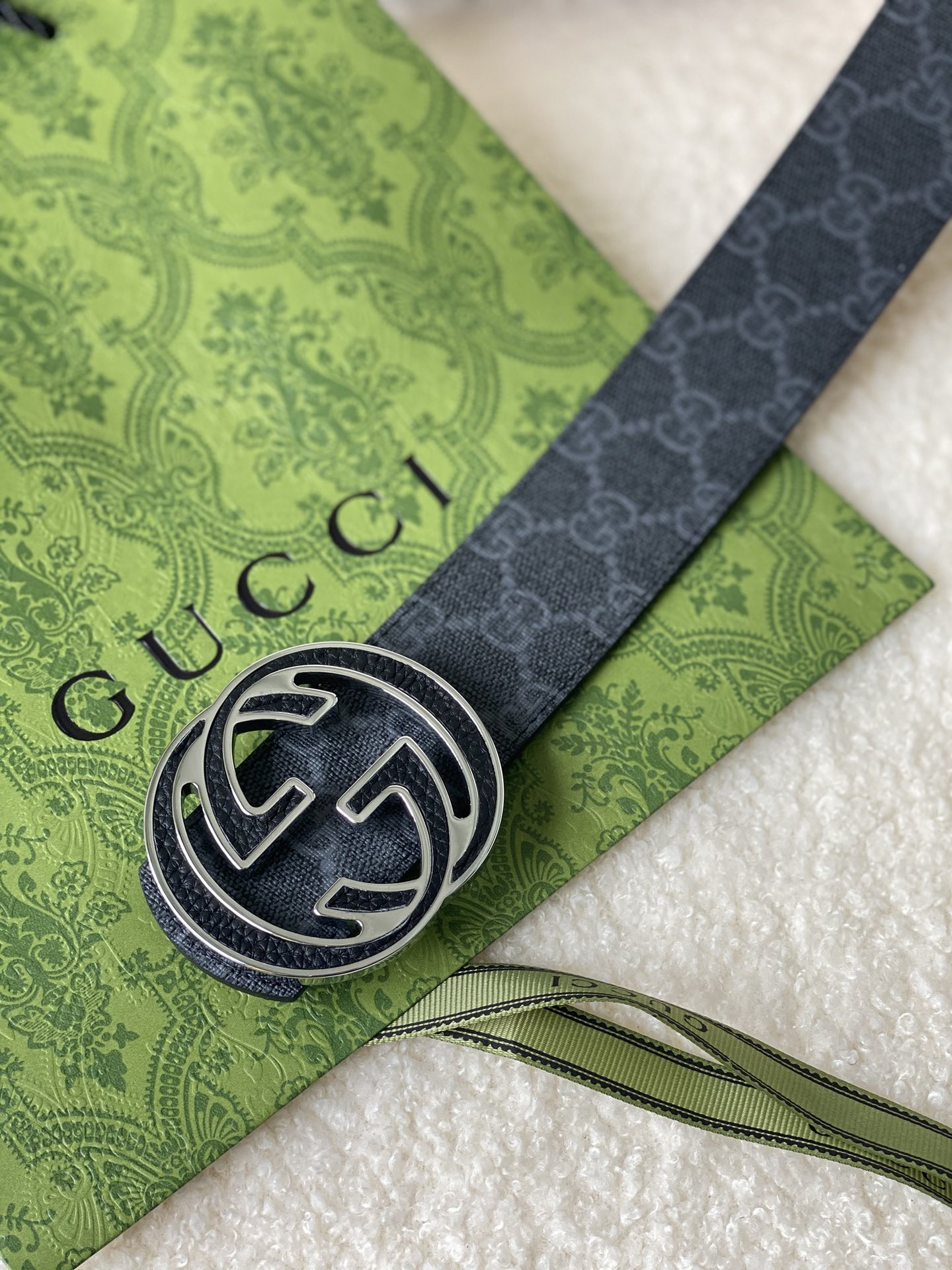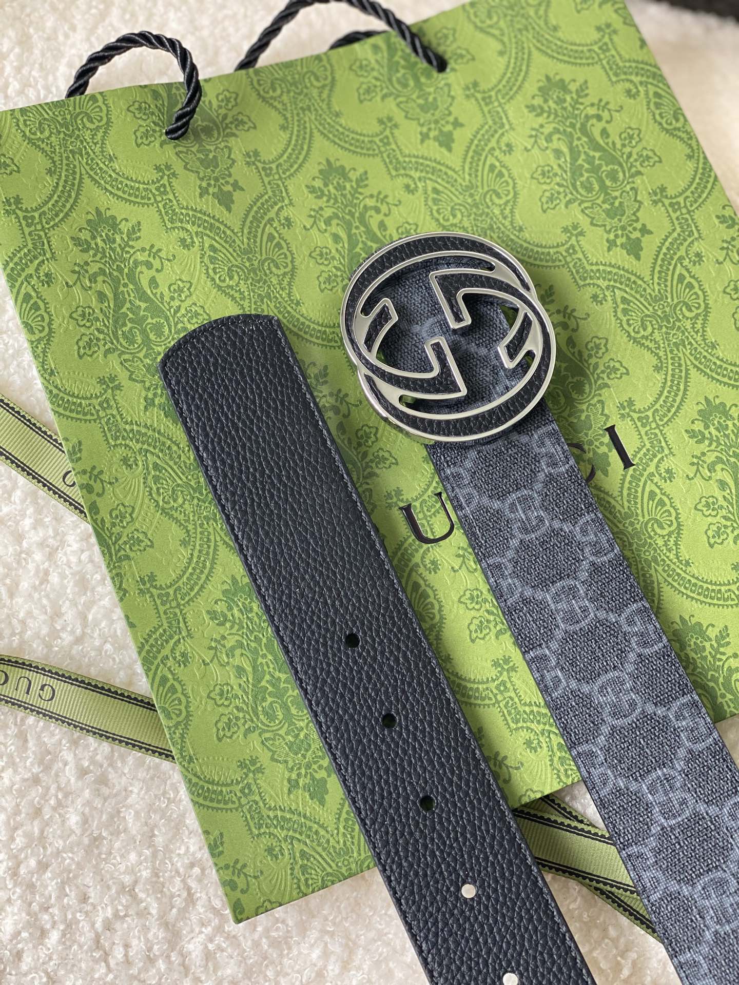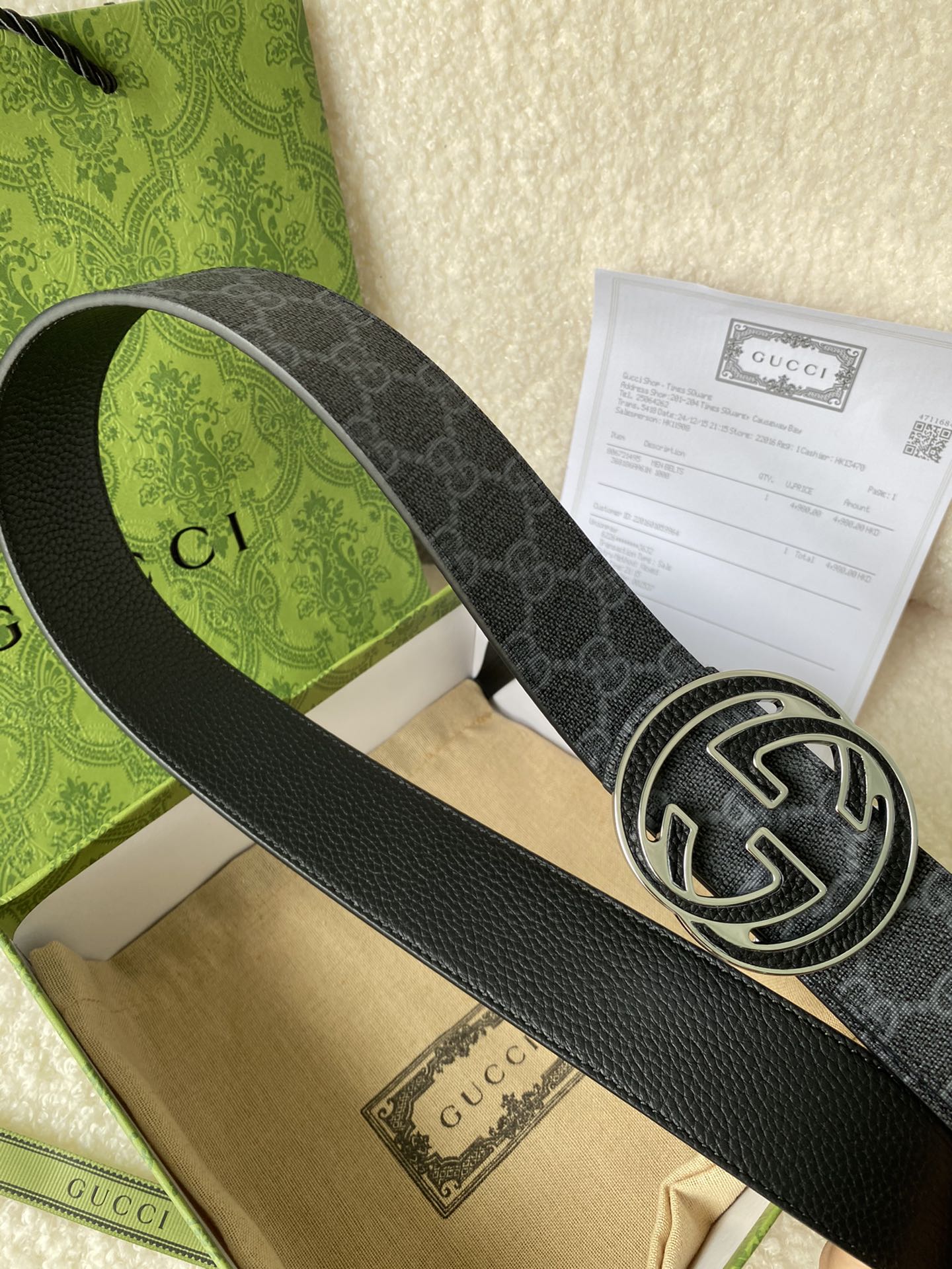 Gucci Double G Buckle Men's New Belt, In Sync With Boutique, Width 4 cm, Strap Material Canvas Black Monogram - Combined With Imported Pebble Grain Black, Exquisite Vacuum Plated Double G Steel Buckle, Reversible
