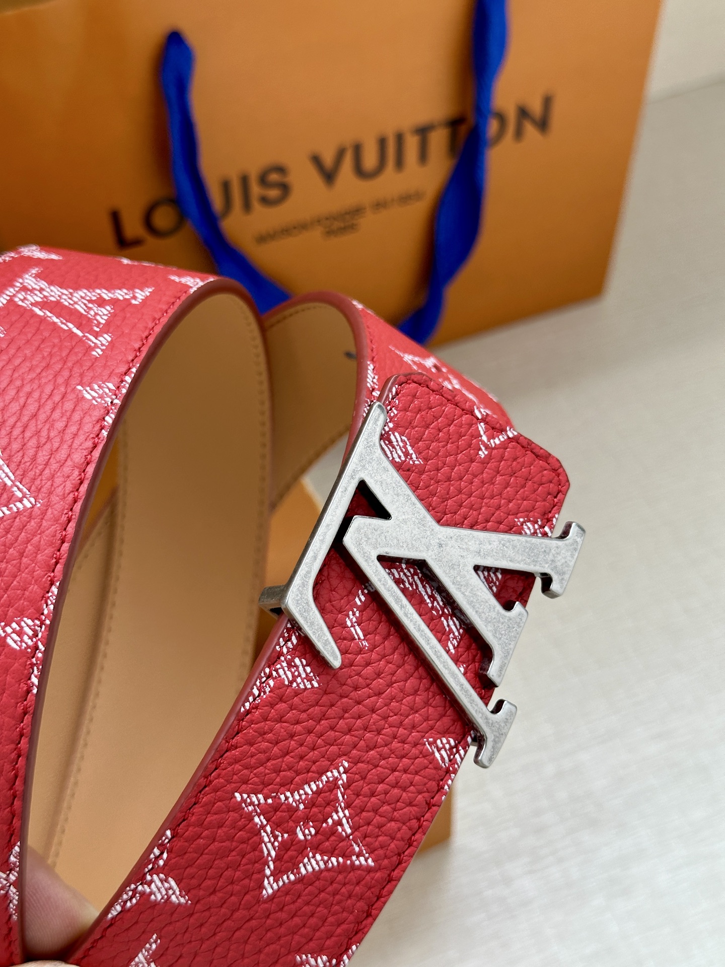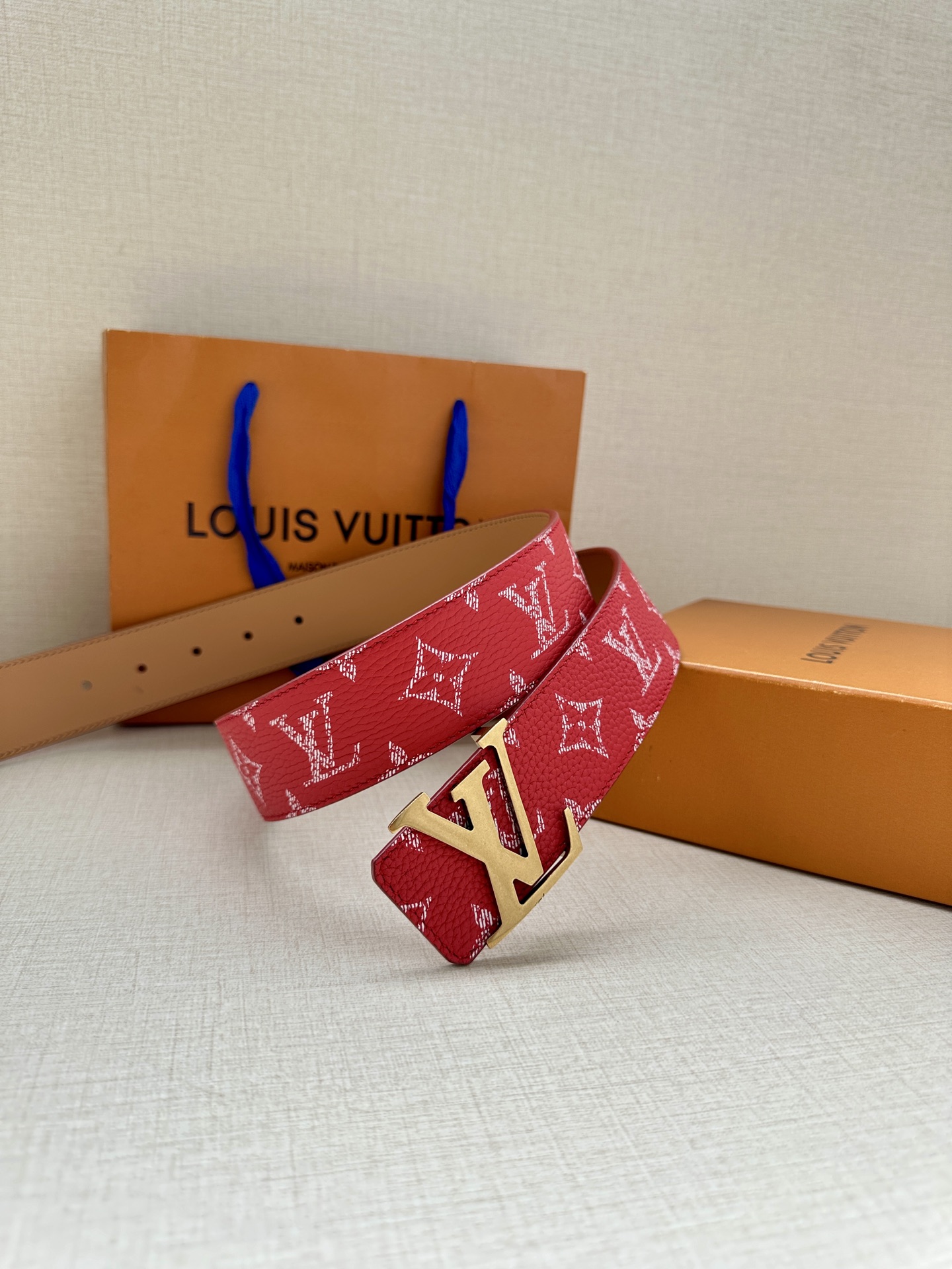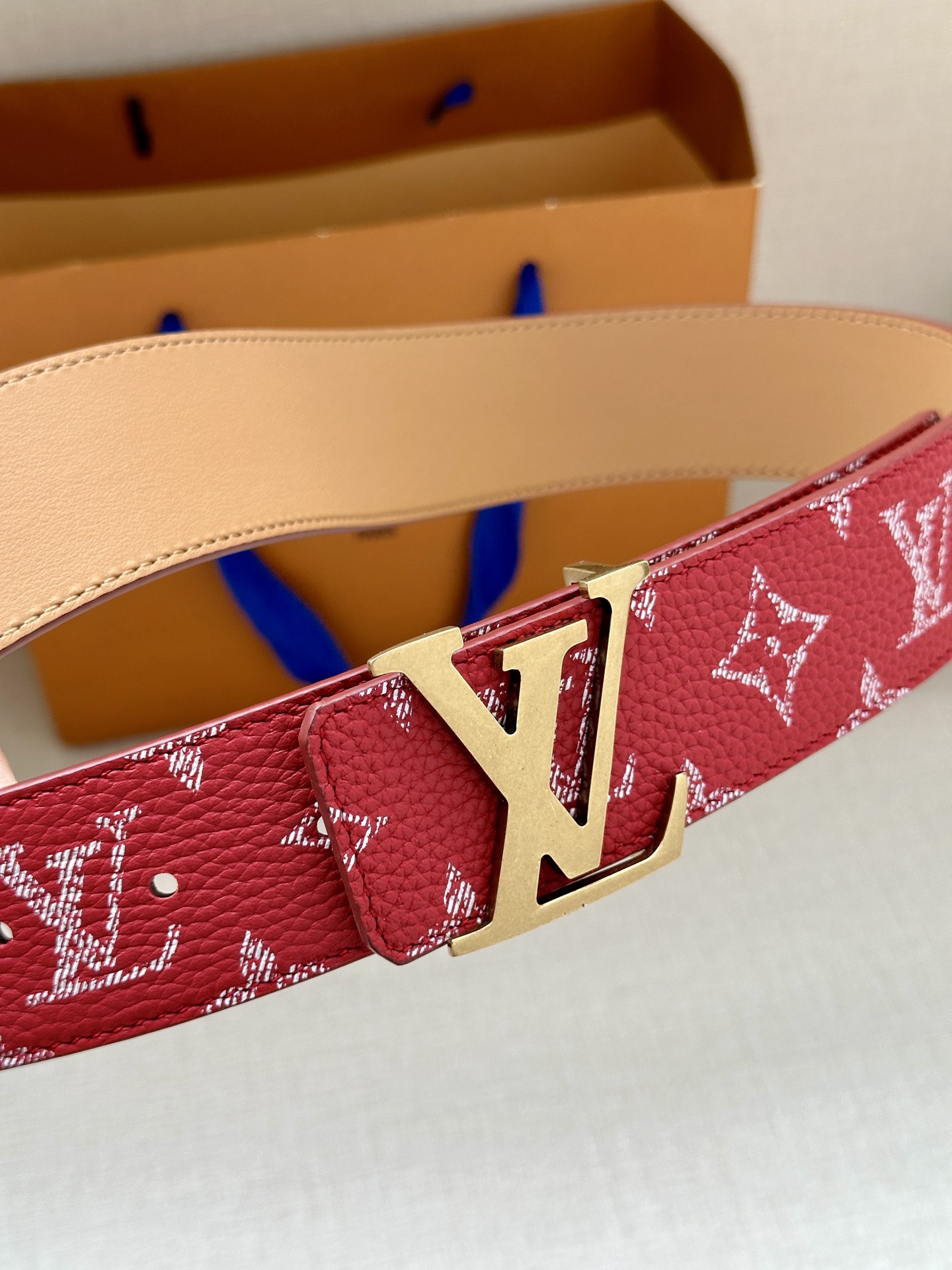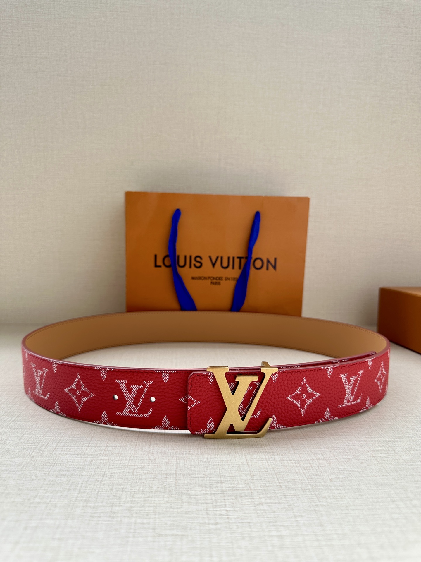 This 4.0 cm wide LV Initiales reversible belt introduces vibrant new colors. One side features the brand's classic pattern on luxurious Taurillon leather, while the other side showcases understated personality with smooth, minimalist calf leather. The LV initial buckle releases a unique shine.
