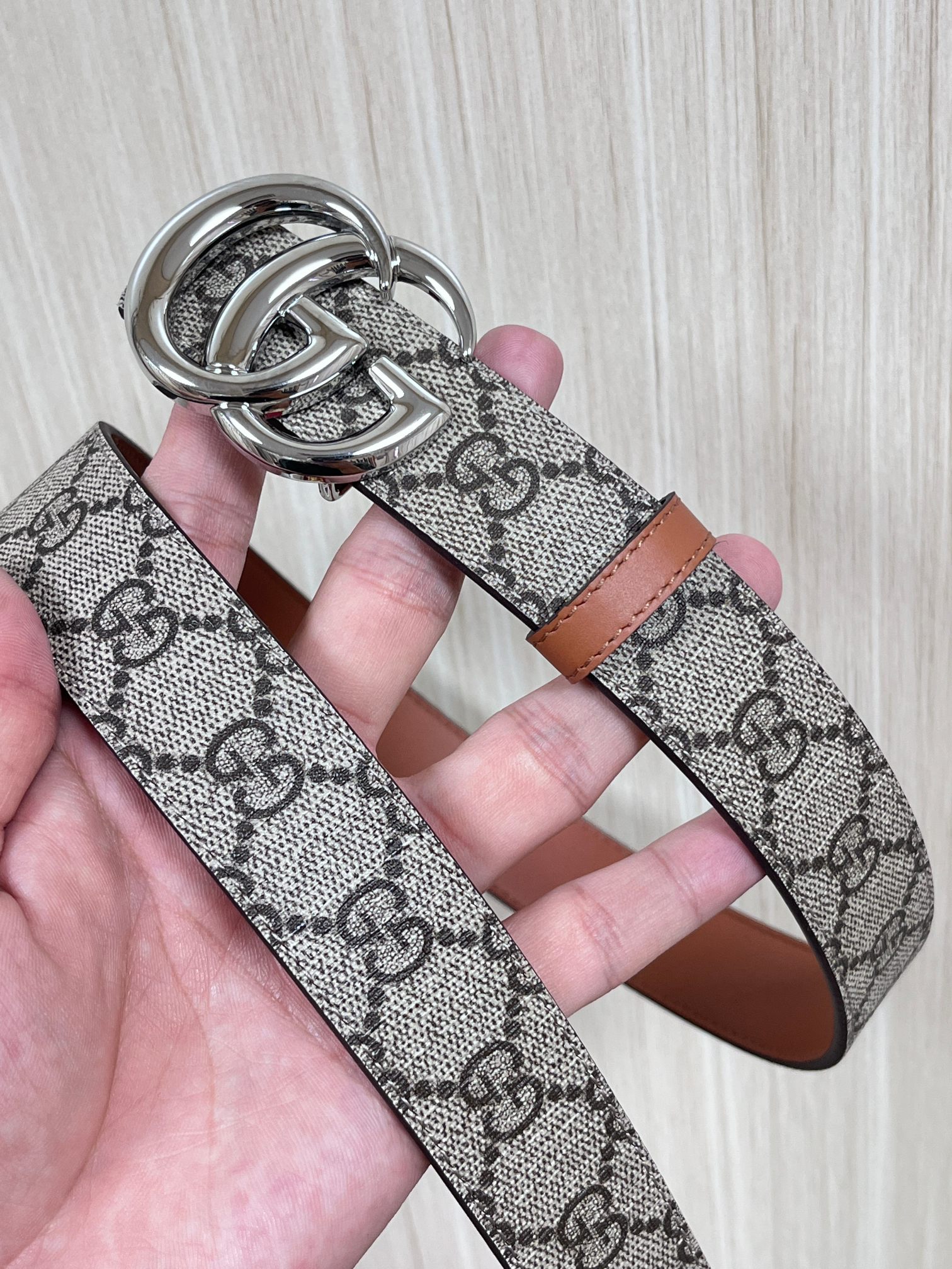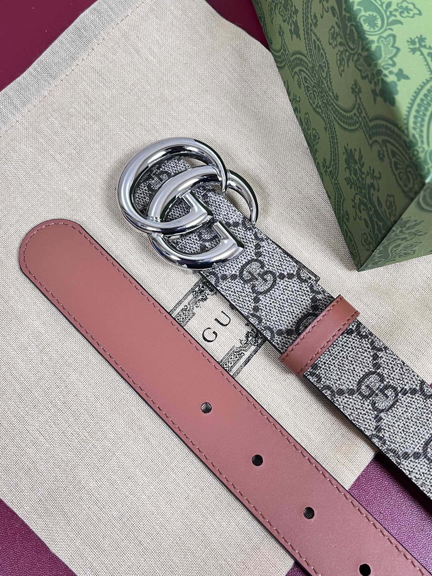 GUCCI GG Supreme belt with black leather trim and double G buckle, suitable for low and high waist styles.