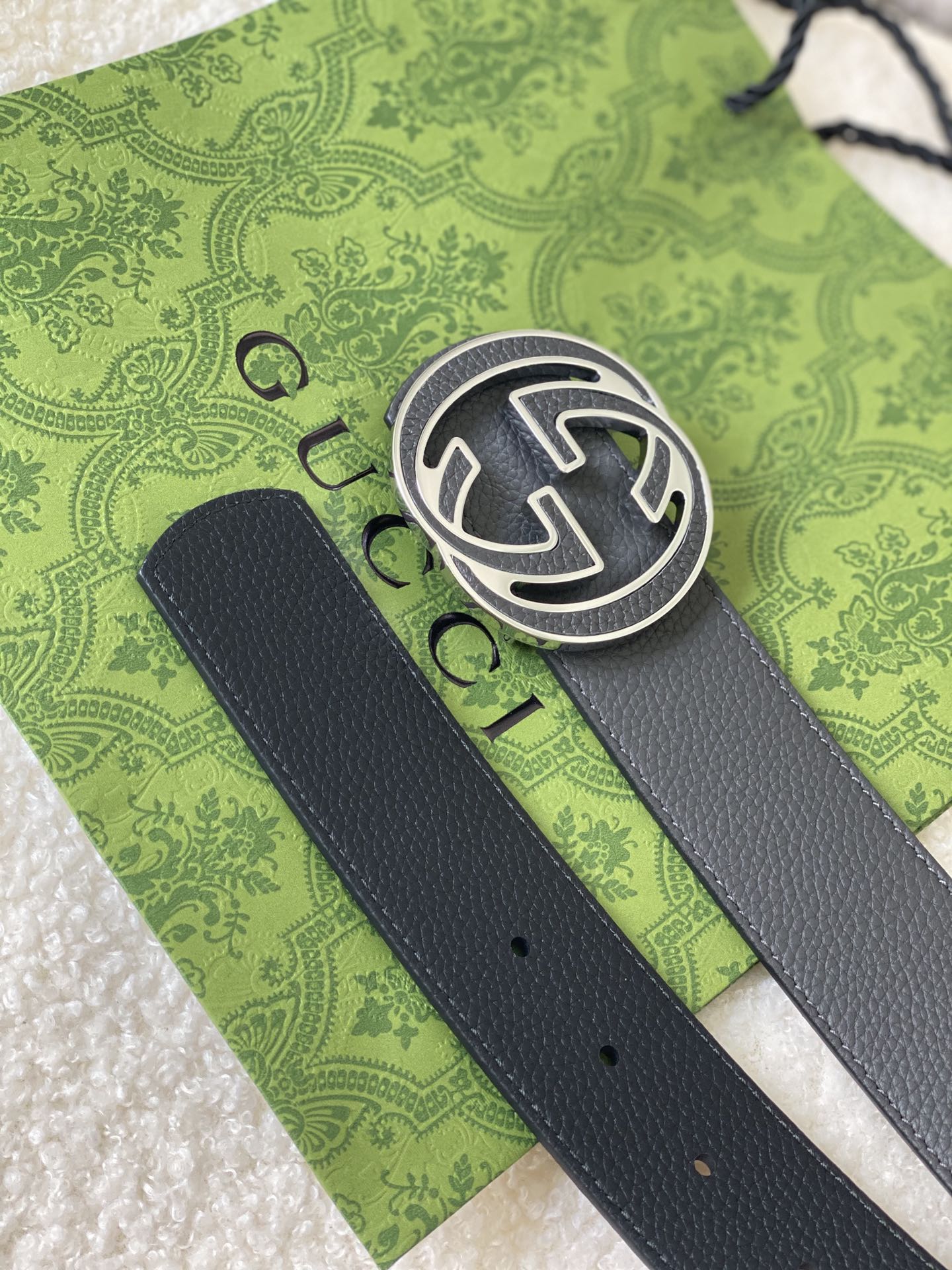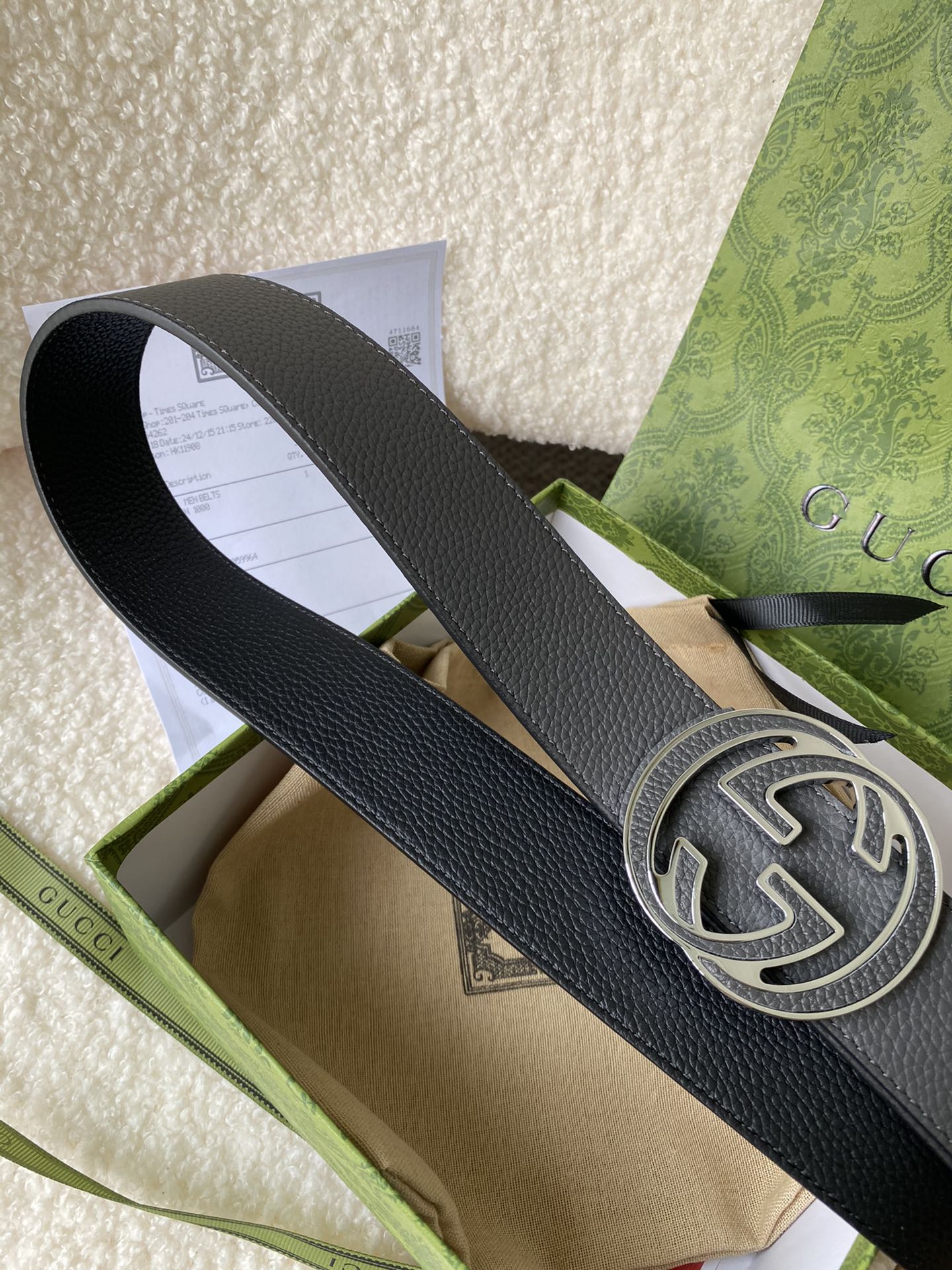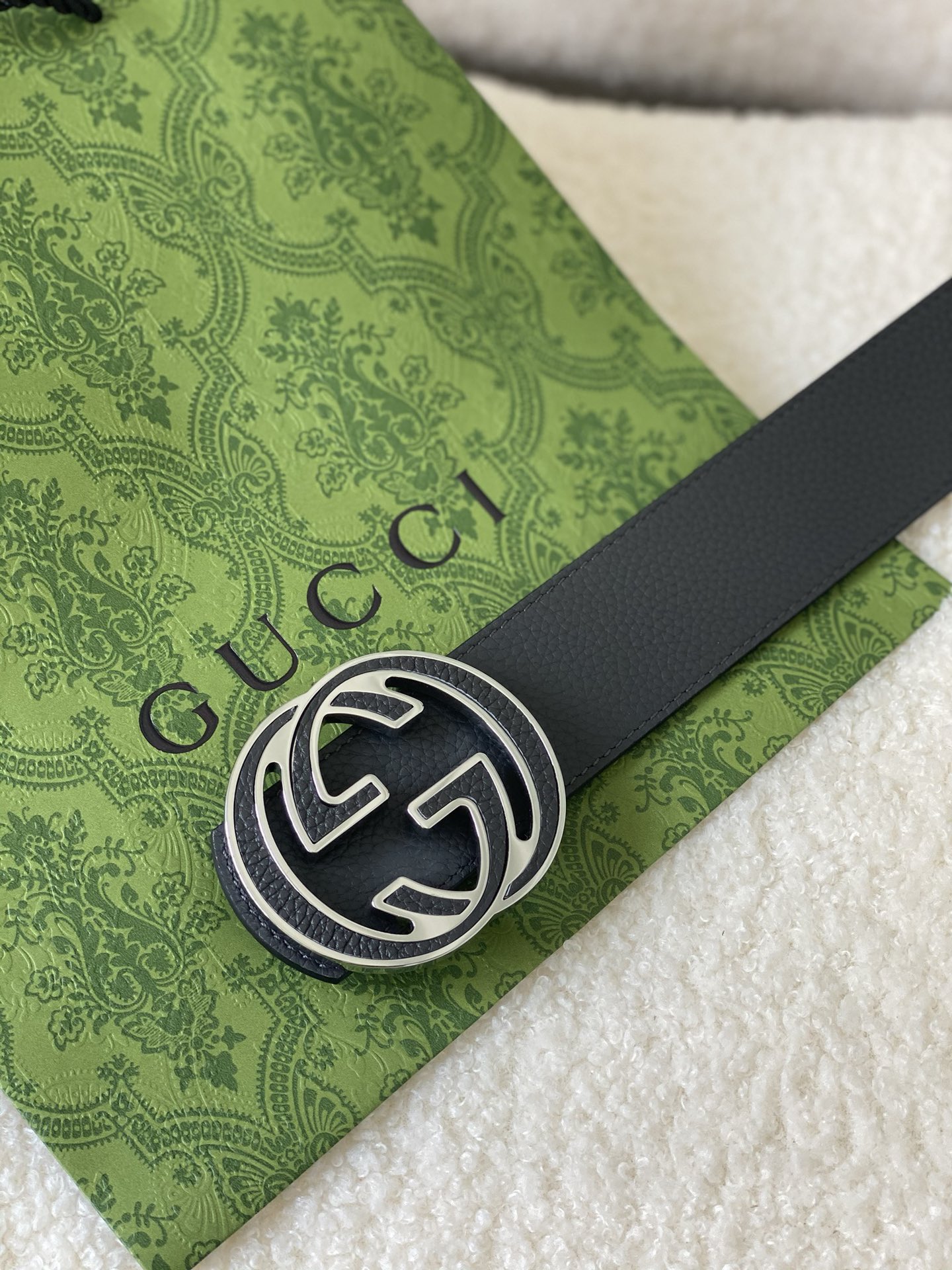 Gucci Double G Buckle Men's New Belt In-Store Synchronization Width 4 cm Strap Canvas Black Monogram - Imported Pebble Grain Black Combination Exquisite Vacuum Plated Double G Steel Buckle Double-Sided Usable