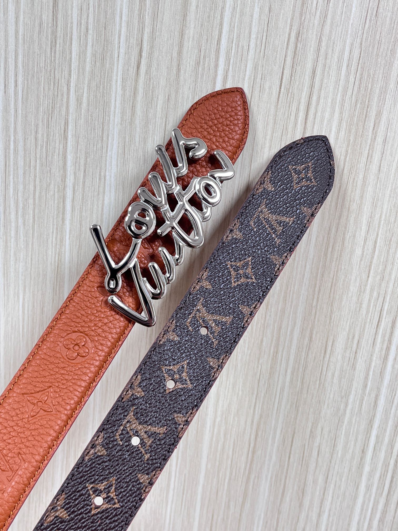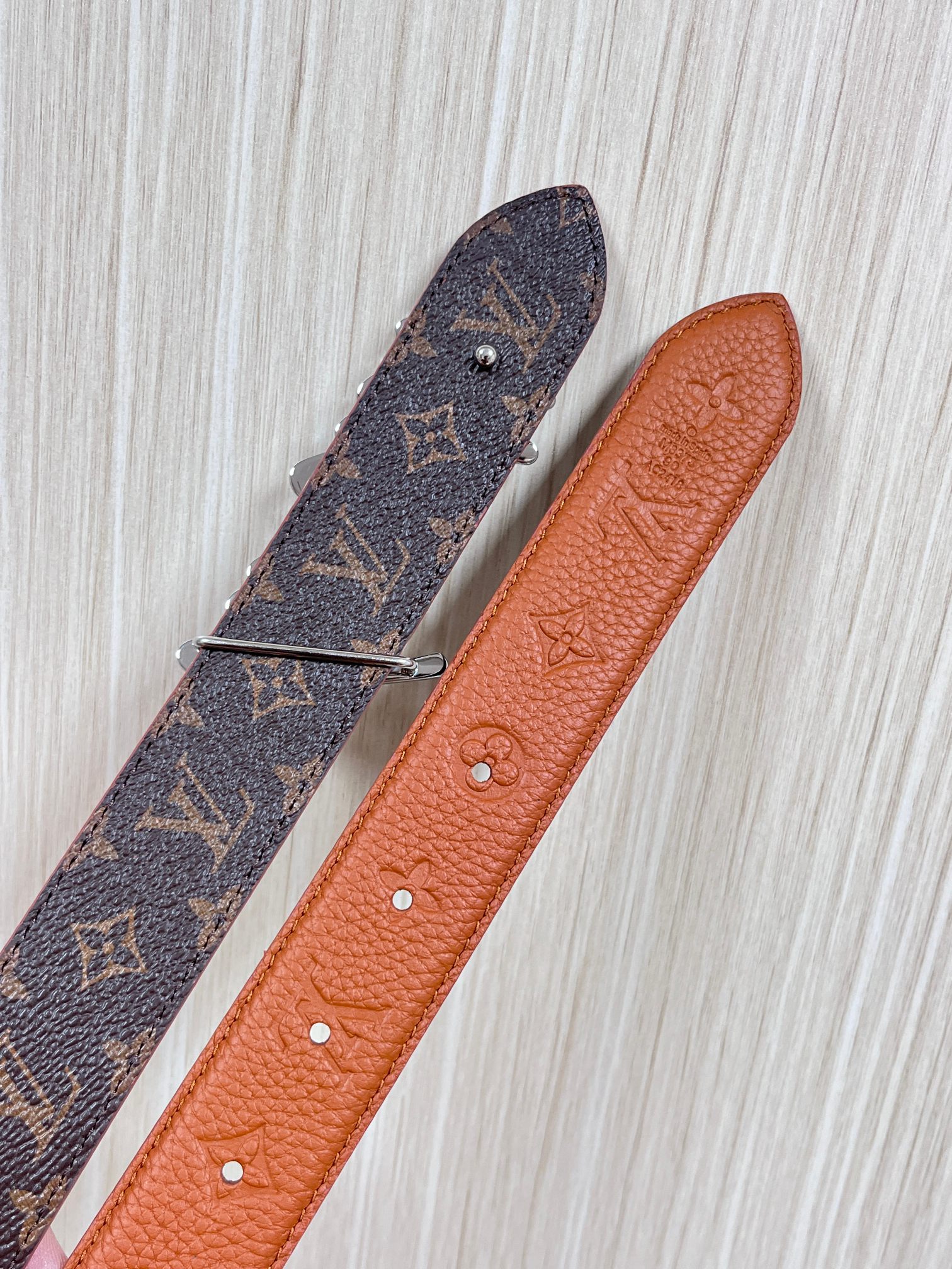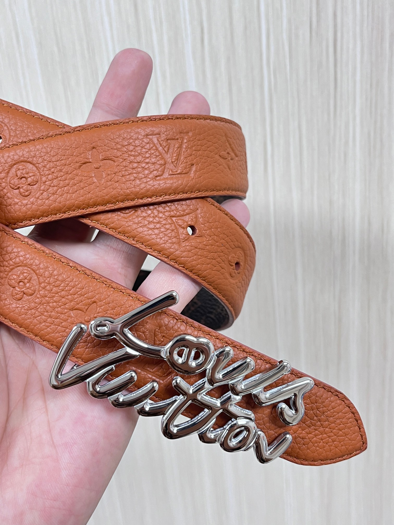 Seasonal new style, the belt is made of luxurious cowhide leather and Monogram canvas, allowing for easy switching between two styles. The Louis Vuitton handwritten logo transforms into a wide metal buckle, drawing focus at the center, and can add an elegant touch to both casual and formal looks. 3.0 wide iron wire buckle, one pointed and one square.