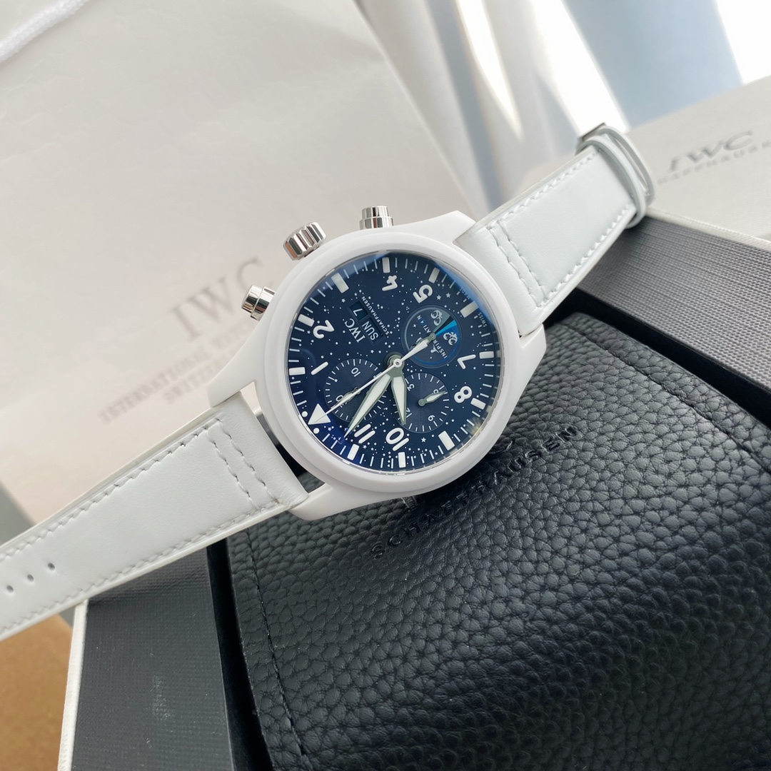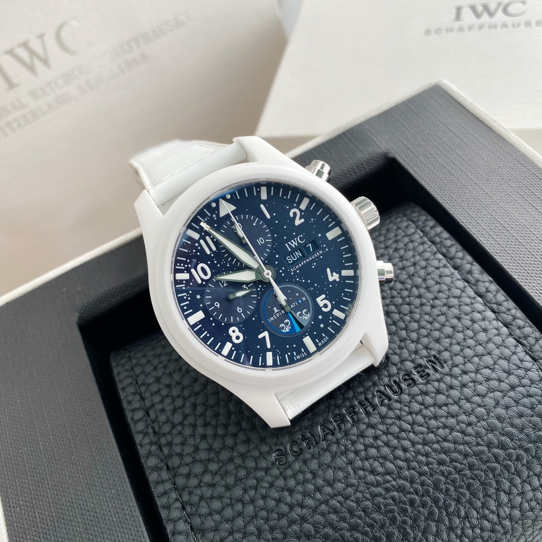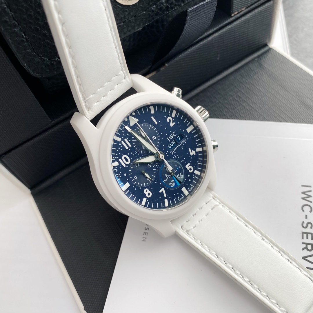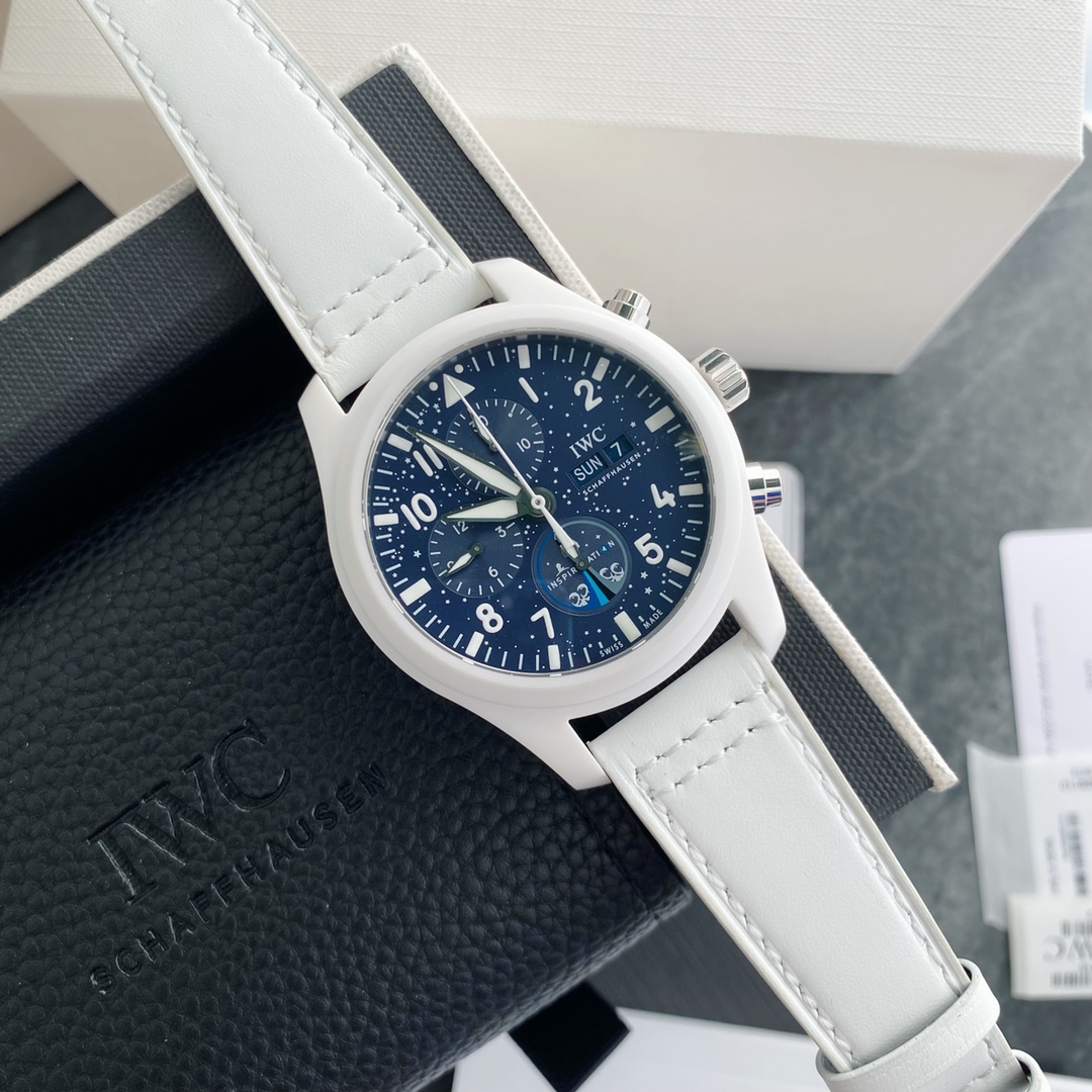New IWC Pilot's Series TOP GUN Navy Air Combat Force Chronograph Watch "Lake Tahoe" Special Edition. Features a large 44.5 mm case diameter, original Swiss ETA-7750 automatic mechanical movement, white ceramic with stainless steel buttons, and a ceramic-coated titanium case back. Paired with a white strap, the watch appears clean and fresh. The design inspiration comes from the enchanting winter landscape of the alpine lake, Lake Tahoe. The dial and hands incorporate a blue design, accentuated with white printed indices and luminous coating, creating a striking contrast with the pure white case. This visually eye-catching timepiece is suitable for a wide range of wearing occasions and user demographics.
