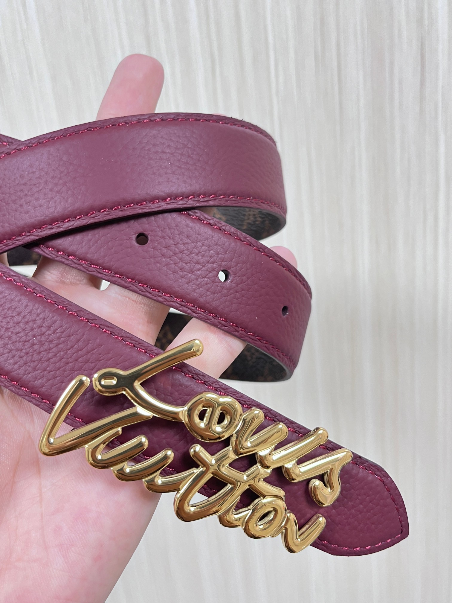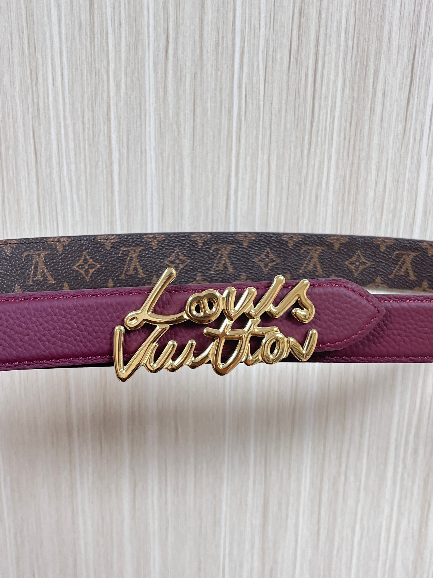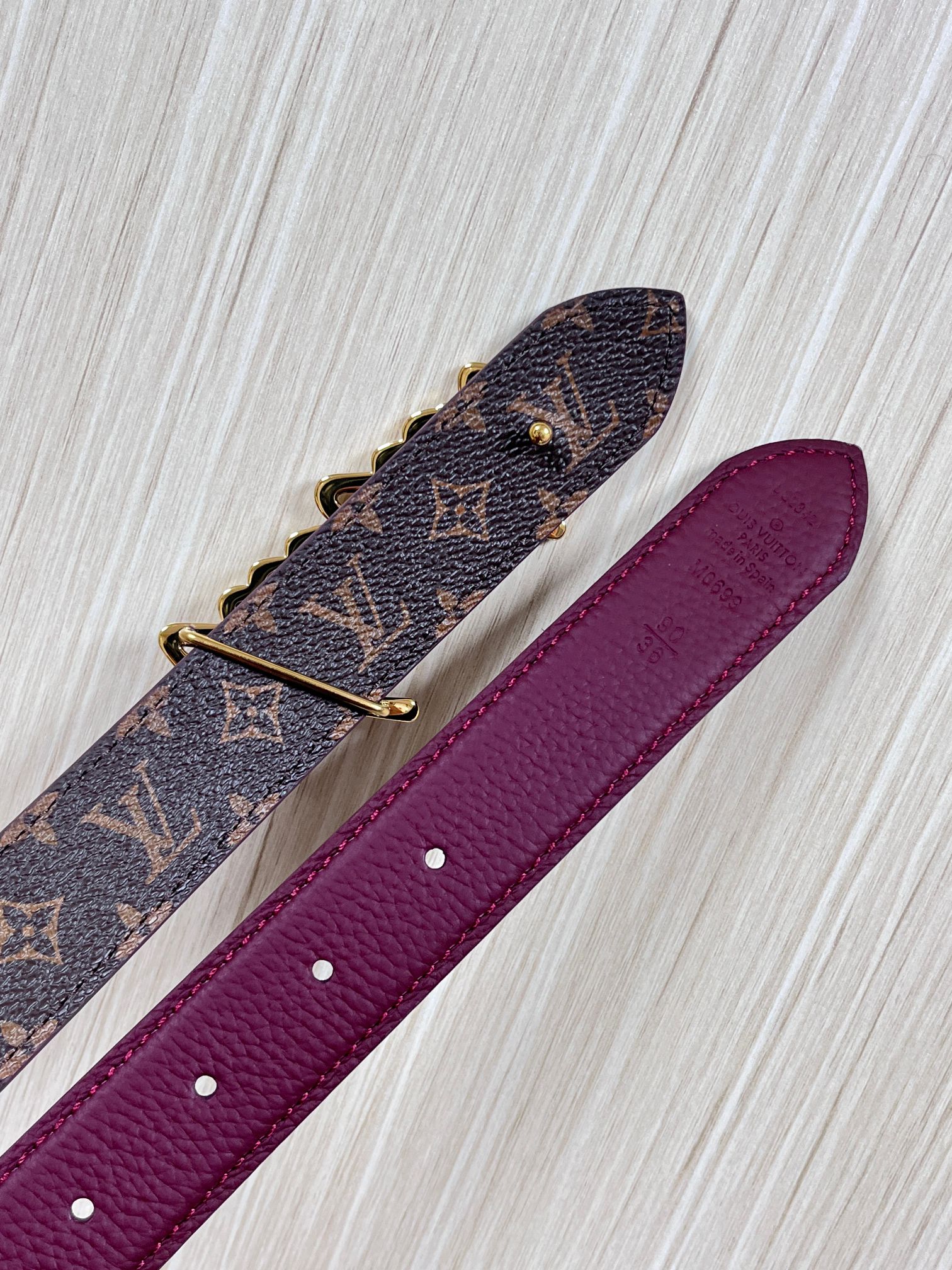 Season's new style, the belt is made of luxurious cowhide leather and Monogram canvas, allowing for easy switching between two styles. The Louis Vuitton handwritten logo transforms into a wide metal buckle, drawing focus at the center, and can add an elegant touch to both casual and formal looks. 3.0 wide wire buckle, one pointed and one square.