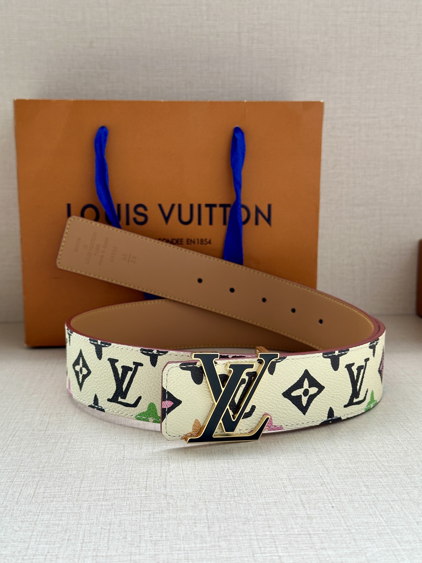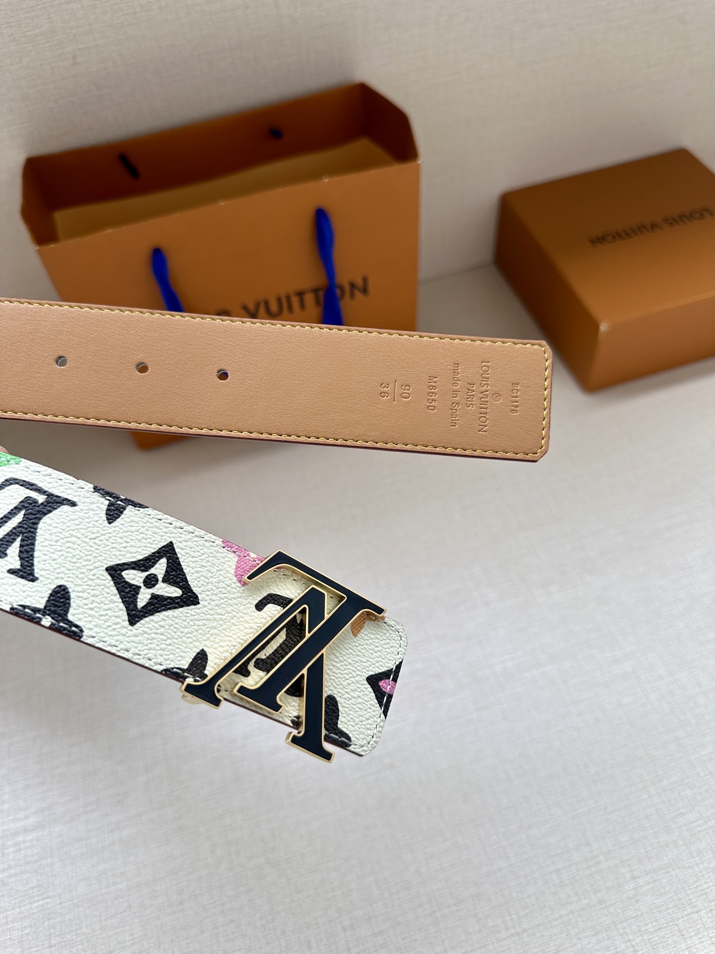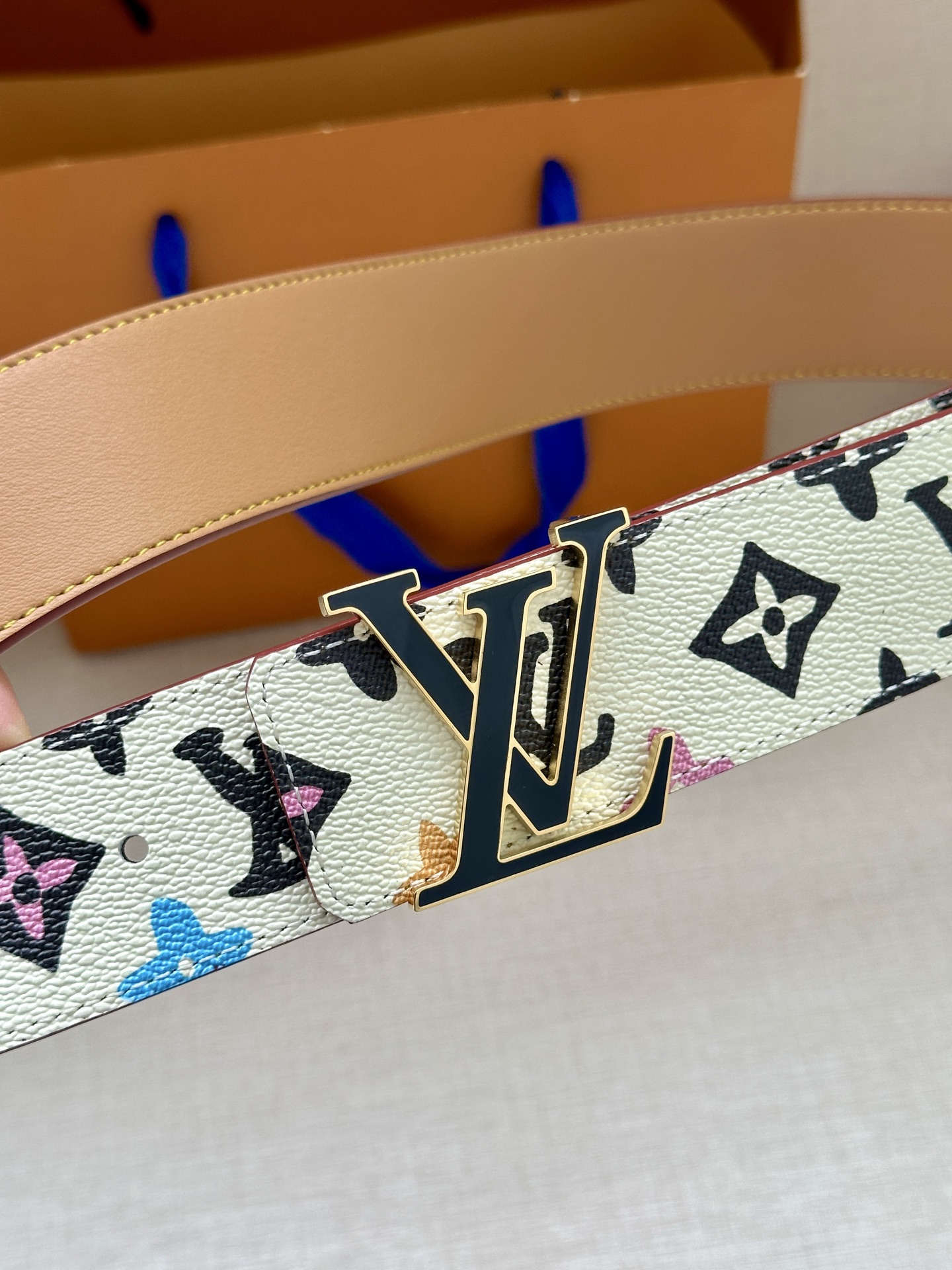 This 4.0 wide LV Tag reversible belt comes from the brand's collaboration series with Tyler, featuring a playful Monogram Craggy pattern on one side, and the Louis Vuitton logo embossed leather on the reverse. The LV Tag buckle upgrades the modern look.