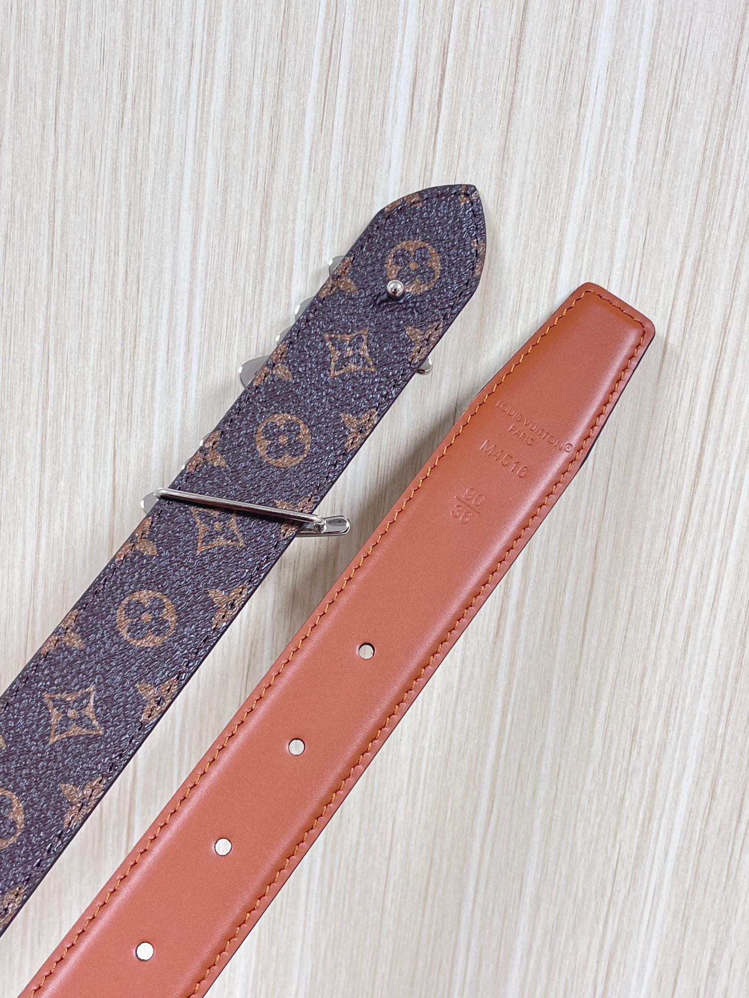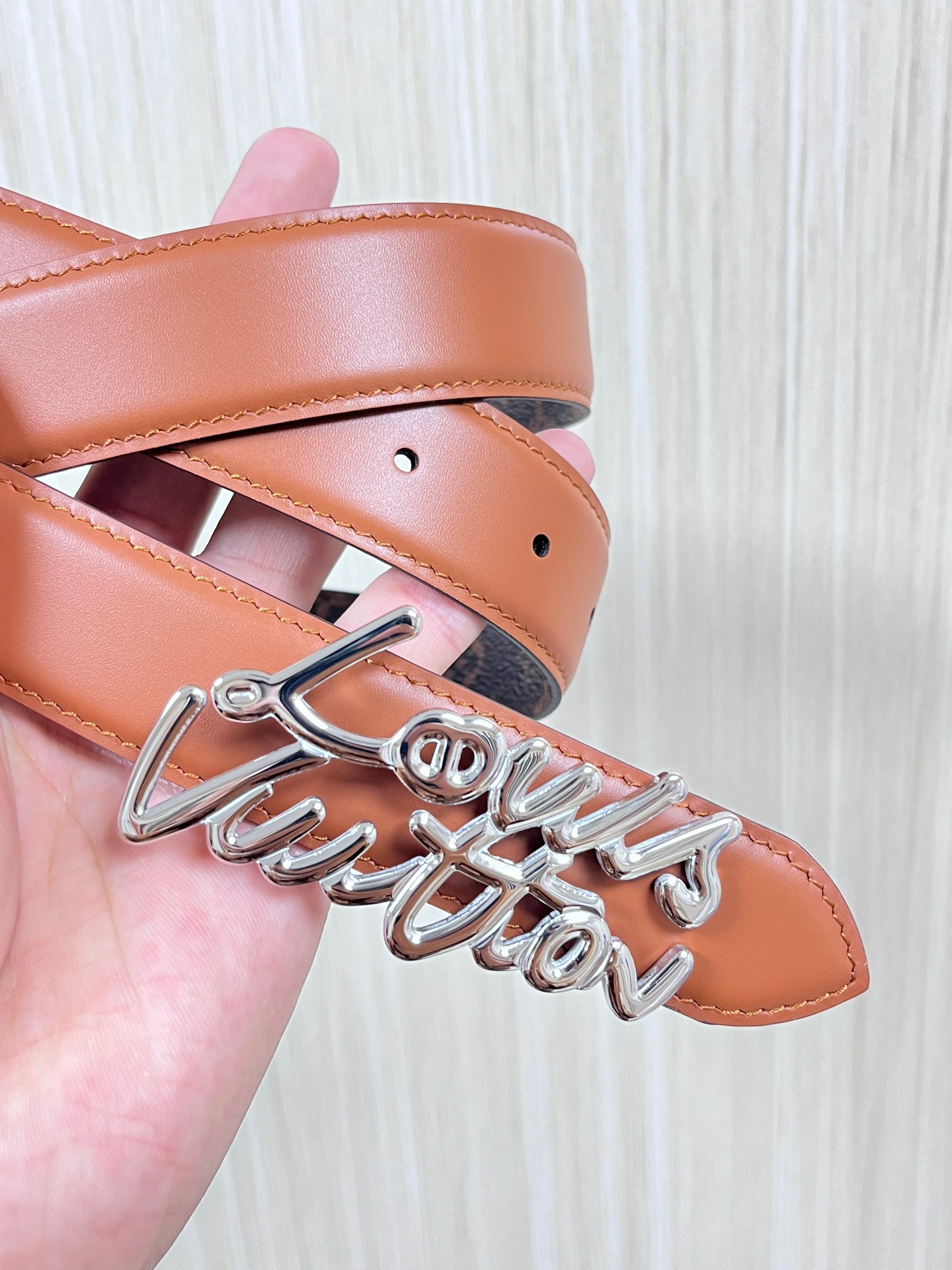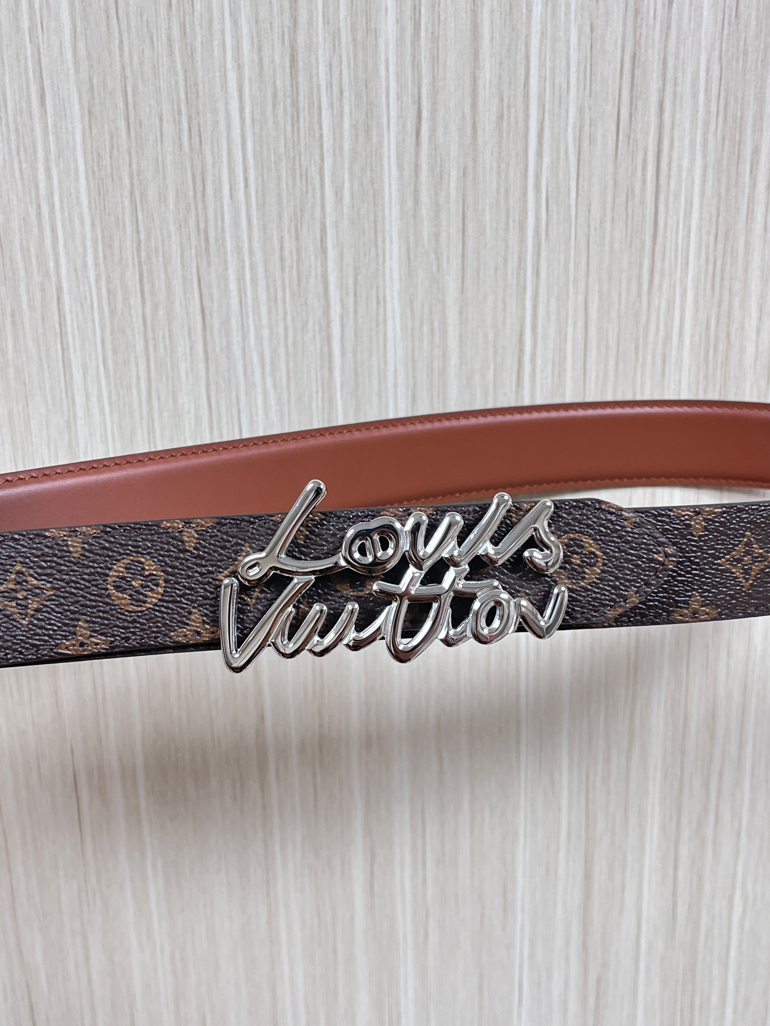 Season's new style, the belt is made from luxurious cowhide leather and Monogram canvas, allowing for easy switching between two styles. The Louis Vuitton handwritten logo transforms into a wide metal buckle, drawing focus at the center, and can add an elegant touch to both casual and formal looks. 3.0 wide wire buckle, tan calfskin, one pointed and one square.
