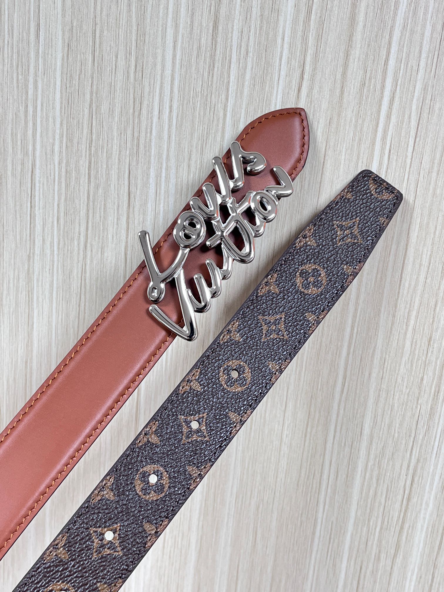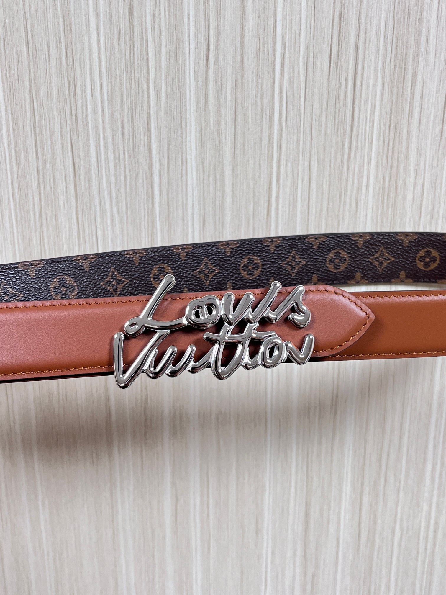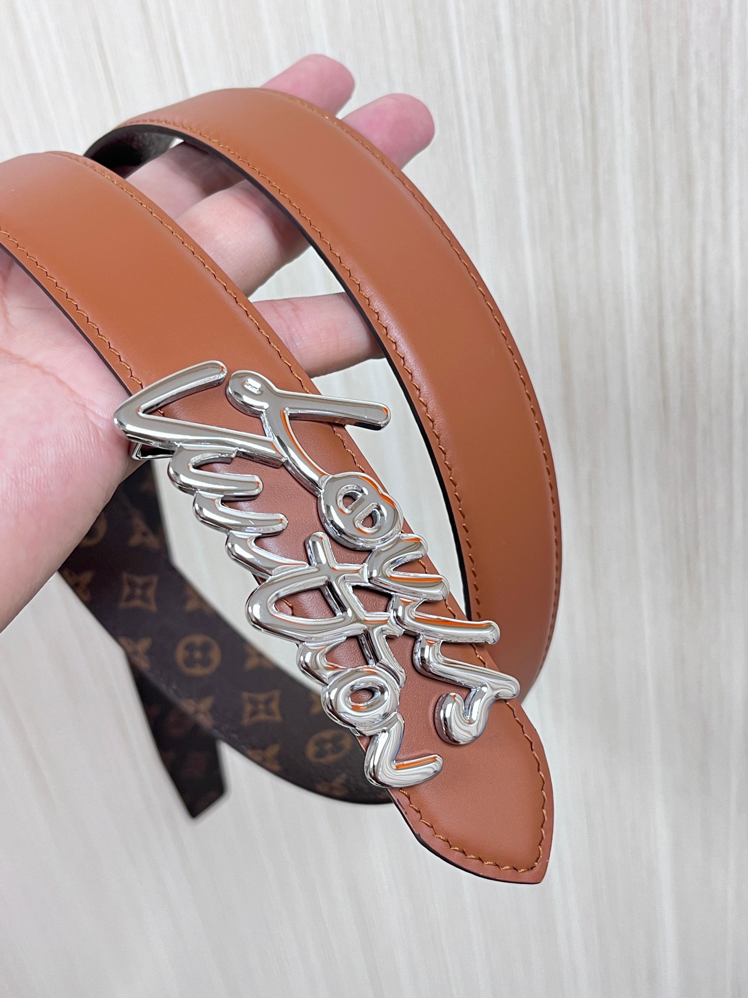 Season's new style, the belt is made from luxurious cowhide leather and Monogram canvas, allowing for easy switching between two styles. The Louis Vuitton handwritten logo transforms into a wide metal buckle, drawing focus at the center, and can add an elegant touch to both casual and formal looks. 3.0 wide wire buckle, tan calfskin, one pointed and one square.