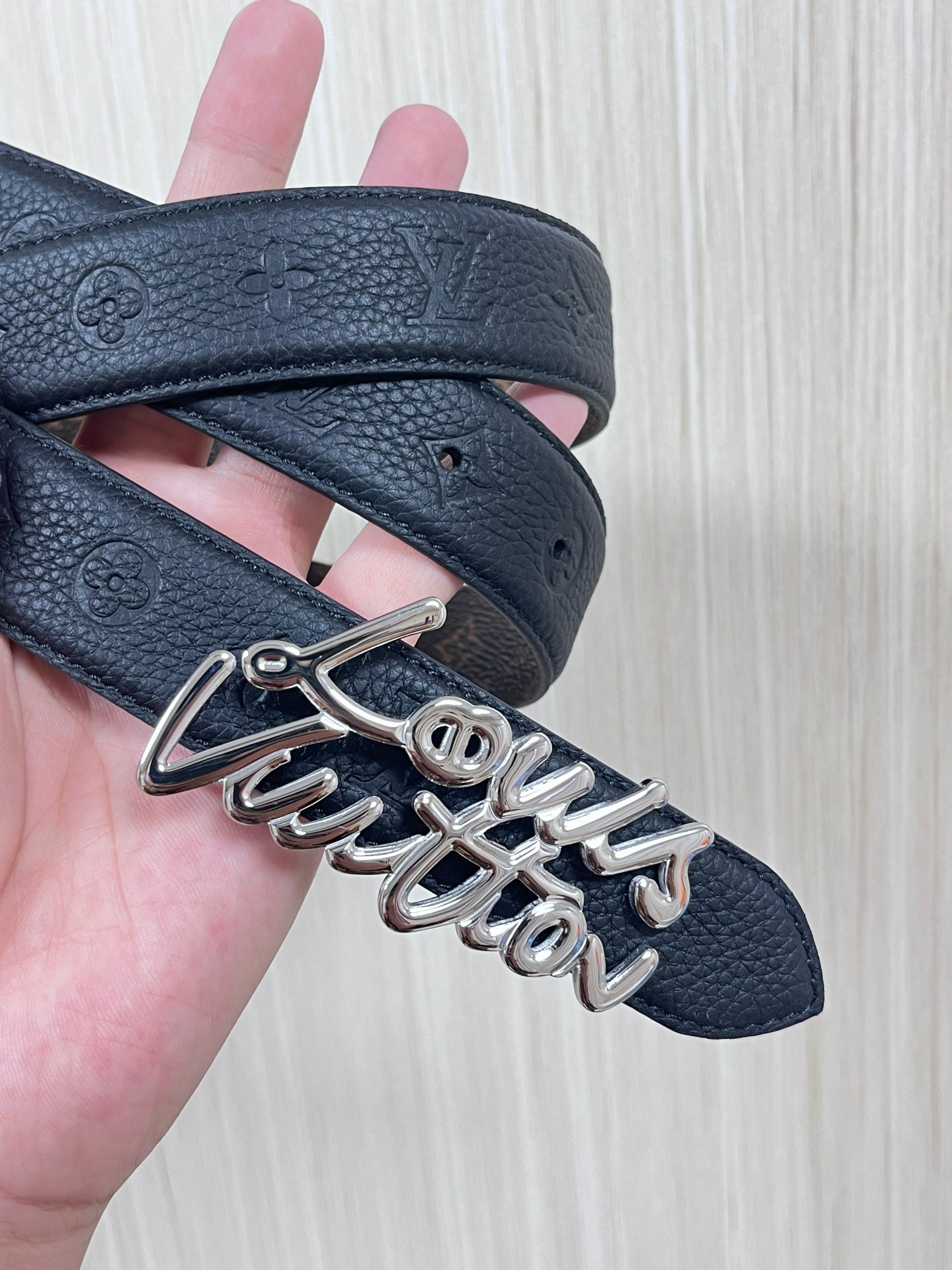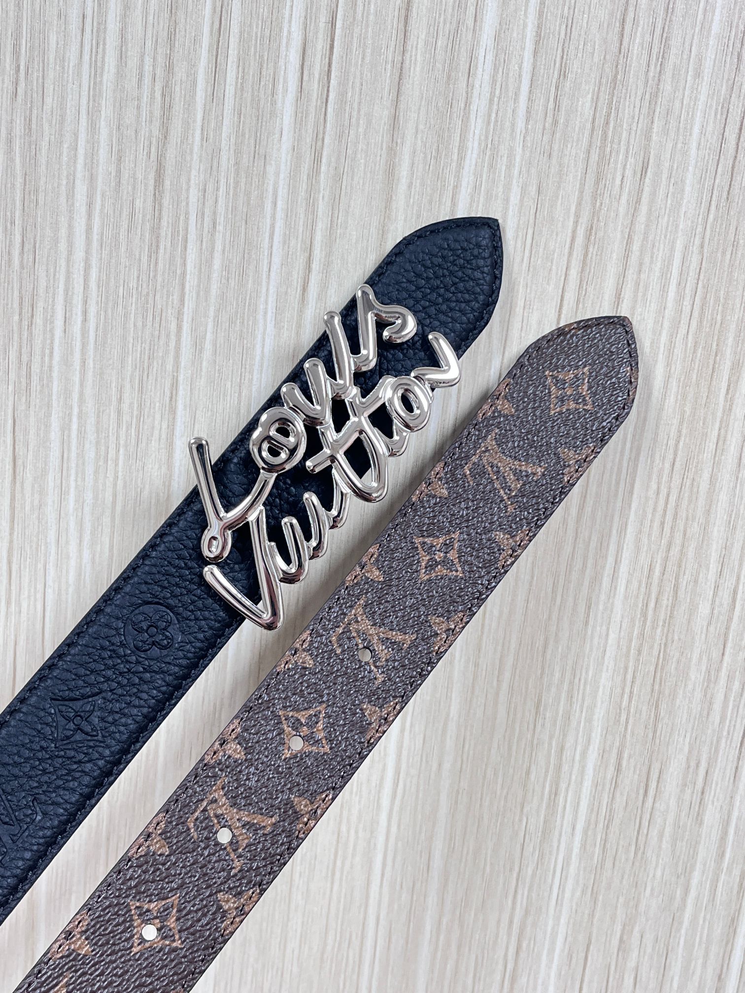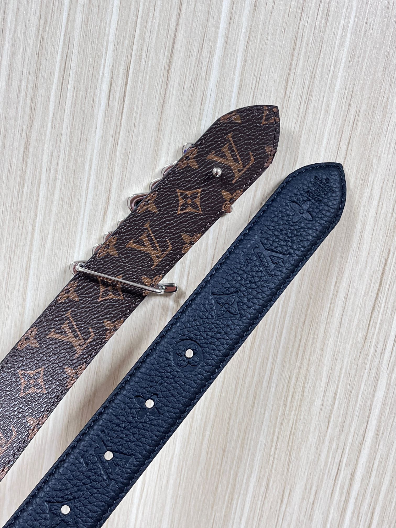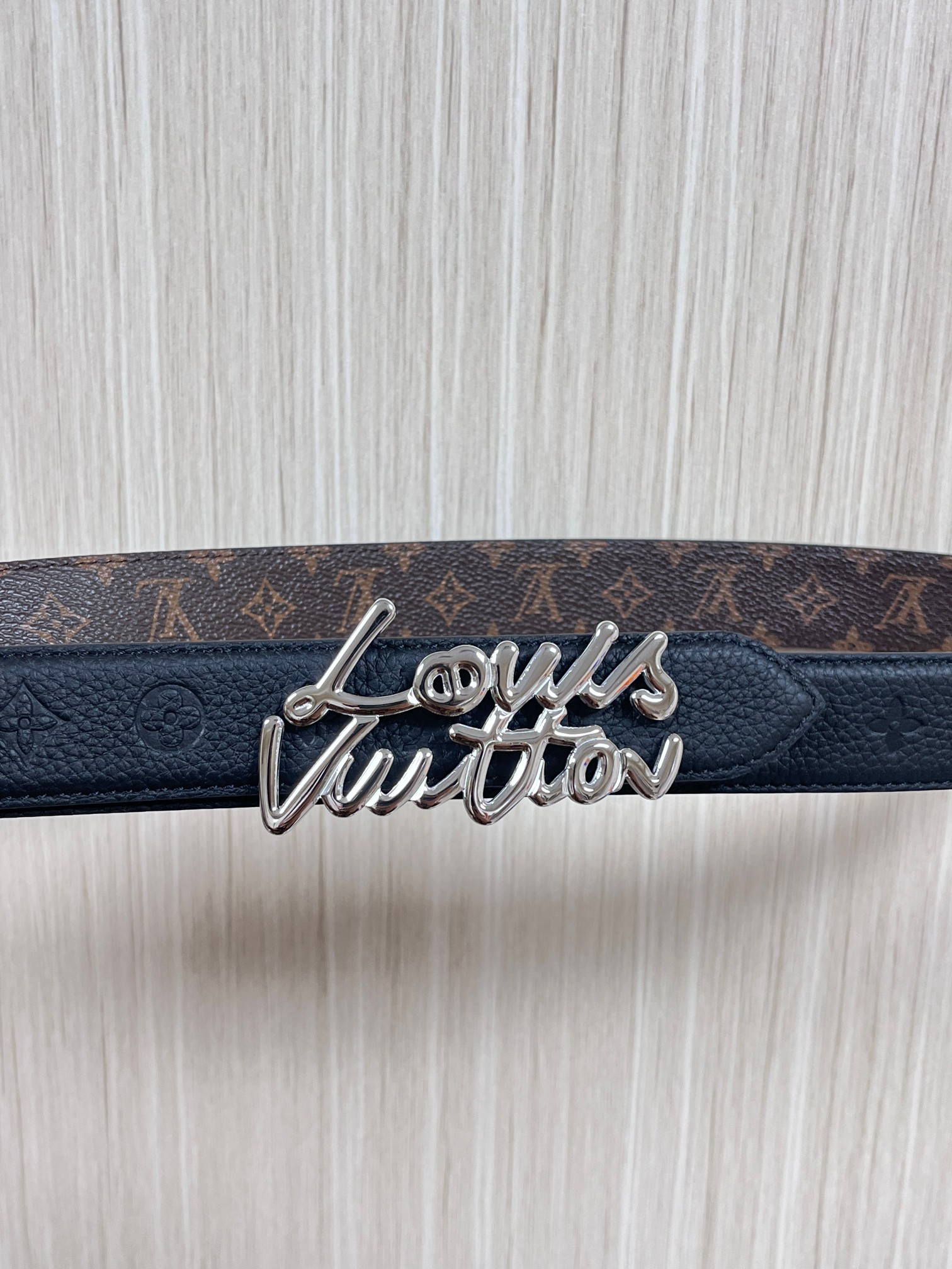 Seasonal new style, the belt is made of luxurious cowhide leather and Monogram canvas, allowing for easy switching between two styles. The Louis Vuitton handwritten logo transforms into a wide metal buckle, drawing focus at the center, and can add an elegant touch to both casual and formal looks. 3.0 wide iron wire buckle, one pointed and one square.