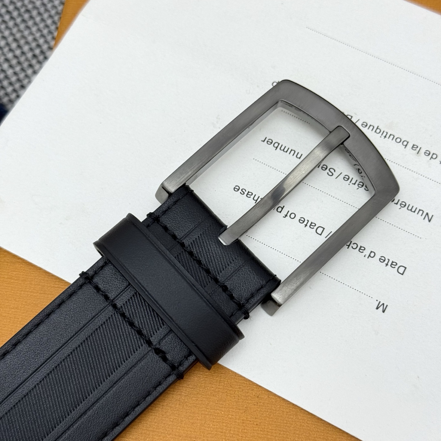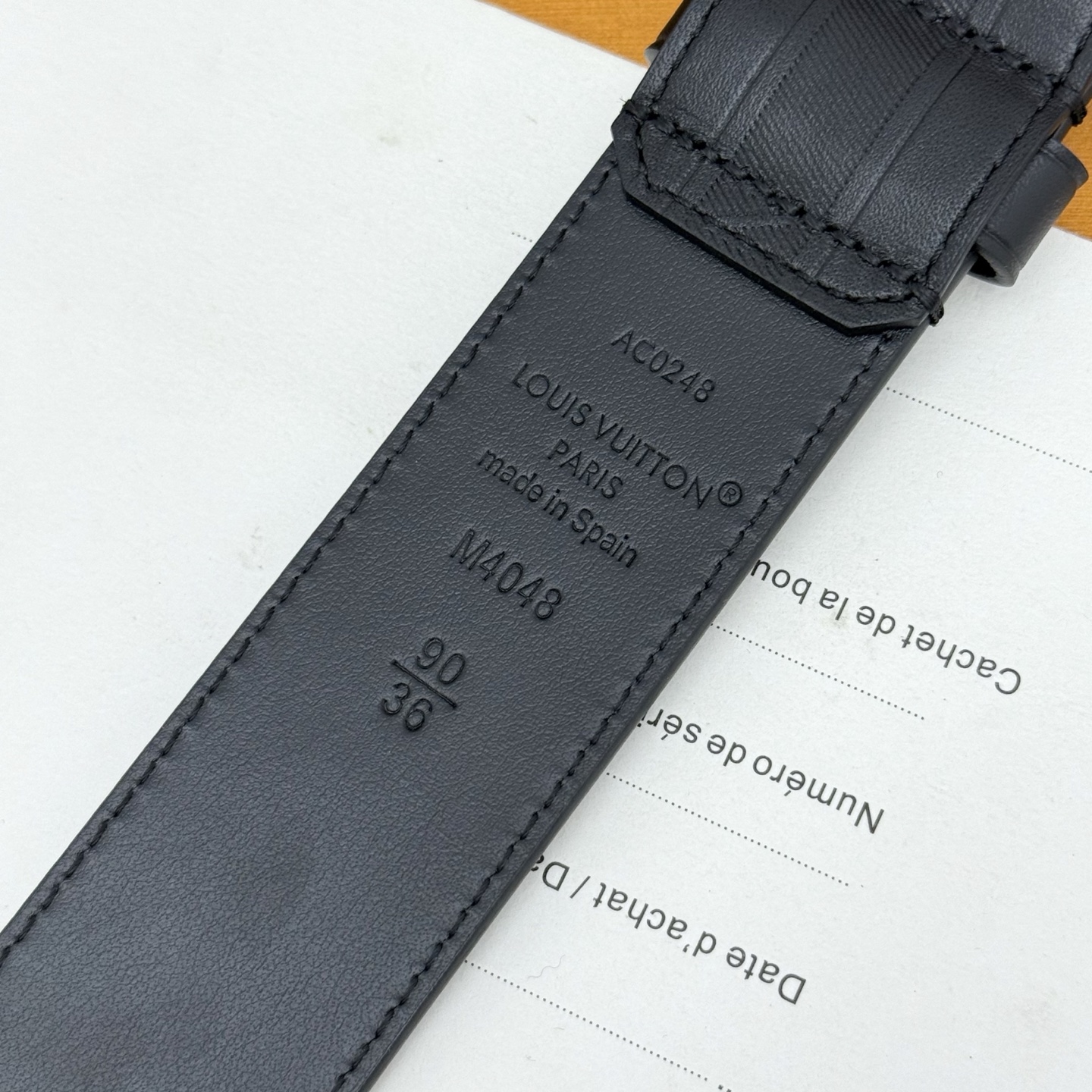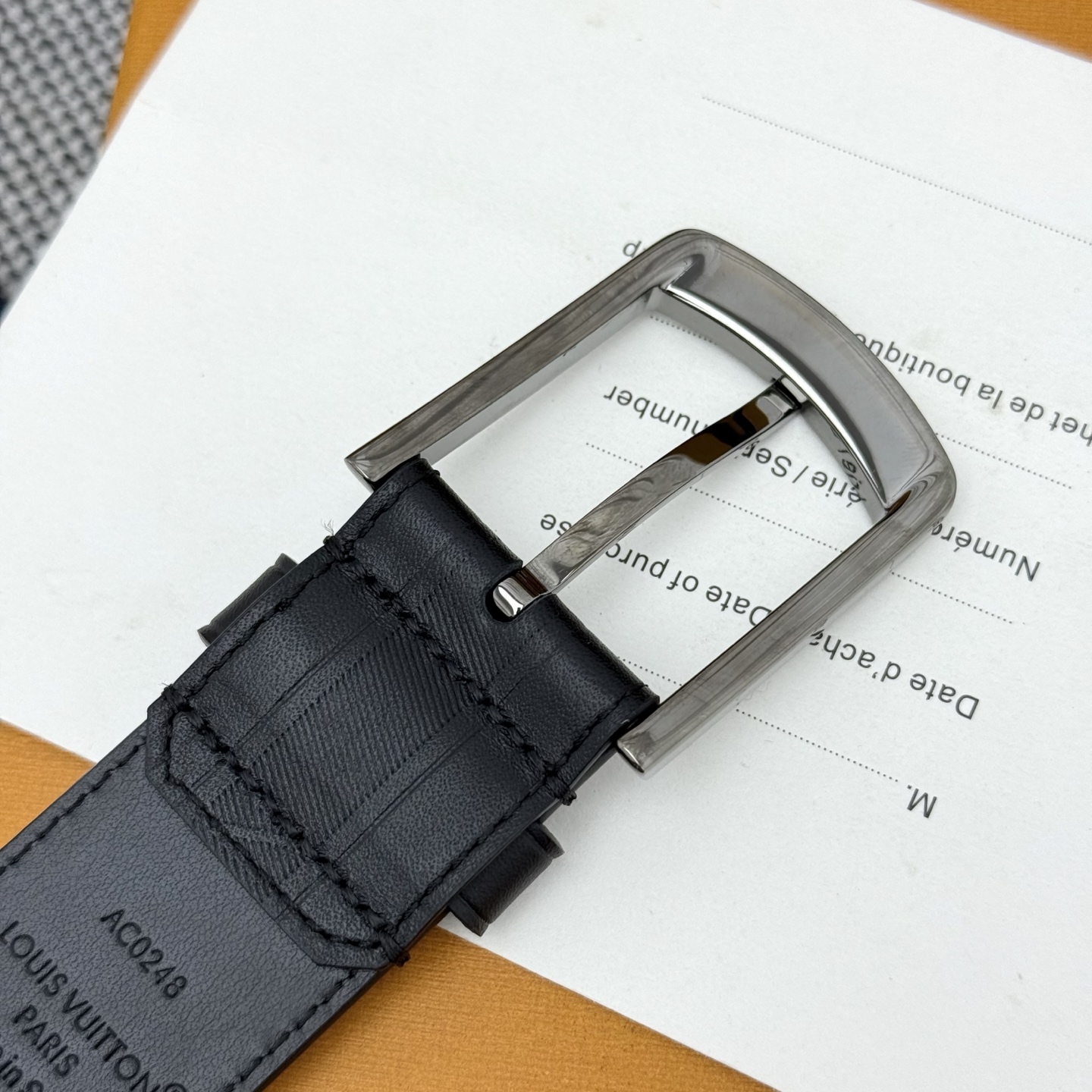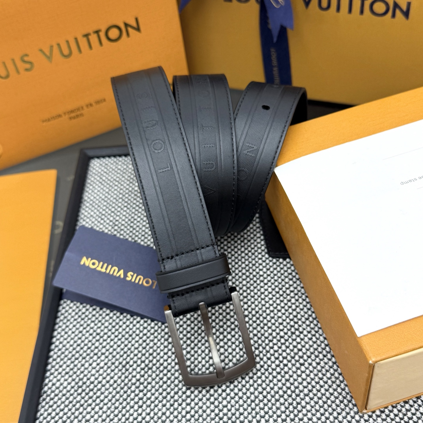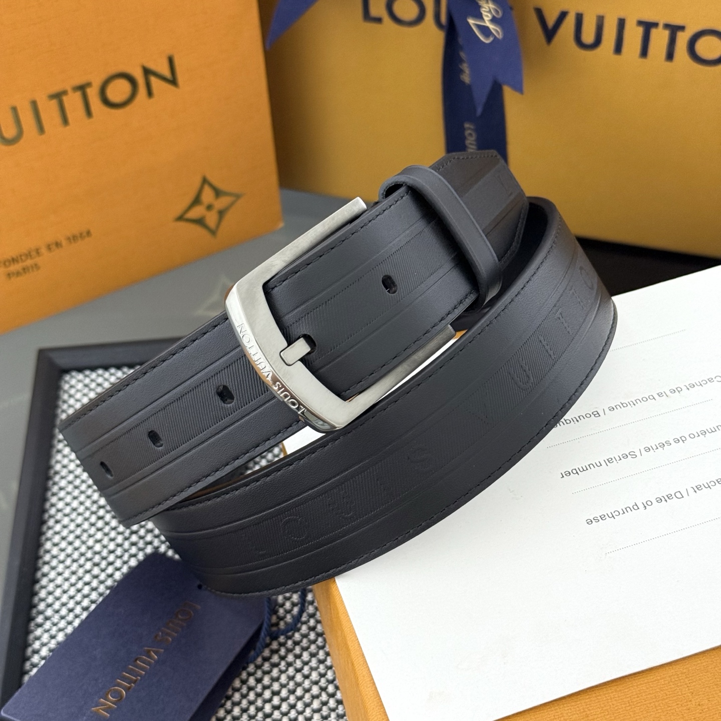 Heritage Italian original factory leather belt is made of grained and smooth leather, showcasing an elegant style with a brushed metal curved buckle. An LV pin adorns the end, making it suitable for formal attire. Width: 3.5cm