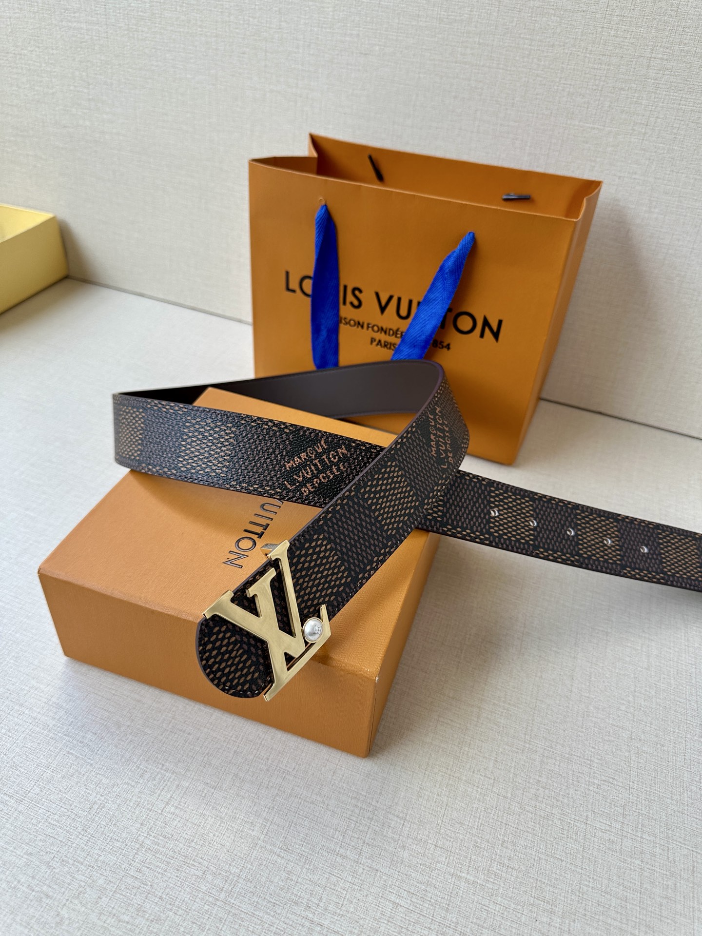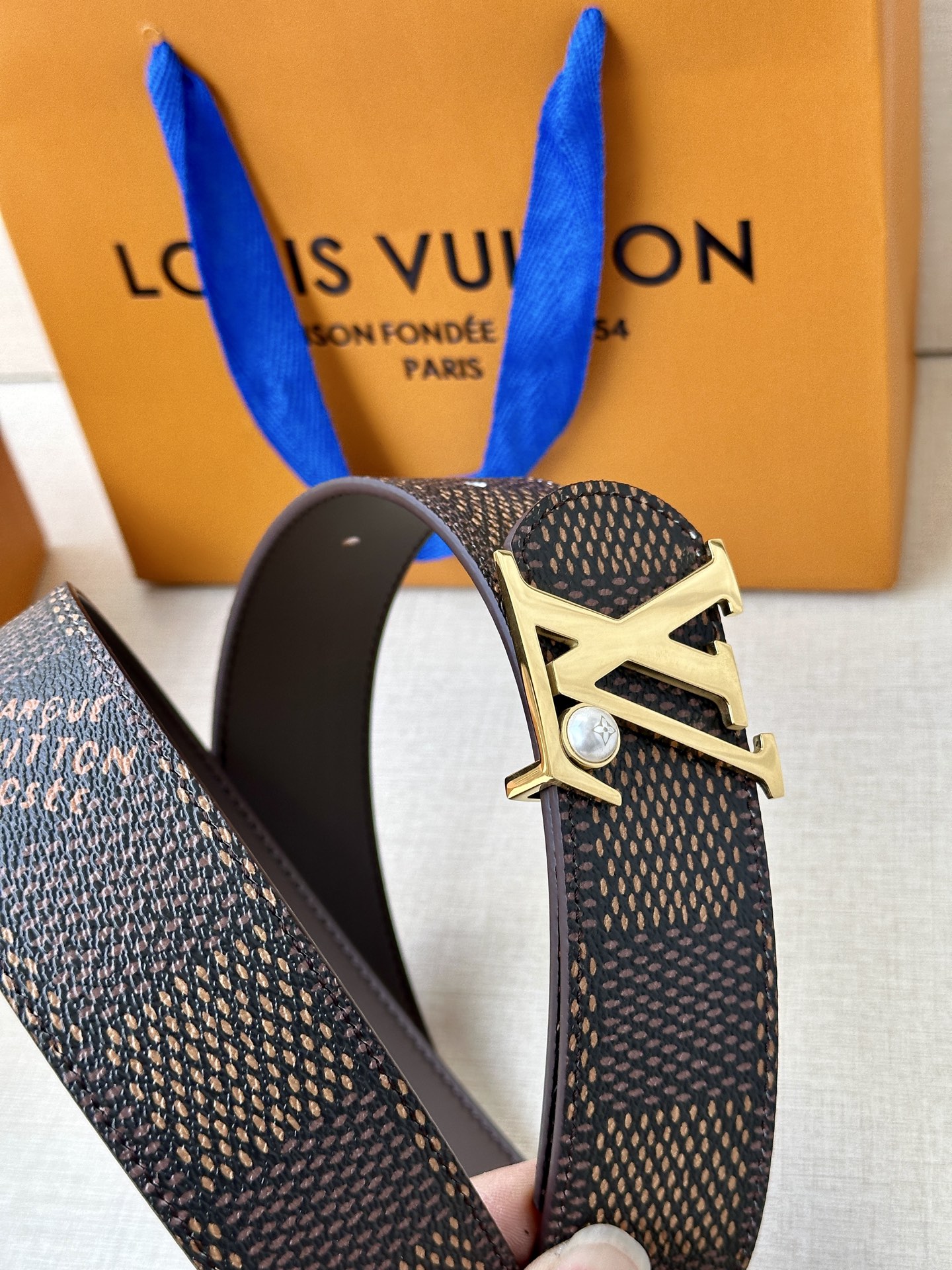 Home • Belt • This LV Damier 40mm reversible belt features classic style, dark leather, and an elegant buckle. It's versatile and well-crafted.