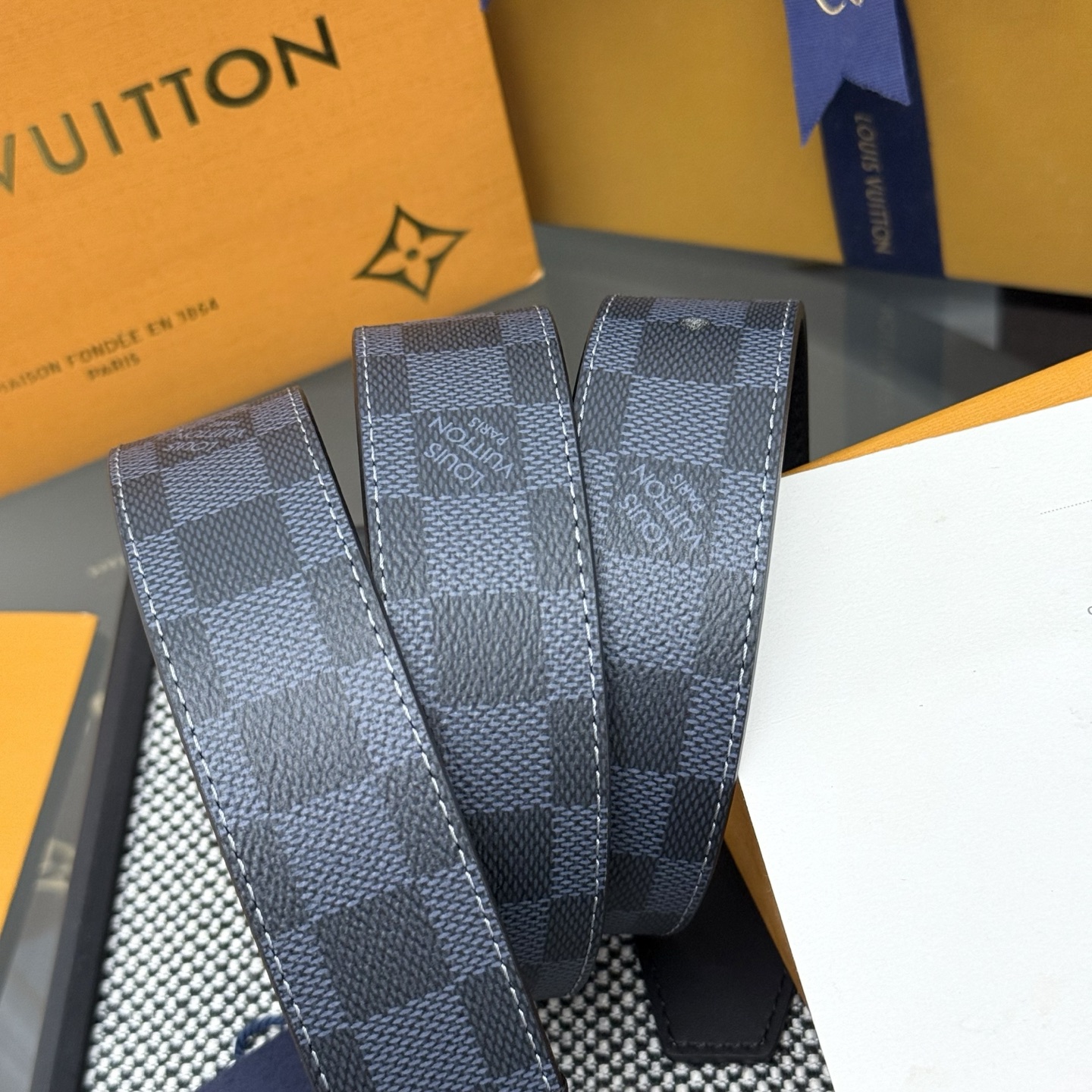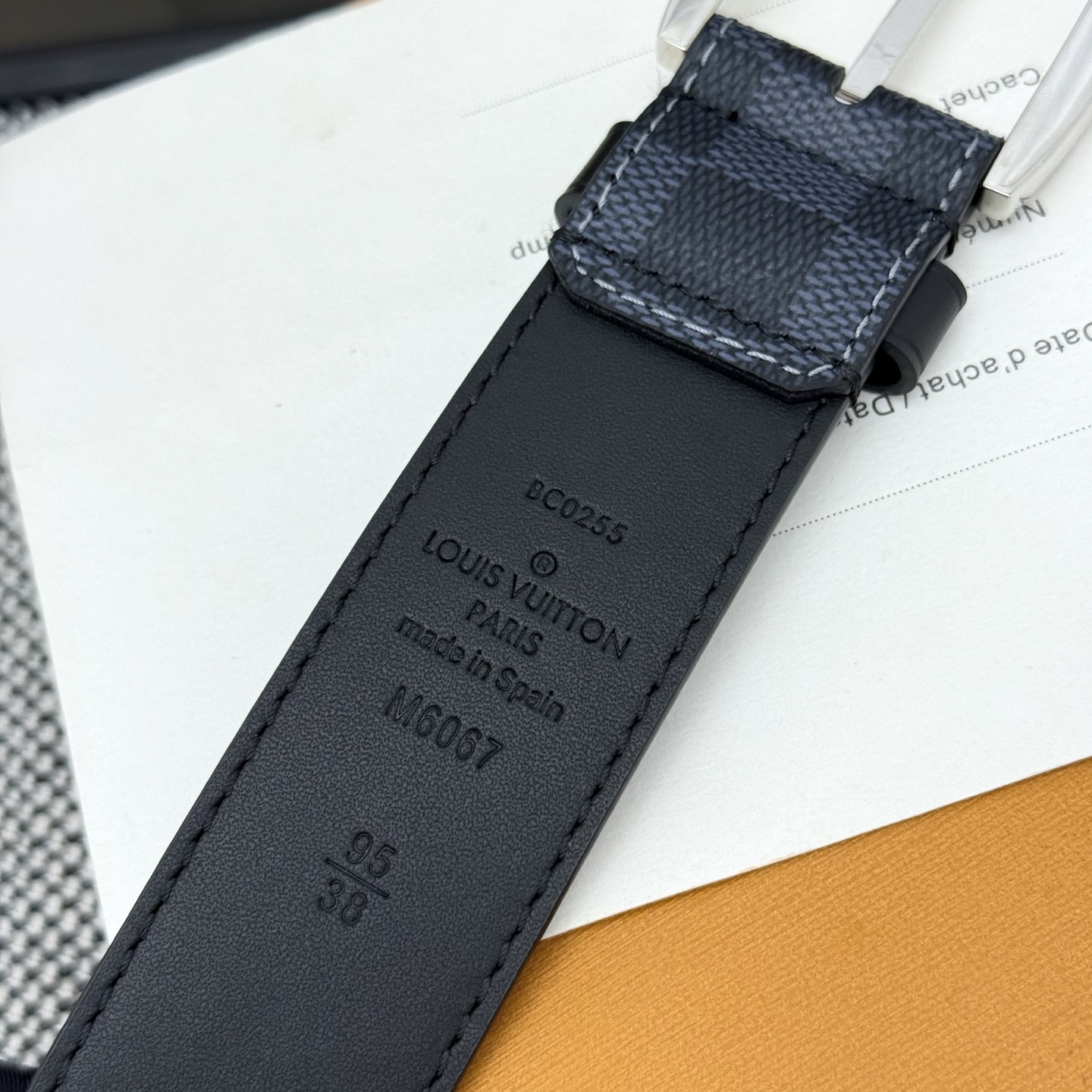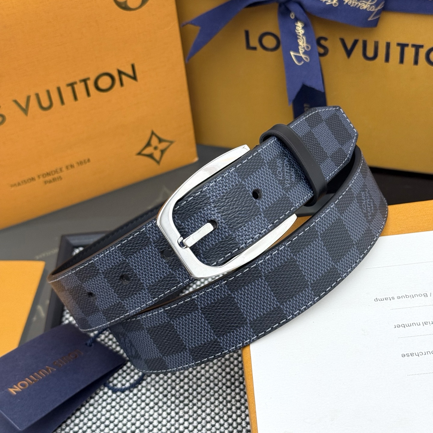 Heritage Italian original factory leather belt. The belt is made of grained and smooth leather, featuring a brushed metal curved buckle that highlights an elegant style. An LV decorative pin adorns the end, making it suitable for pairing with formal attire. Width: 3.5cm